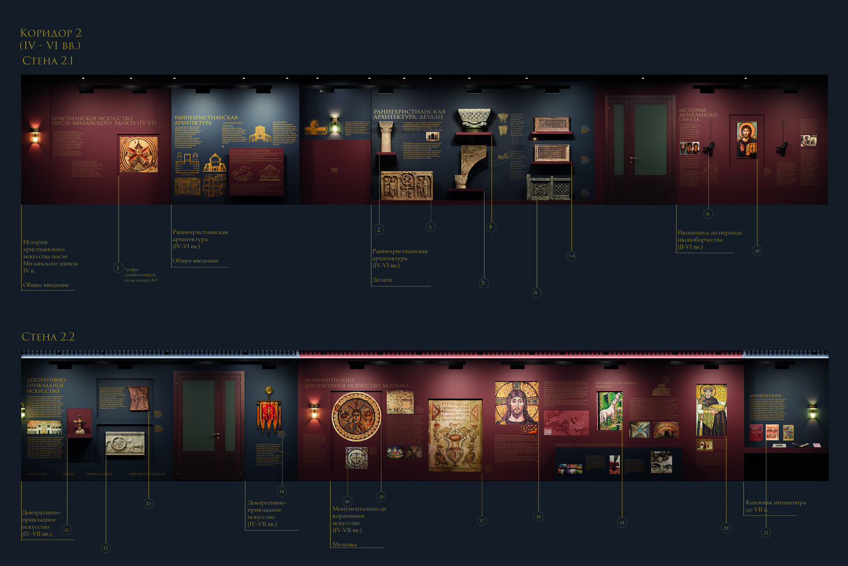 Экспозиция коридора посвящена становлению и развитию раннехристианской архитектуры, декоративно-прикладных и монументально-декоративных видов искусства. Отдельными блоками вынесены темы становления и развития иконописного образа и христианской миниатюры.