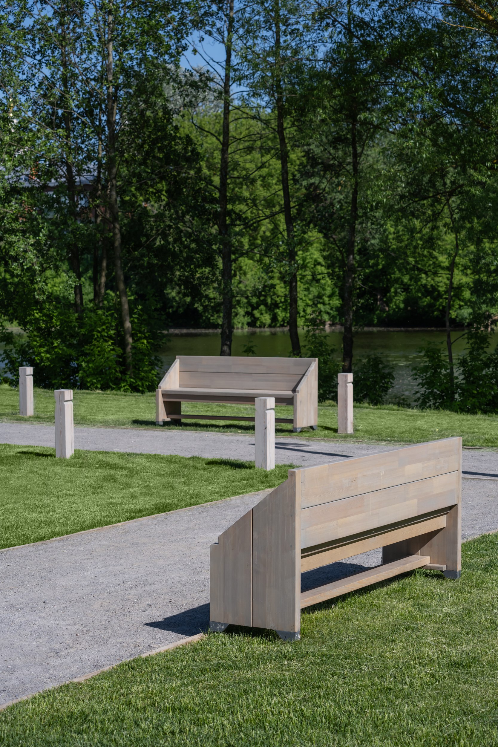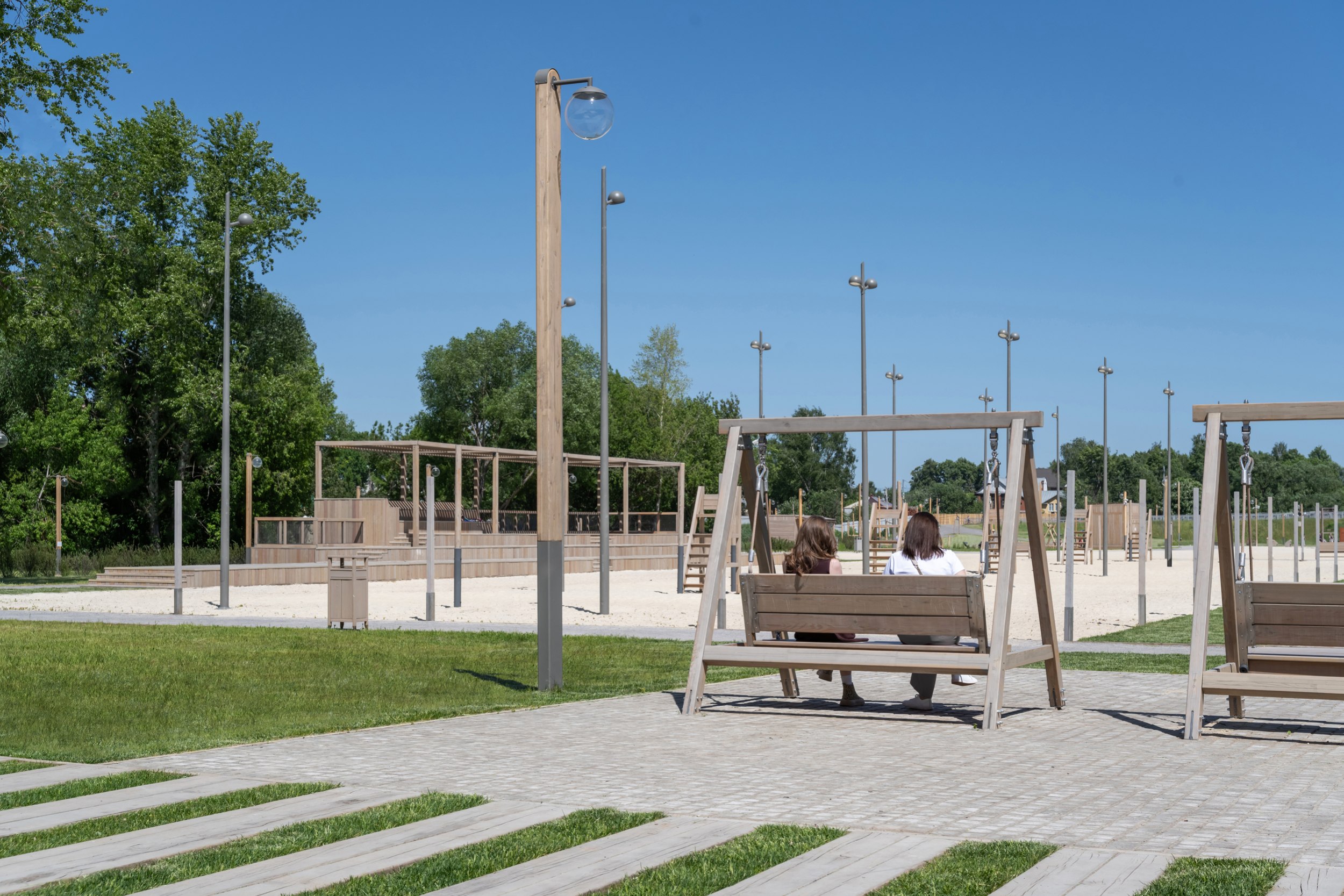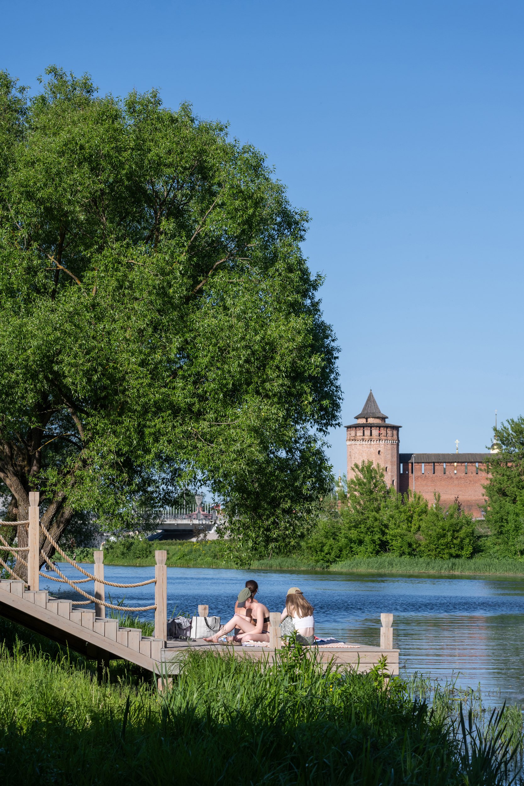 Важной частью наполнения набережной стали пирсы, разработанные в двух вариантах: для активных видов спорта и для тихого отдыха. Малые архитектурные формы были созданы преимущественно из древесины по принципу стилизации и упрощения форм традиционной русской мебели. Например, некоторые кресла и лавки имеют поворотные спинки, позволяющие выбрать удобную сторону для обзора. Навигация выполнена из светлого дерева и вырезана на специальных столярных станках, что отсылает к русскому деревянному зодчеству. Форма фонарей была разработана нашей командой специально для Коломны и выполнена из натурального дерева, что является редкостью для общественных пространств. В проекте используется редкое покрытие в виде деревянной брусчатки. В процессе работы мы подобрали решение, которое позволило расположить деревянные бруски на равном расстоянии для создания четкой герметичности в покрытии.