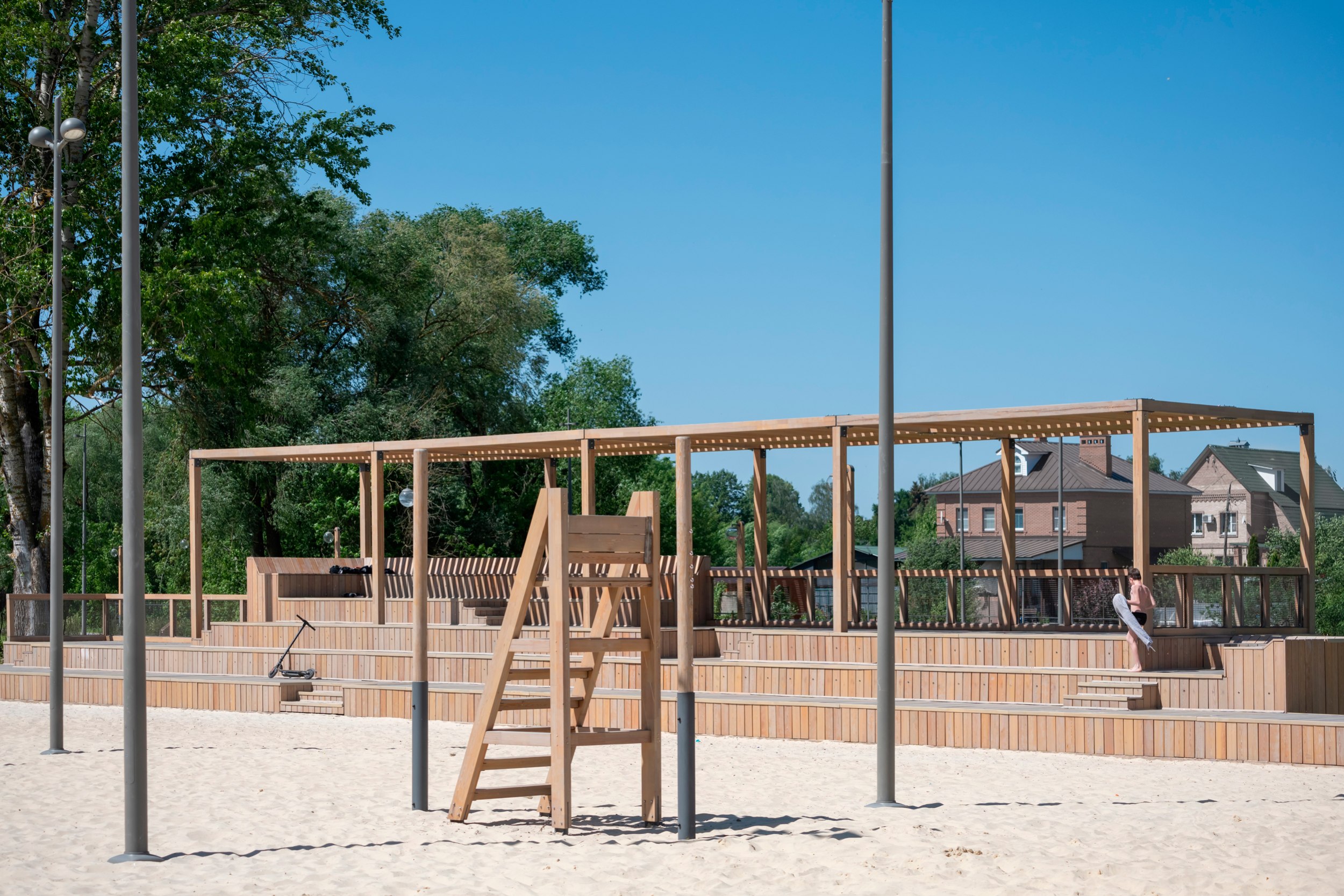Зона отдыха на берегу реки Коломенка. Зона пляжного волейбола с амфитеатром