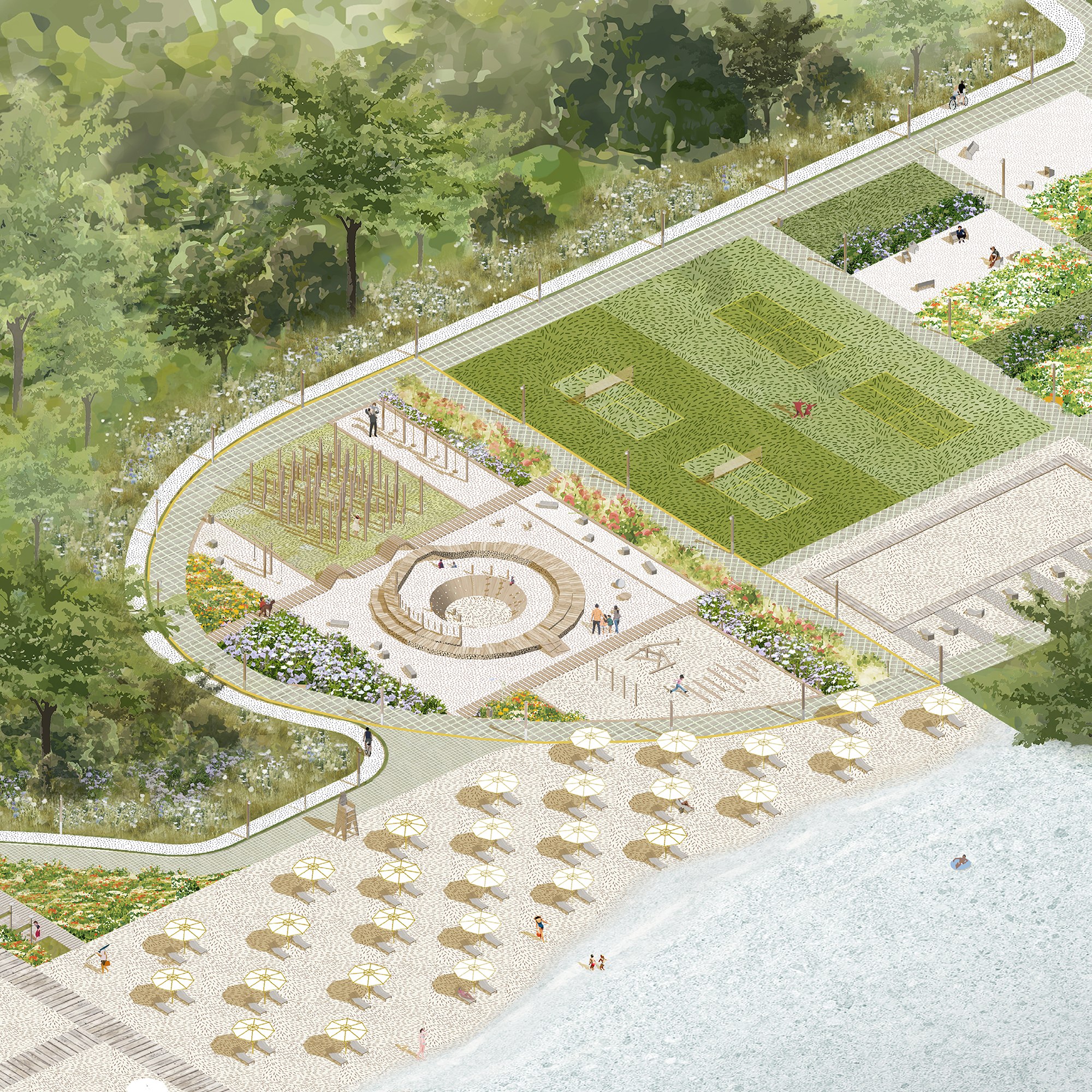 Пляжная зона, активно используемая любителями вейк-спорта и пляжного волейбола, получила особое внимание в процессе проработки.