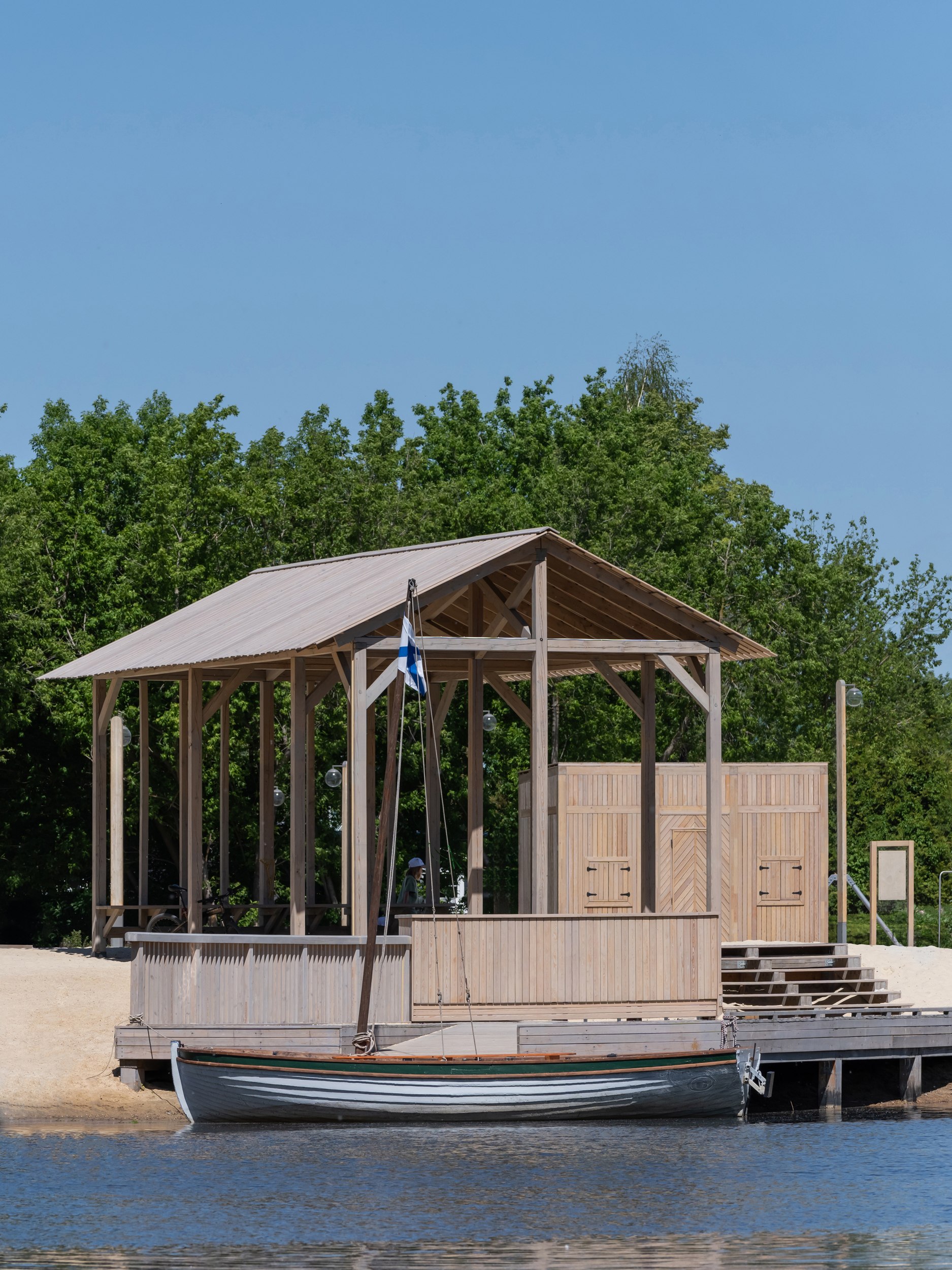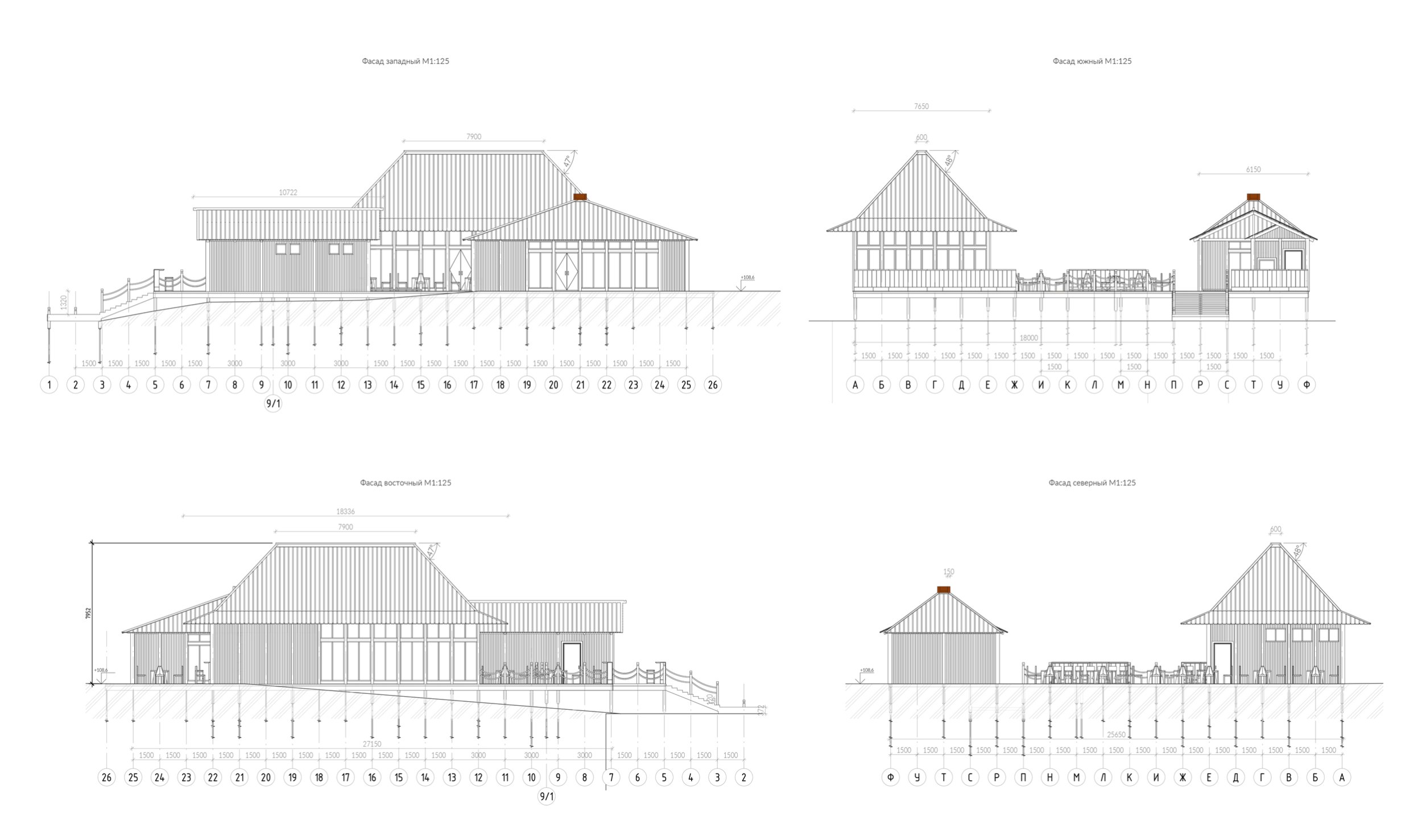 На набережной главной точкой притяжения стал фуд-корт, состоящий из нескольких архитектурных объектов, включая кафе, прокат спортивного инвентаря, лодочную станцию и павильоны с пляжной инфраструктурой, которые расположены на общем деревянном настиле. Пропорции каждого сооружения отражают формы коломенской архитектуры, в частности, кремля. В центре фуд-корта образовался уютный дворик с цветниками, вокруг которого сформировались зоны отдыха с барными стойками и столиками.