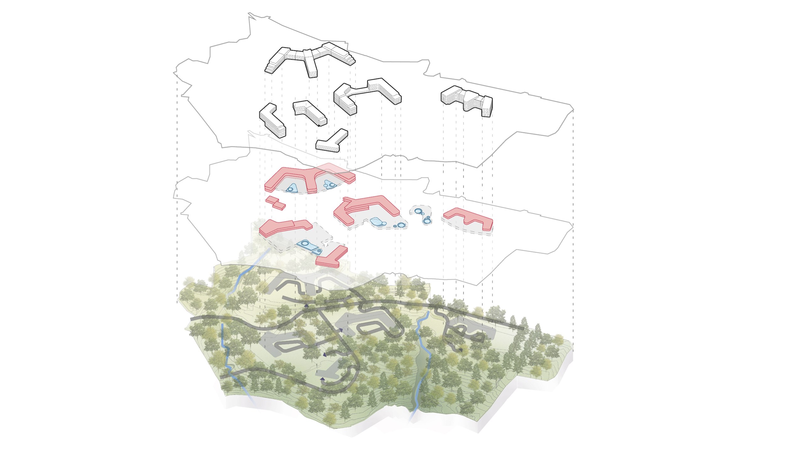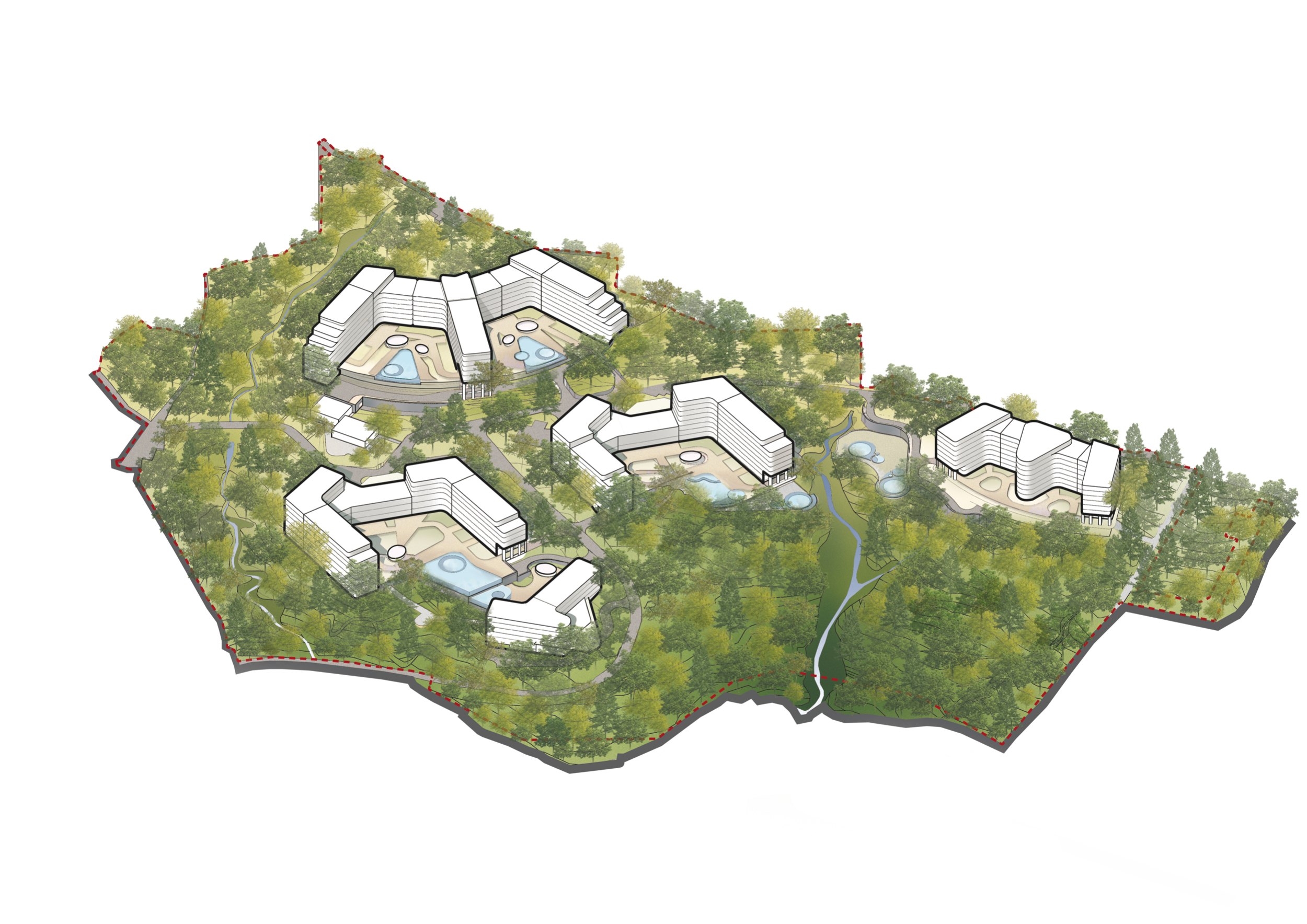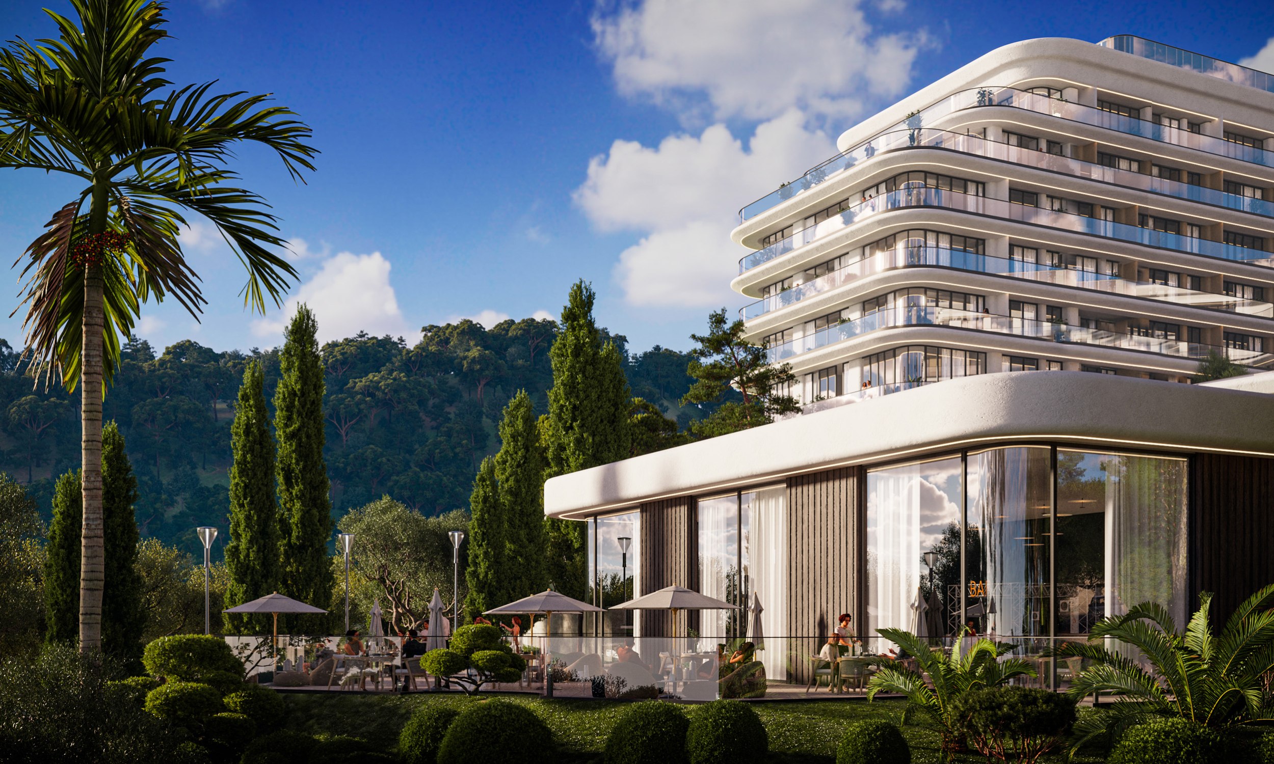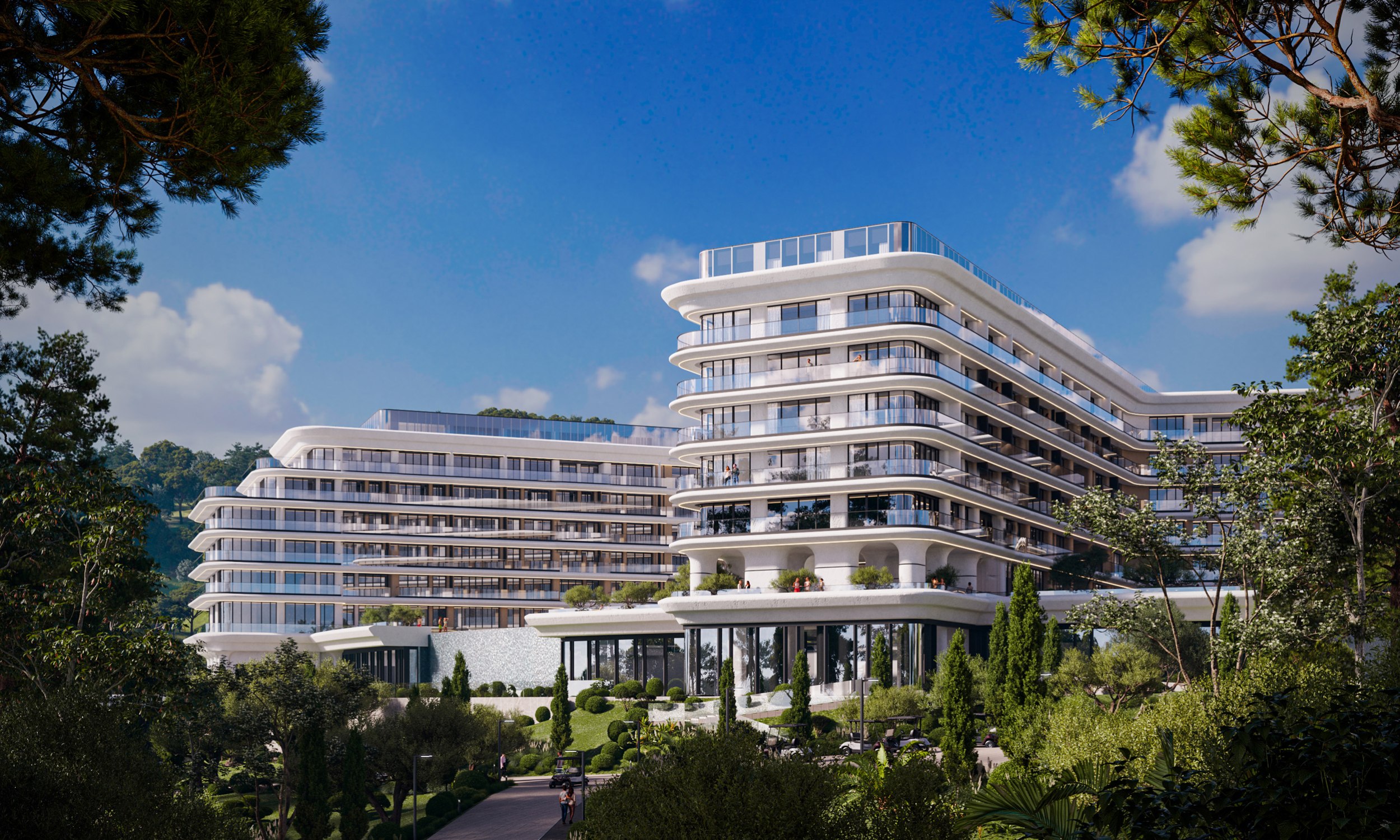Ключевой архитектурной задачей стало сохранение существующего природного окружения и максимальная интеграция зданий в ландшафт. Переменная этажность корпусов (от 1 до 7 этажей) повторяет естественные линии склонов, позволяя минимизировать высотное воздействие и открыть панорамные виды на море и горы из всех номеров. Существующая структура природного озеленения на участке полностью сохранена. Предусмотрено дополнительное озеленение, в том числе сады на крышах, природные ландшафтные зоны и зелёные буферы между корпусами.