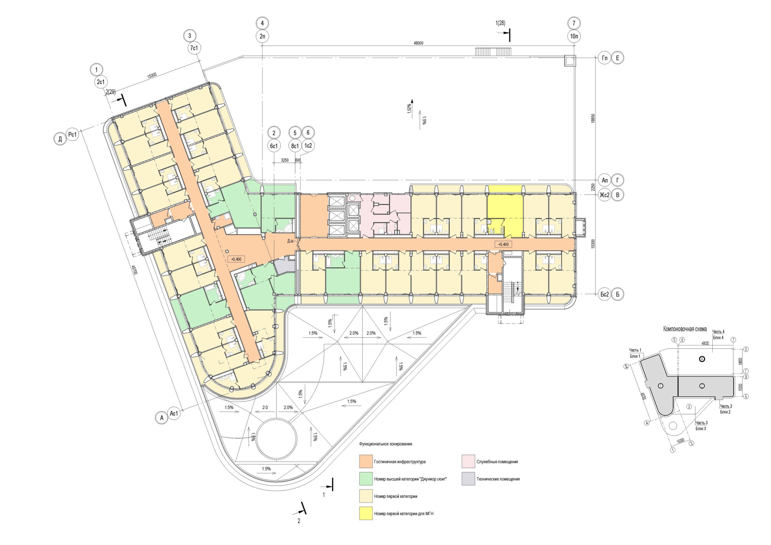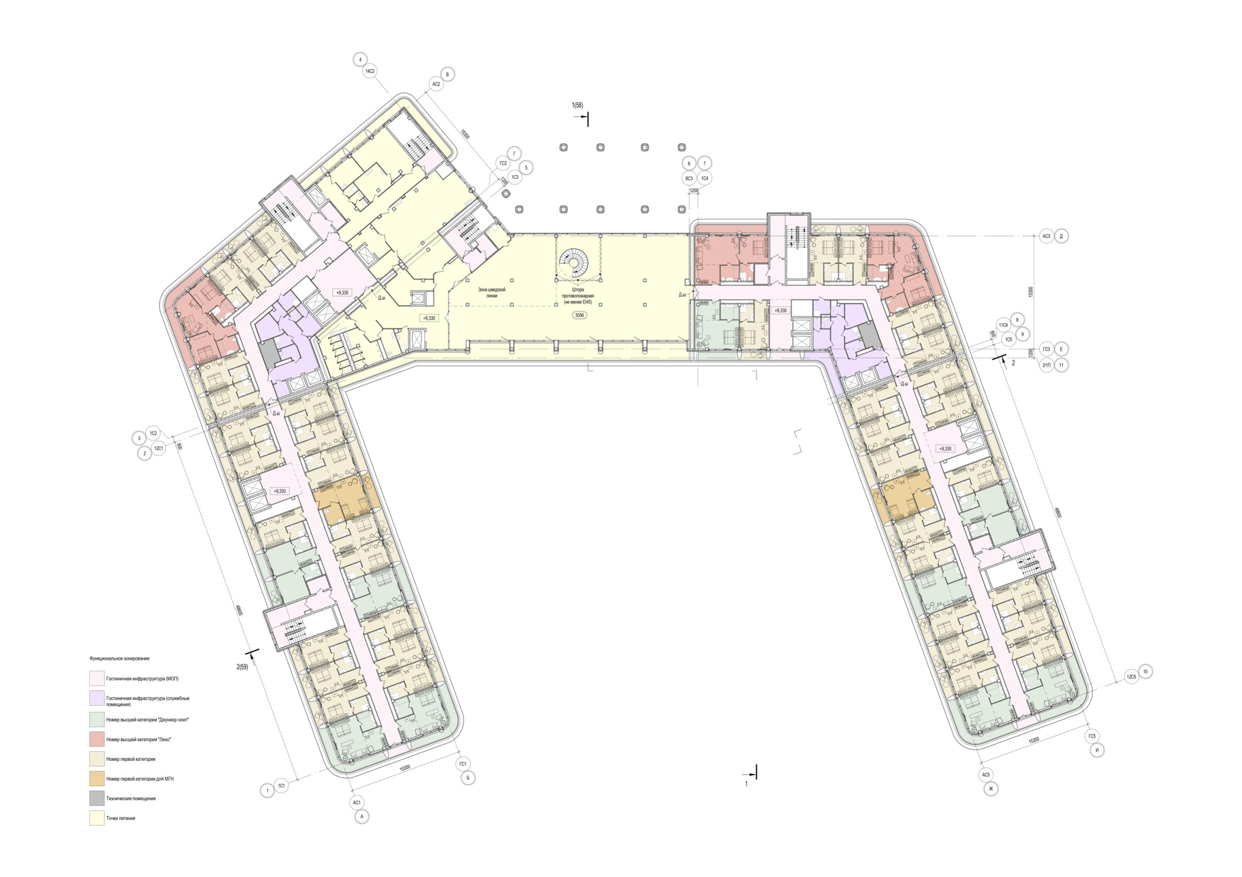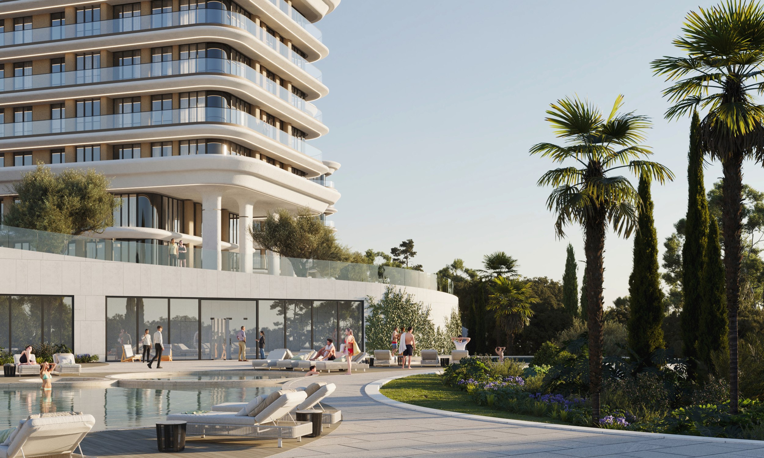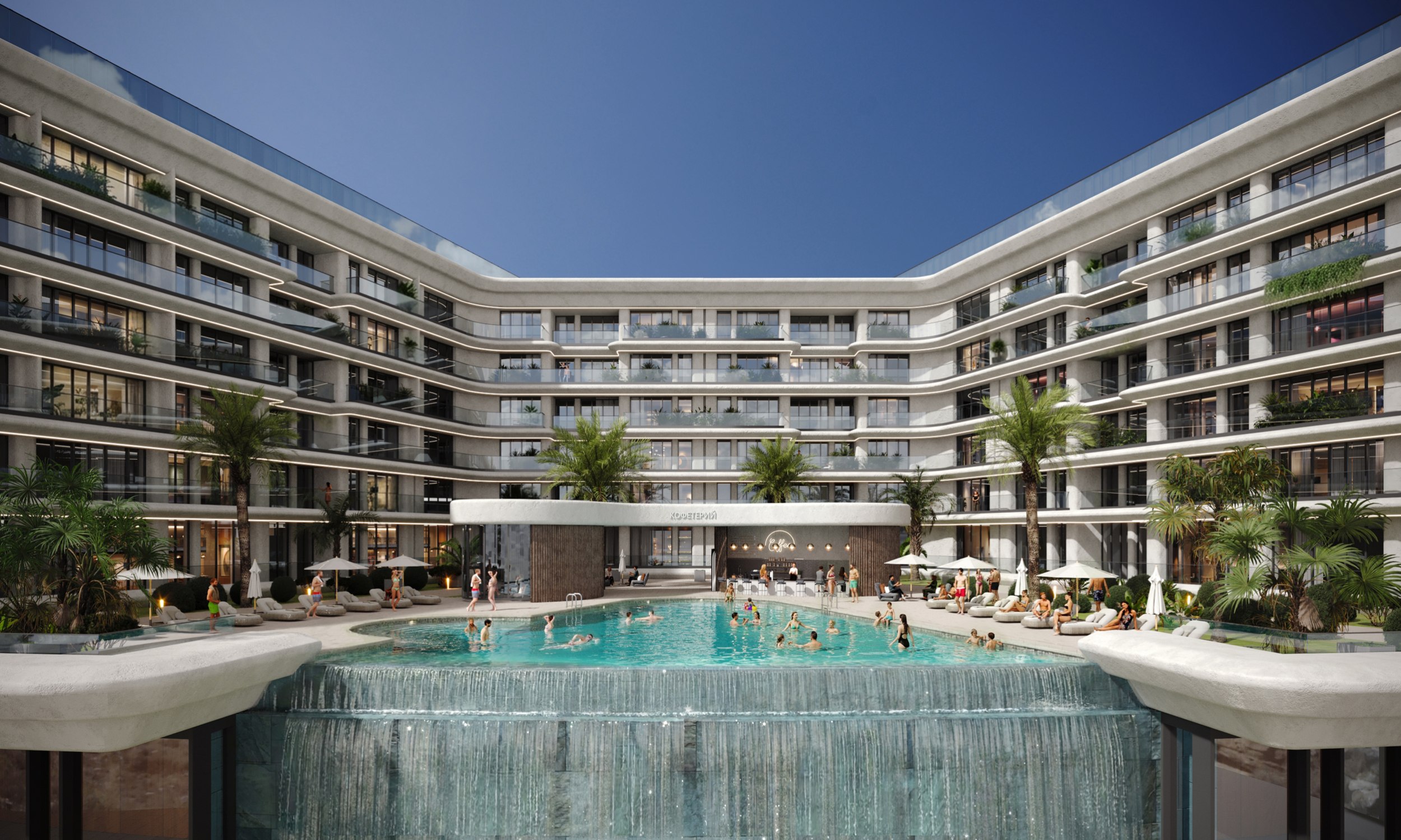 Особое внимание уделено функциональному насыщению комплекса: развитая система СПА- и wellness-зон, бассейнов с пул-барами, конференц-залов, детских пространств, ресторанов и торговых галерей органично встроена в общую планировочную структуру, обеспечивая высокую степень комфорта и соответствие стандартам гостиничного комплекса премиум-класса.