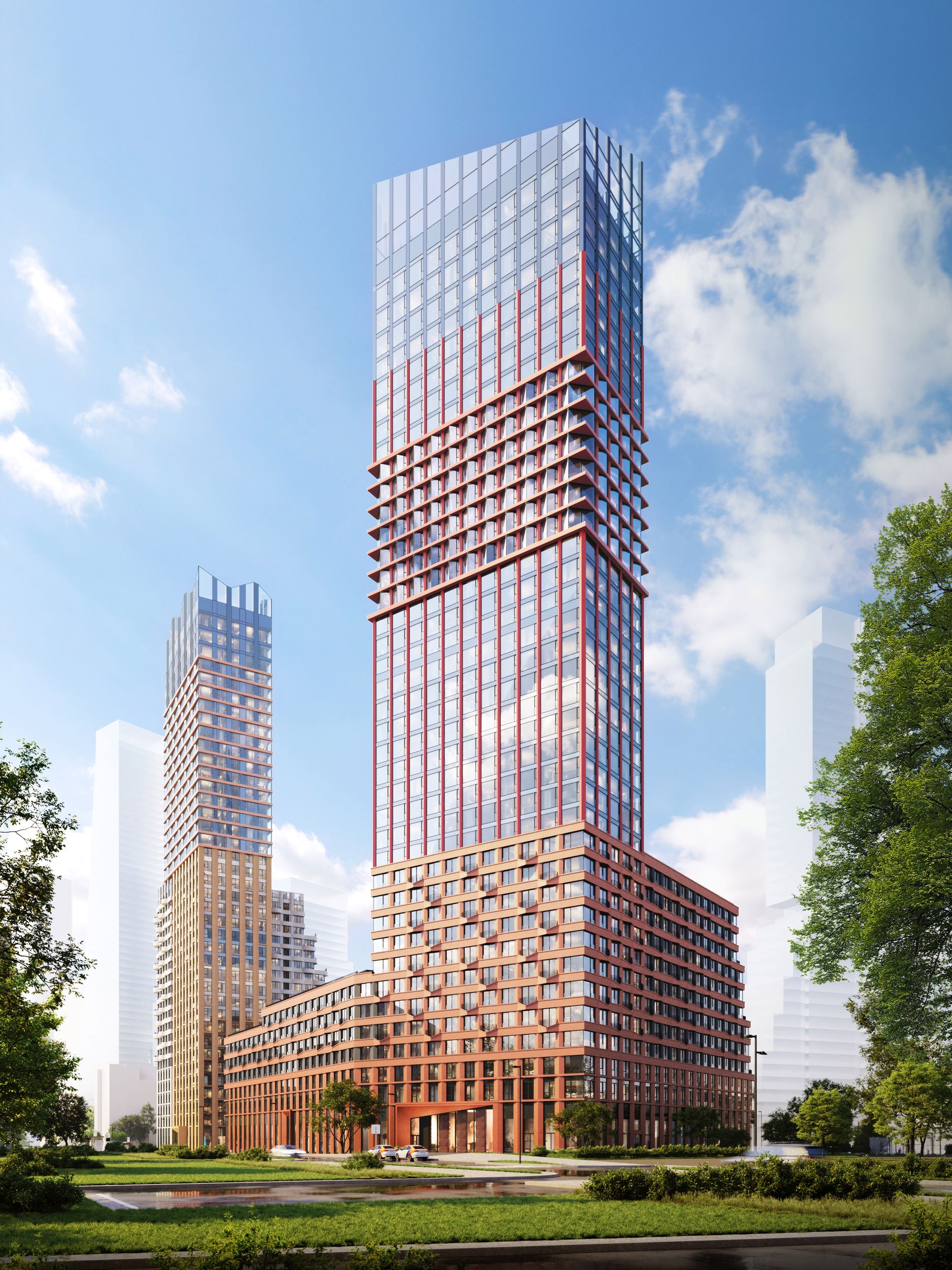Крупный масштаб четырех высотных корпусов компенсируется их узкими и вытянутыми пропорциями и большими просветами между ними в ракурсах Север – Юг, и сложным, ступенчатым силуэтом в ракурсах Восток – Запад. Разделение фасадов на три яруса помогает этим гигантам пространственно «работать» и в масштабе городских перспектив, и в масштабе жителя одновременно.