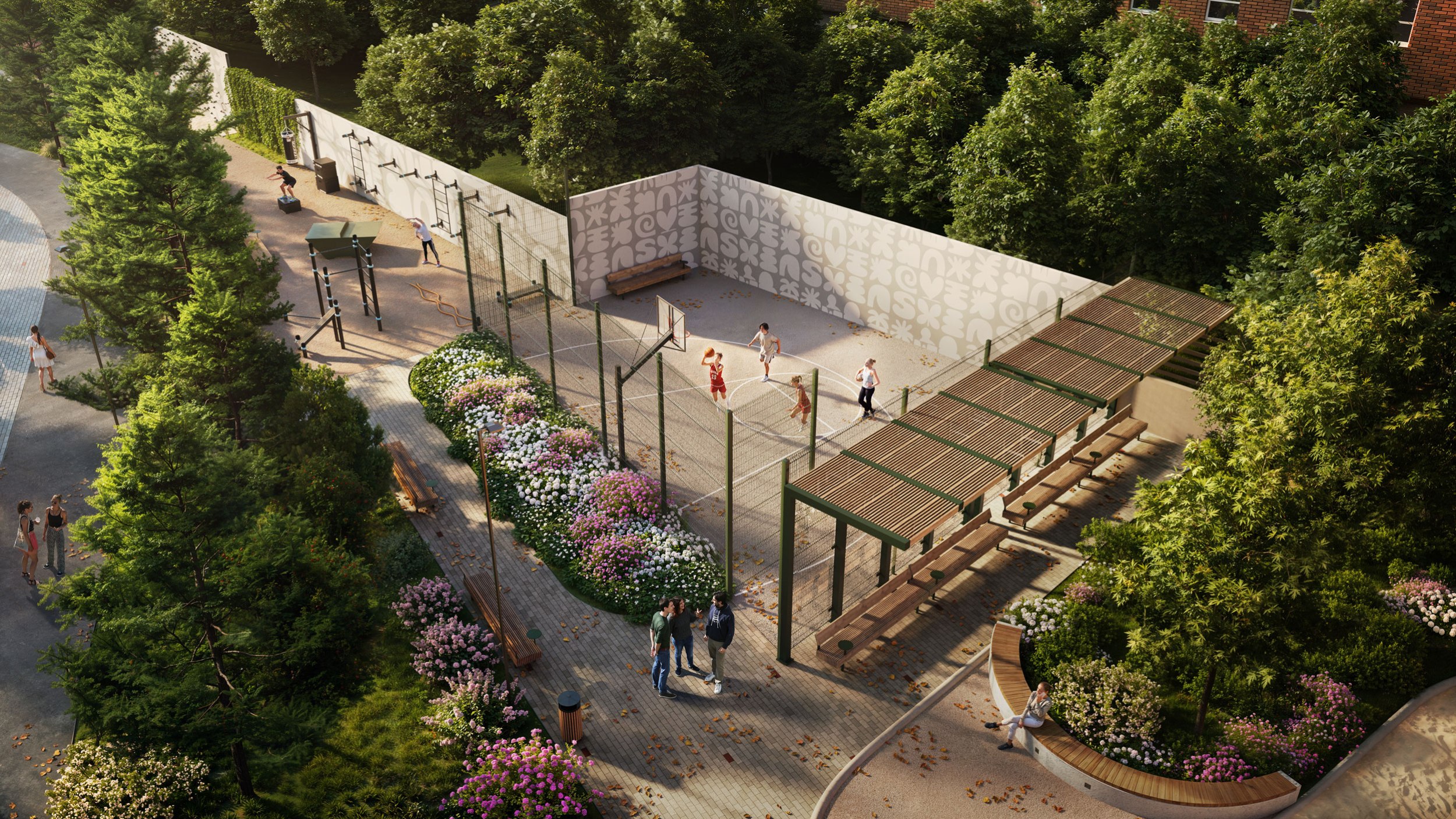 Сердцем квартала станет двор-парк площадью 3 гектара – с прудом, хвойными деревьями, зелёными террасами и перголами. Общая площадь территории – 10,6 гектаров.