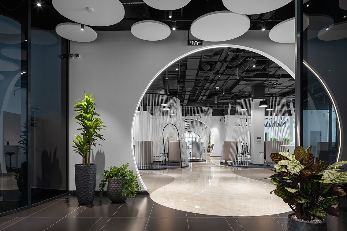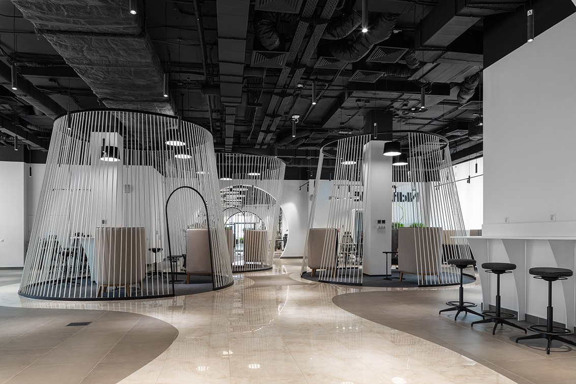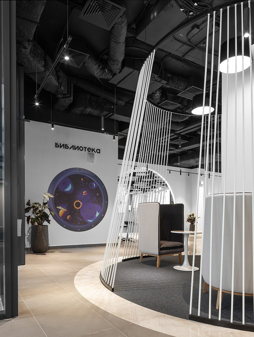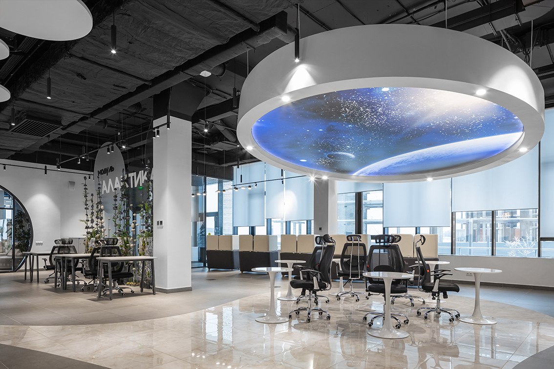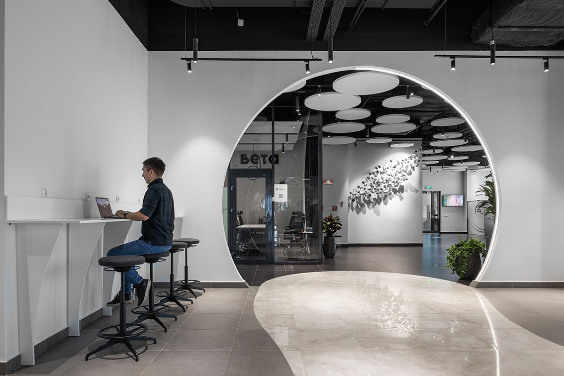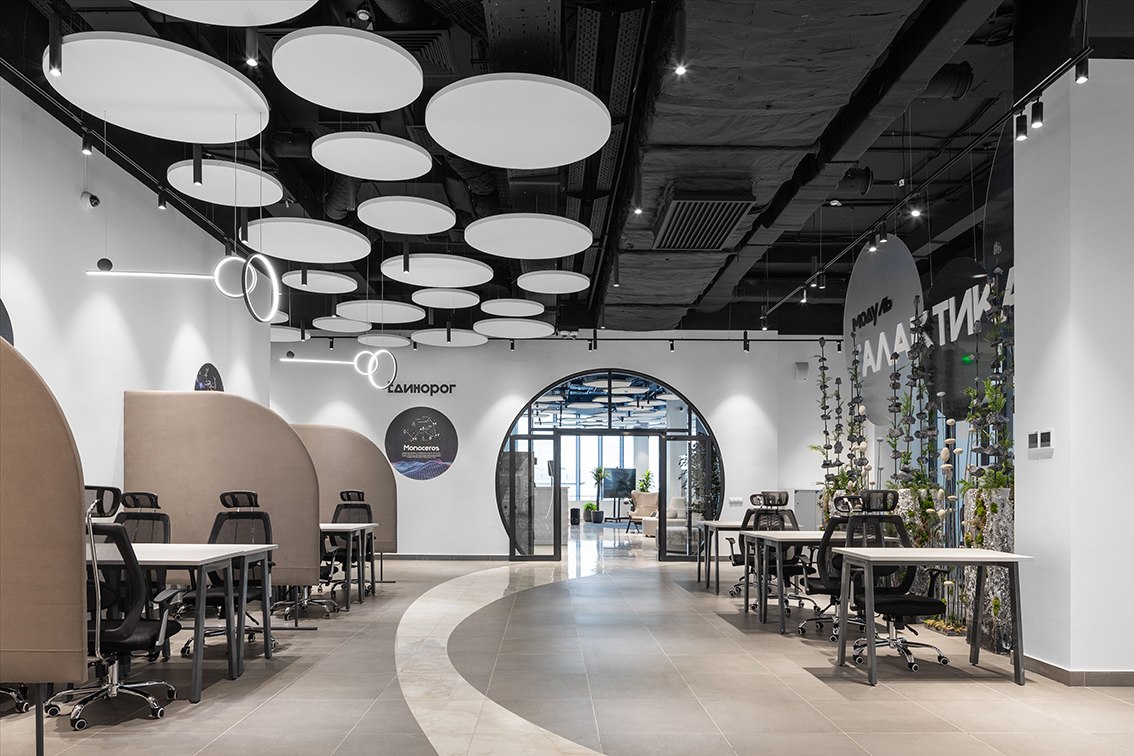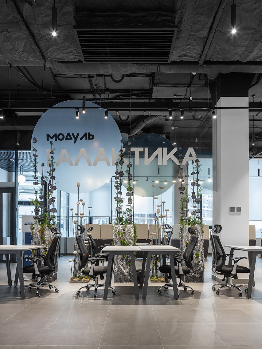 В холле помогает ориентироваться электронный бот-ассистент, рассказывающий о преимуществах коворкинга, а для отдыха и мероприятий предусмотрена обширная лаунж-зона. Любое бронирование места осуществляется с собственного смарт-фона при помощи бота. Разработано специальное приложение, через которое посетители могут познакомиться с возможностями коворкинга, узнать, что и где находится, а также даже запустить в дополненной реальности космическую ракету.
