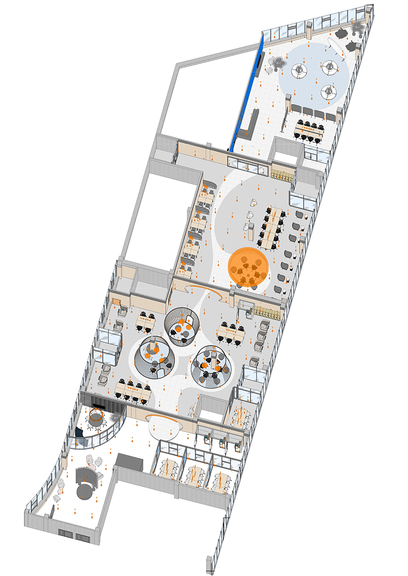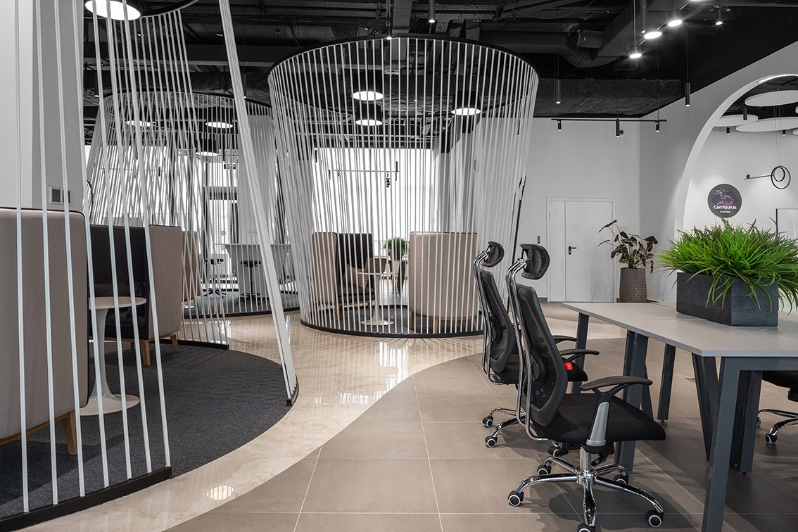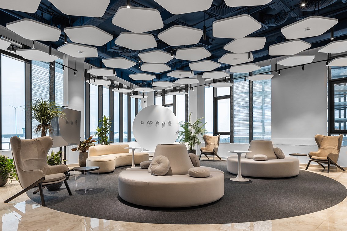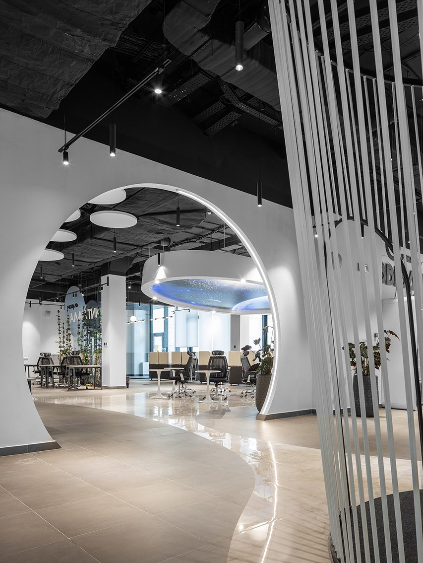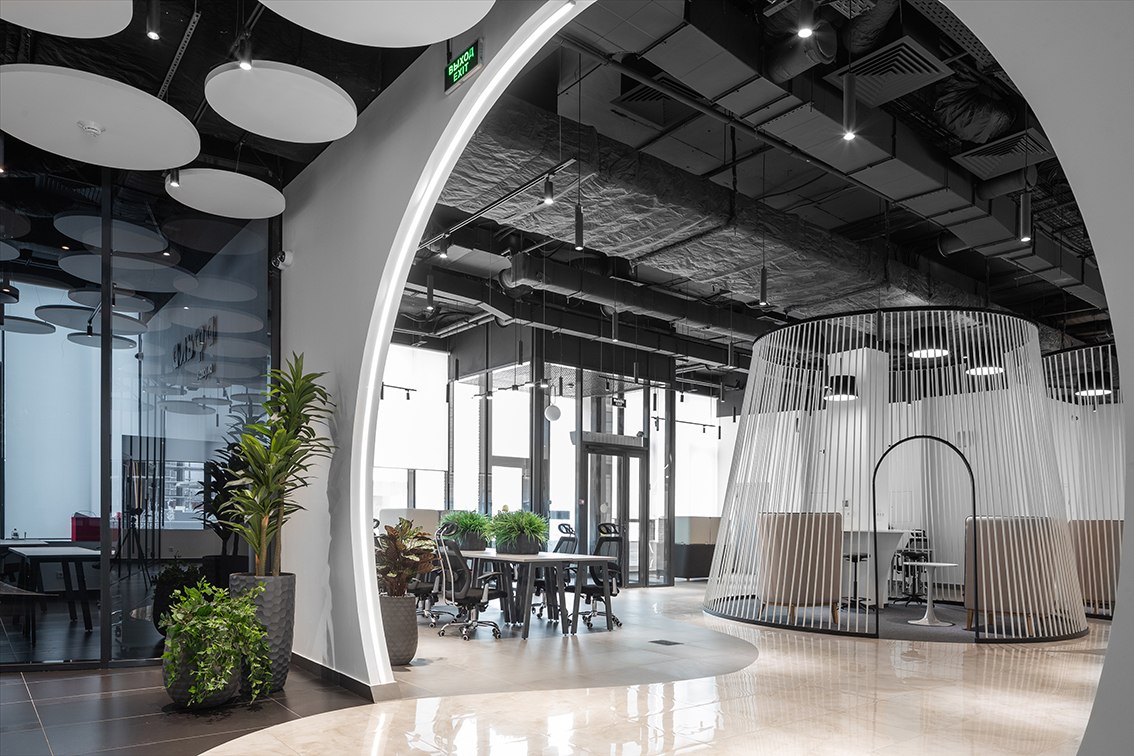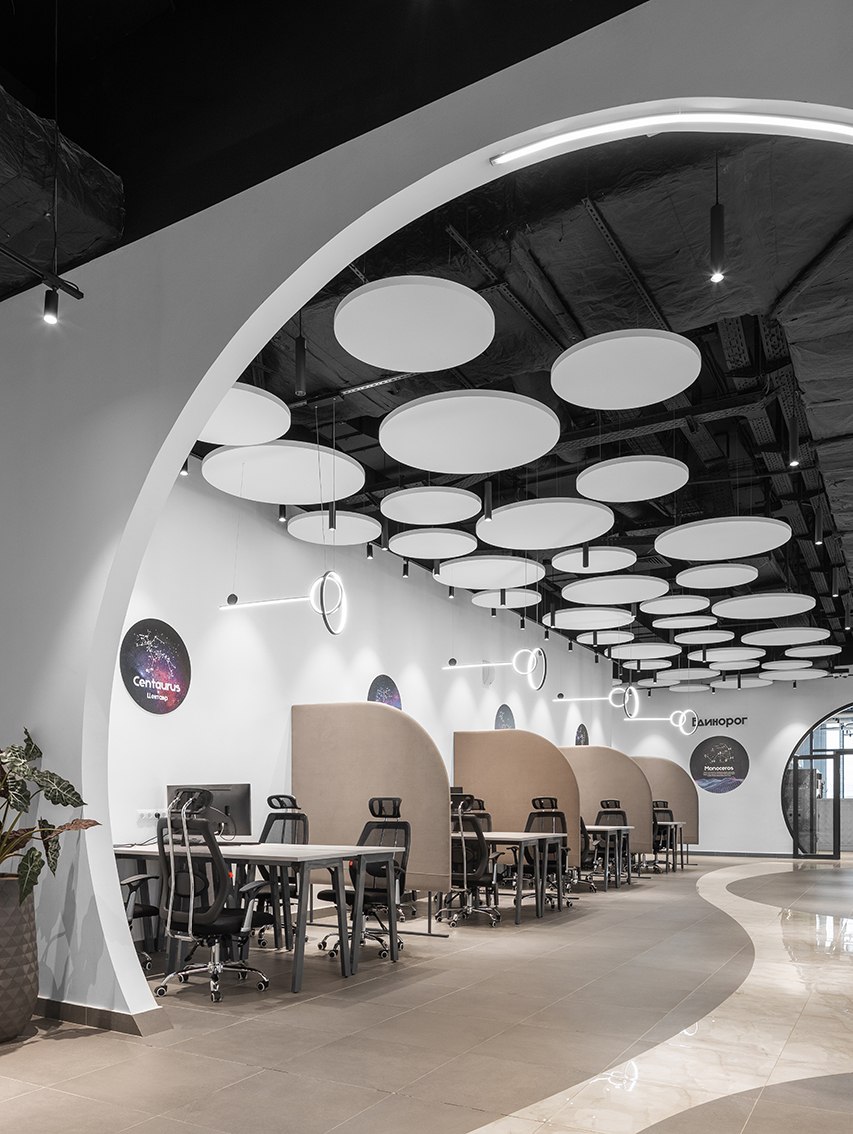 В холле помогает ориентироваться электронный бот-ассистент, рассказывающий о преимуществах коворкинга, а для отдыха и мероприятий предусмотрена обширная лаунж-зона. Любое бронирование места осуществляется с собственного смарт-фона при помощи бота. Разработано специальное приложение, через которое посетители могут познакомиться с возможностями коворкинга, узнать, что и где находится, а также даже запустить в дополненной реальности космическую ракету.