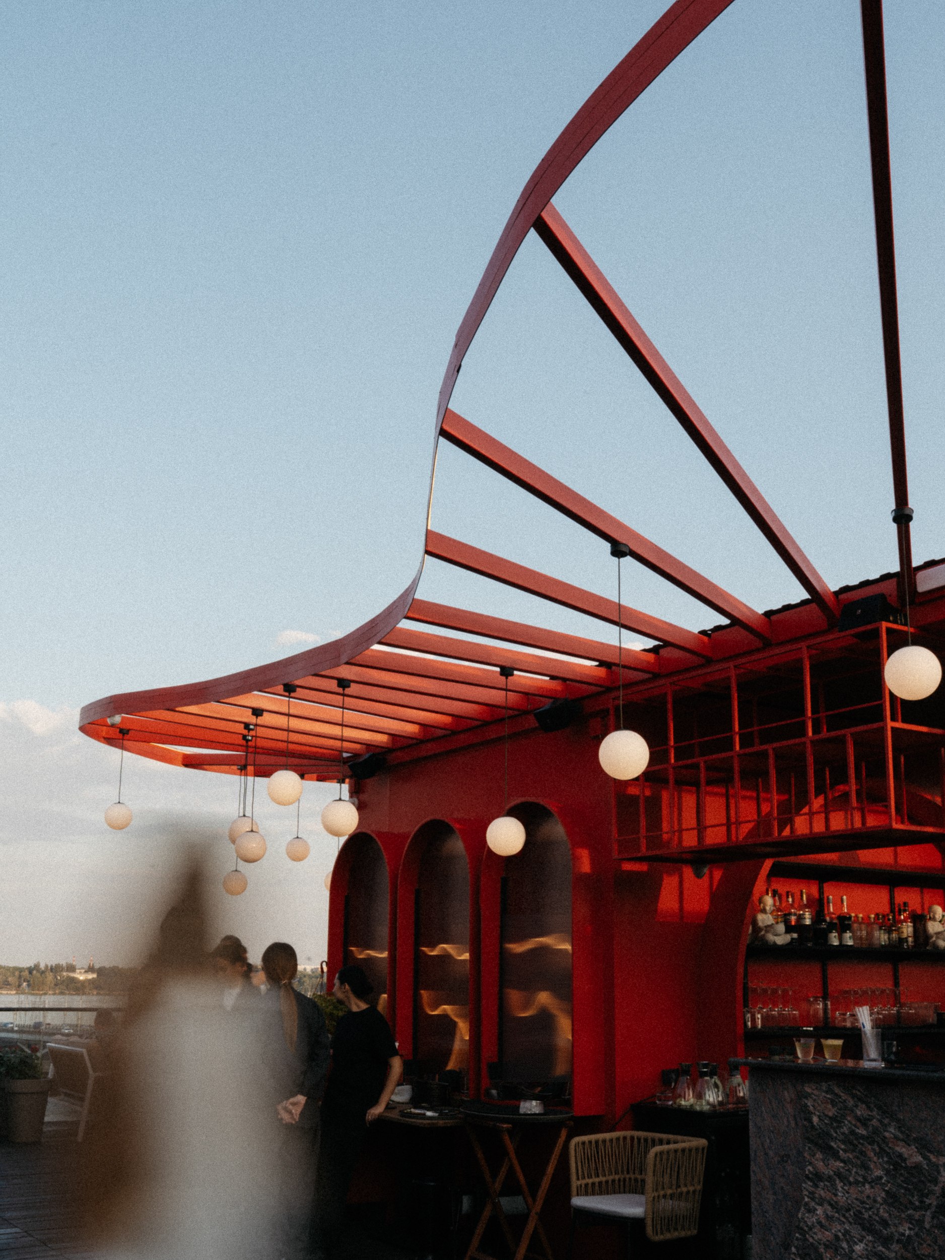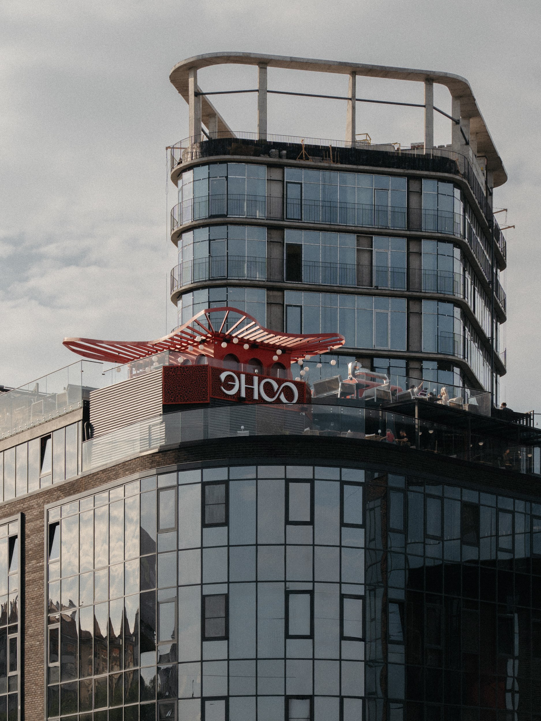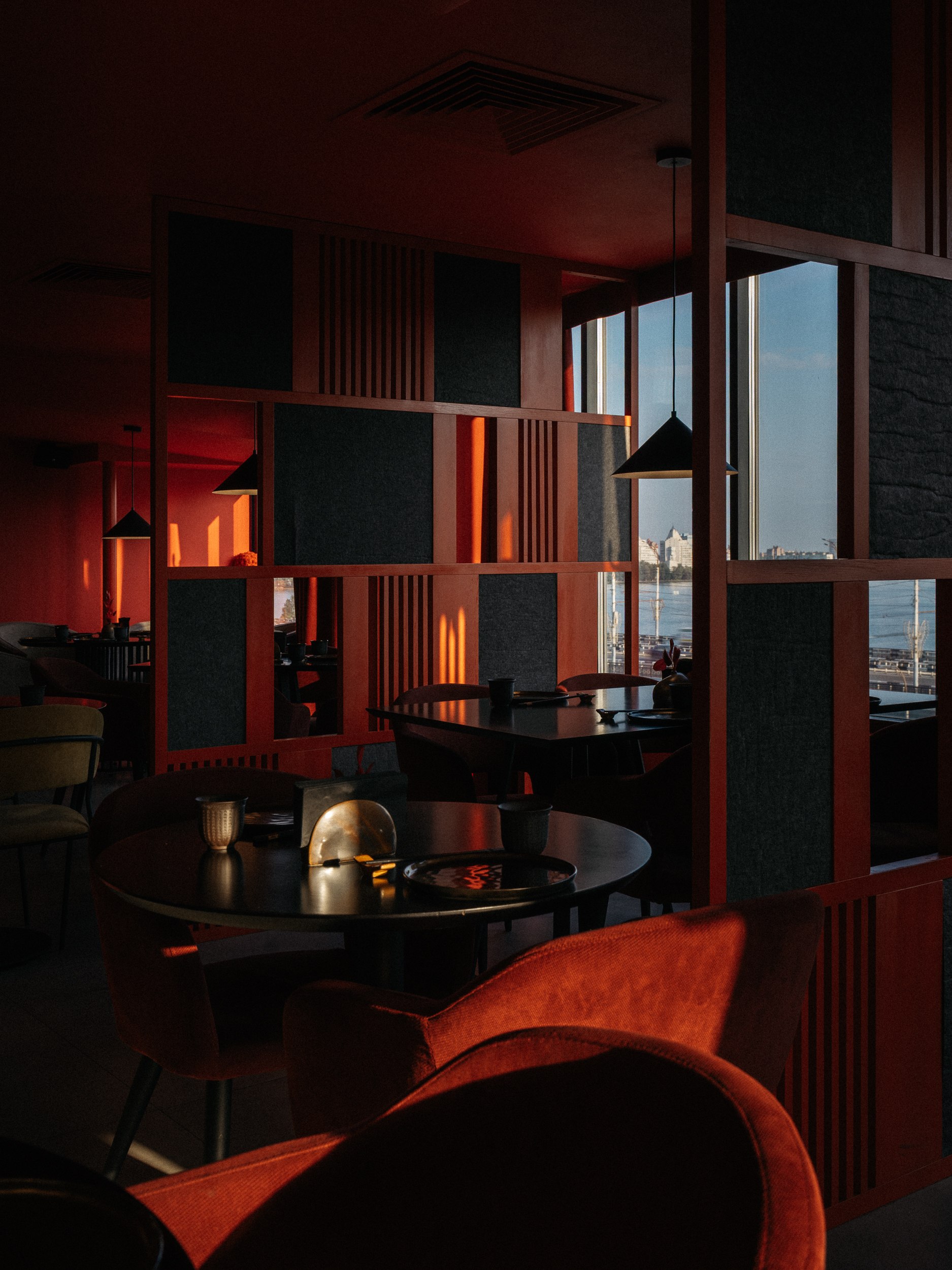 Интерьер и экстерьер ресторана «ЭНСО: Созерцание» были выполнены в едином стиле и колористике. Яркий алый цвет стал точкой притяжения и просматривается со всех сторон. Особенно выразительно ресторан просматривается с Чернавского моста.