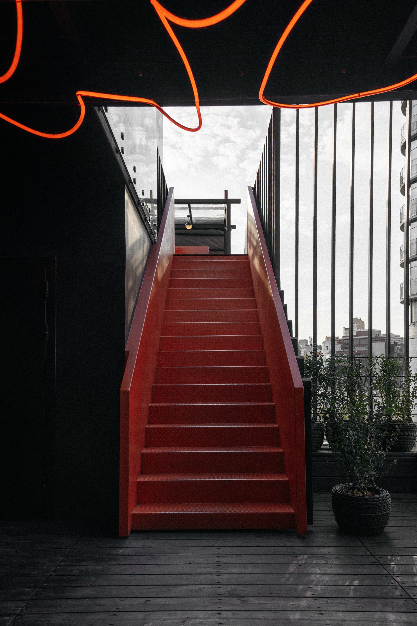 Внутреннее пространство буквально обволакивает красным цветом, различными текстурами, формами и объемами. На довольно небольшой внутренней площади ресторана есть два зала: основной и вип. Особой гордостью являются террасы, которых 3 и размещены они вокруг основного объема, так же задействована крыша моста, по которой можно пройти до винтовой лестницы и попасть в ресторан 15/86 в соседнем здании.