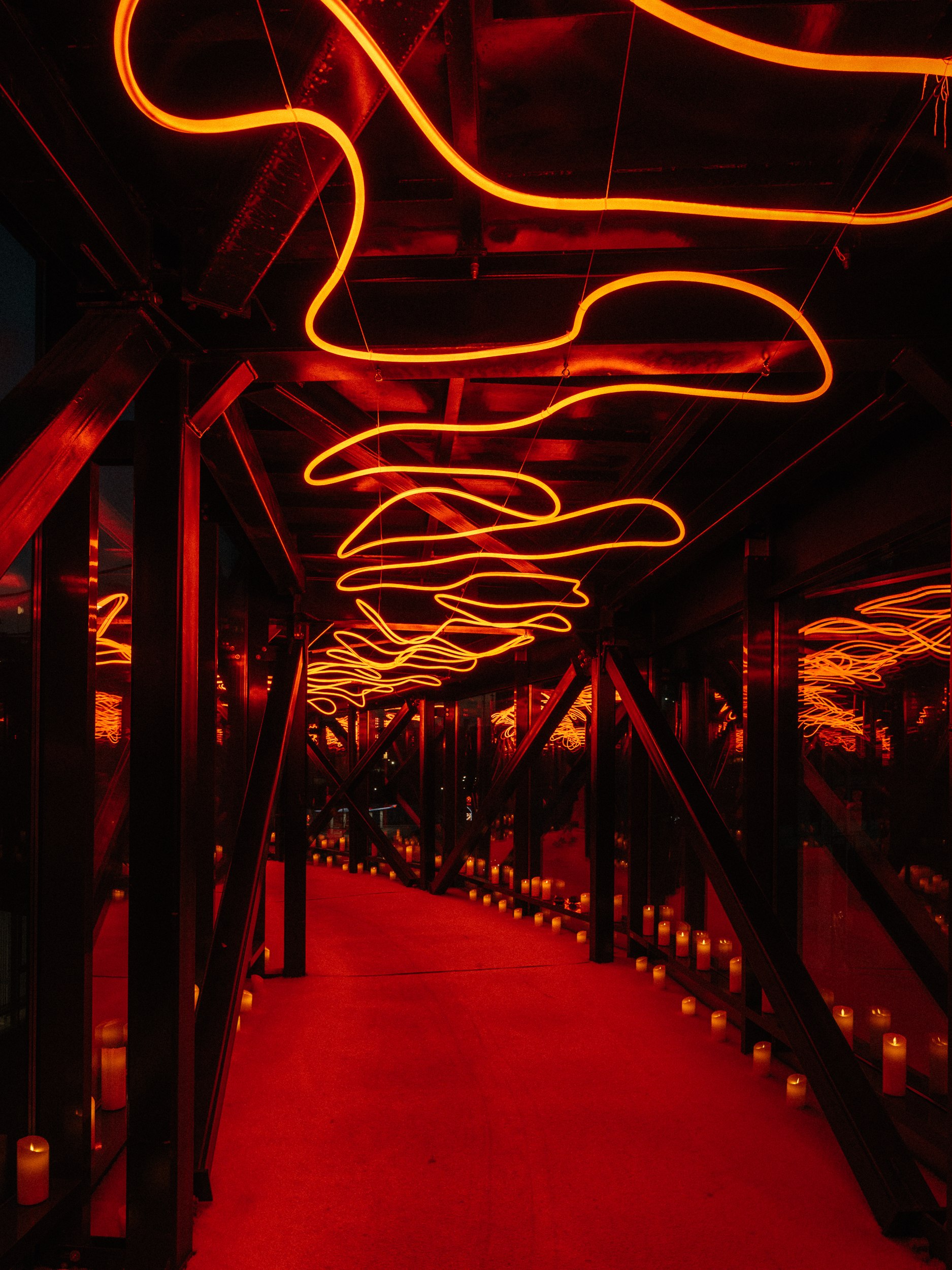 Эмоциональное цветовое приветствие начинается с лифтового холла соседнего здания. На следующем этапе гости попадают на стеклянный мост, ведущий в здание с рестораном.