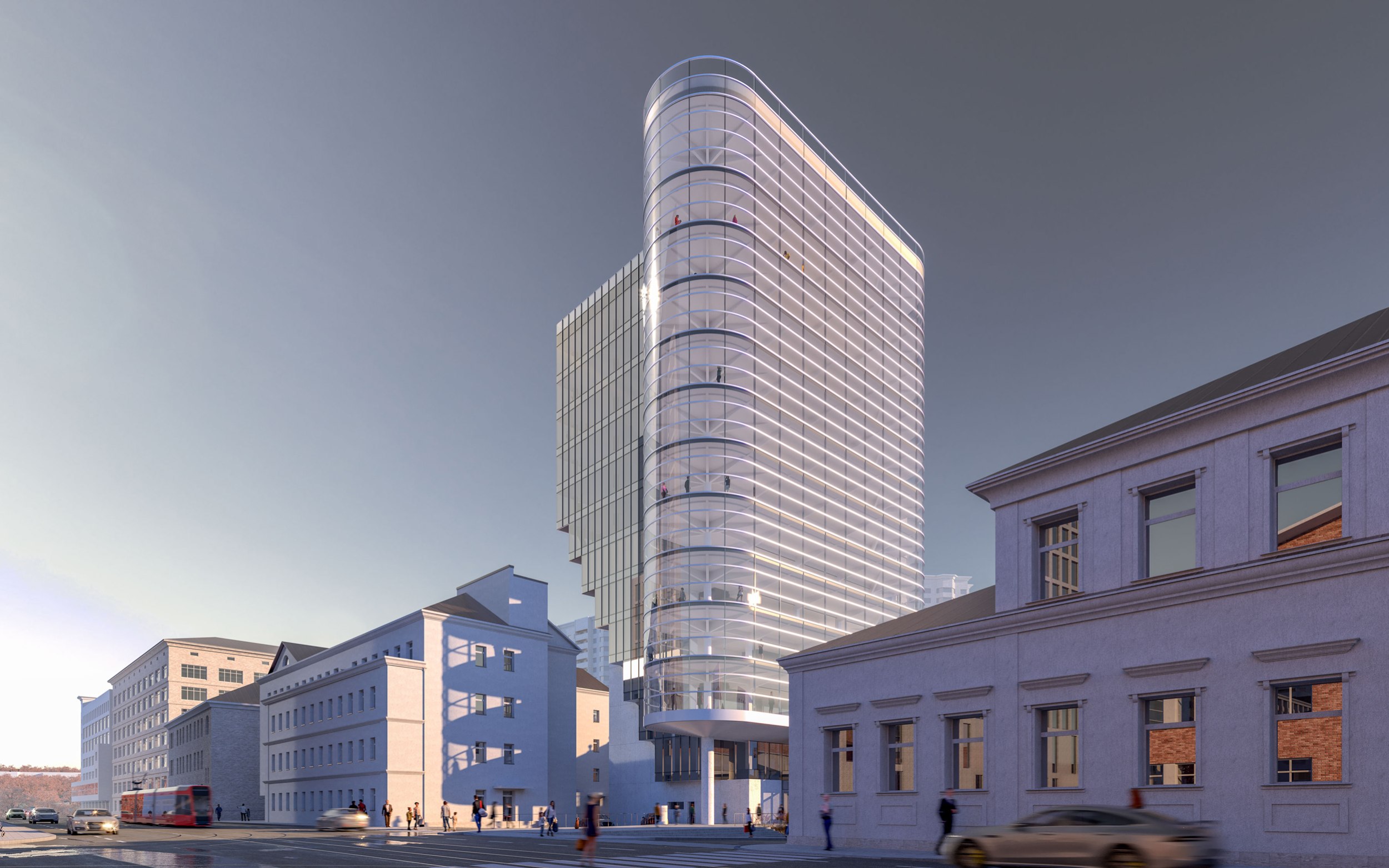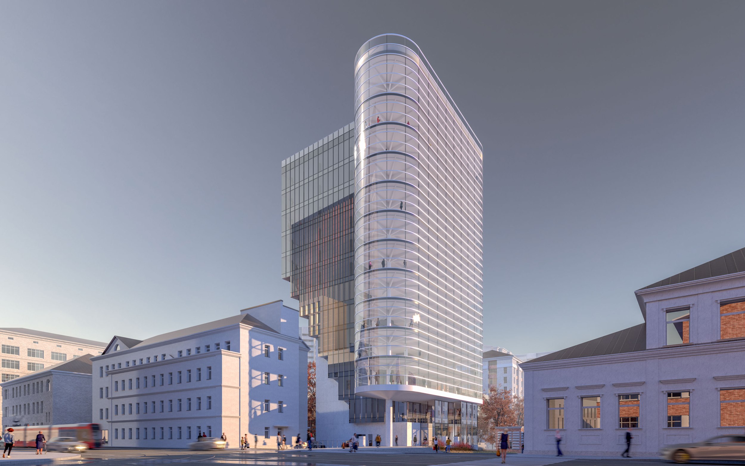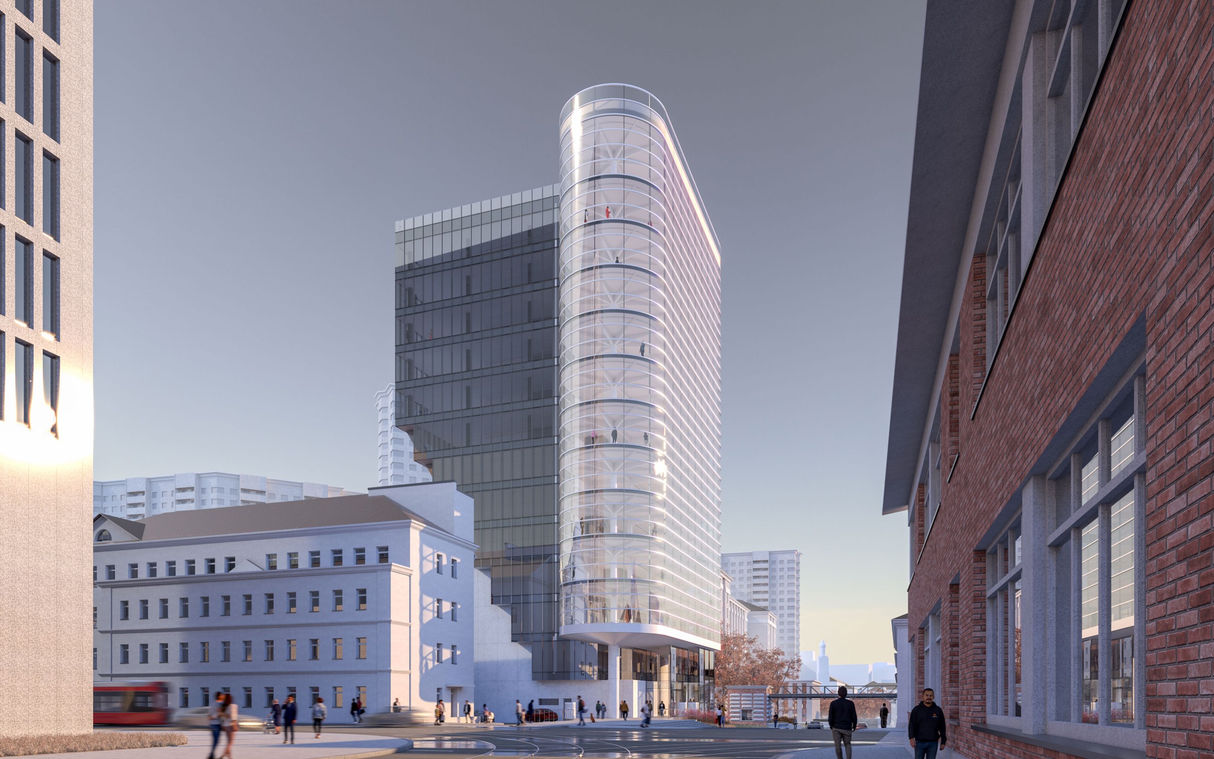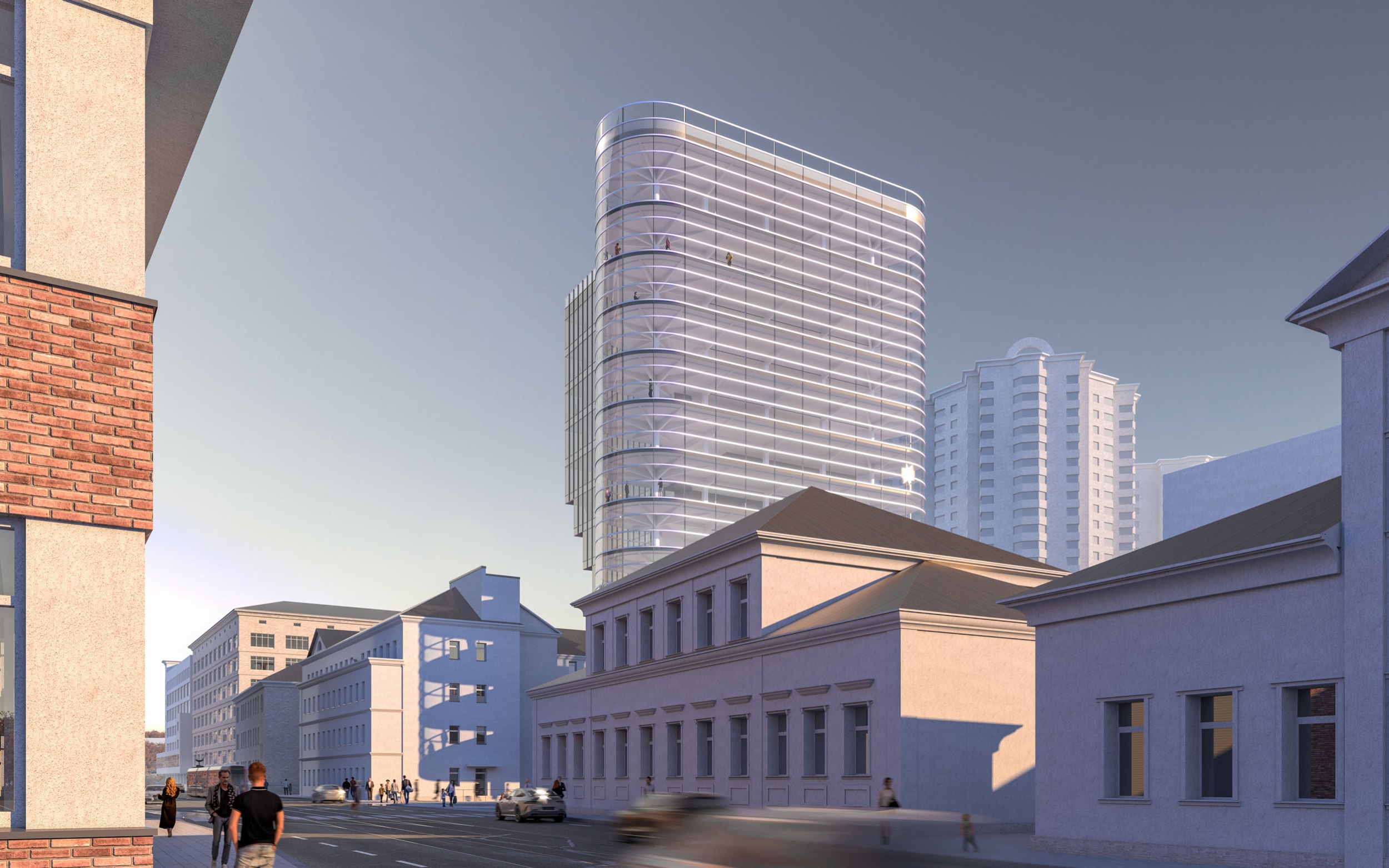 Архитектурное решение. Конструктивистский характер композиции соответствует контексту – рядом памятники конструктивизма – ЦАГИ и ЦКБ-29. Тектоника обнажена. Контуры – чистые. Мелкий рисунок переплётов делает объёмы цельнее – урок Эриха Мендельсона. С основных точек здание работает в контражуре, на сочетании видимого каркаса и невесомого стекла. Входы в офисное здание и кафе – с создаваемой площади. Служебные двери, ворота паркинга и трансформаторных не видны с улиц. Сложное сочетание объёмов дозволяет выполнить каждый из них банальными средствами – обычные витражи (моллирования – минимум), архитектурный бетон.
