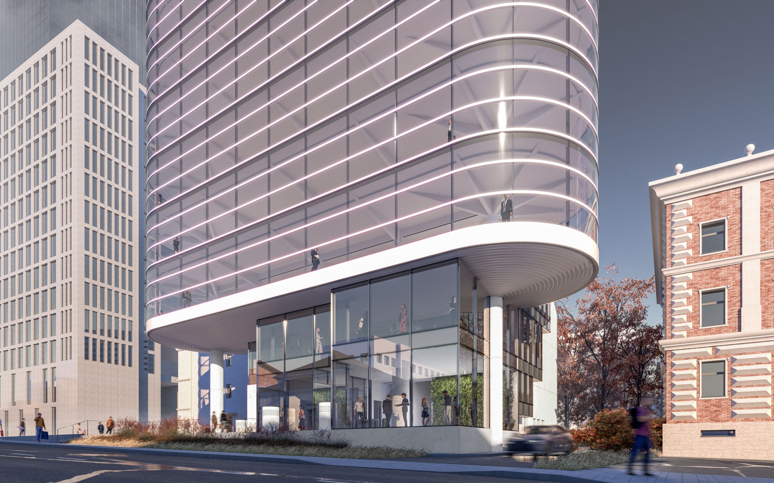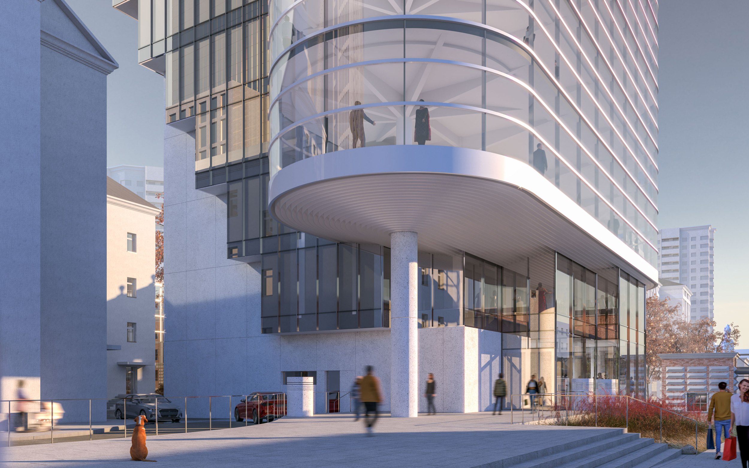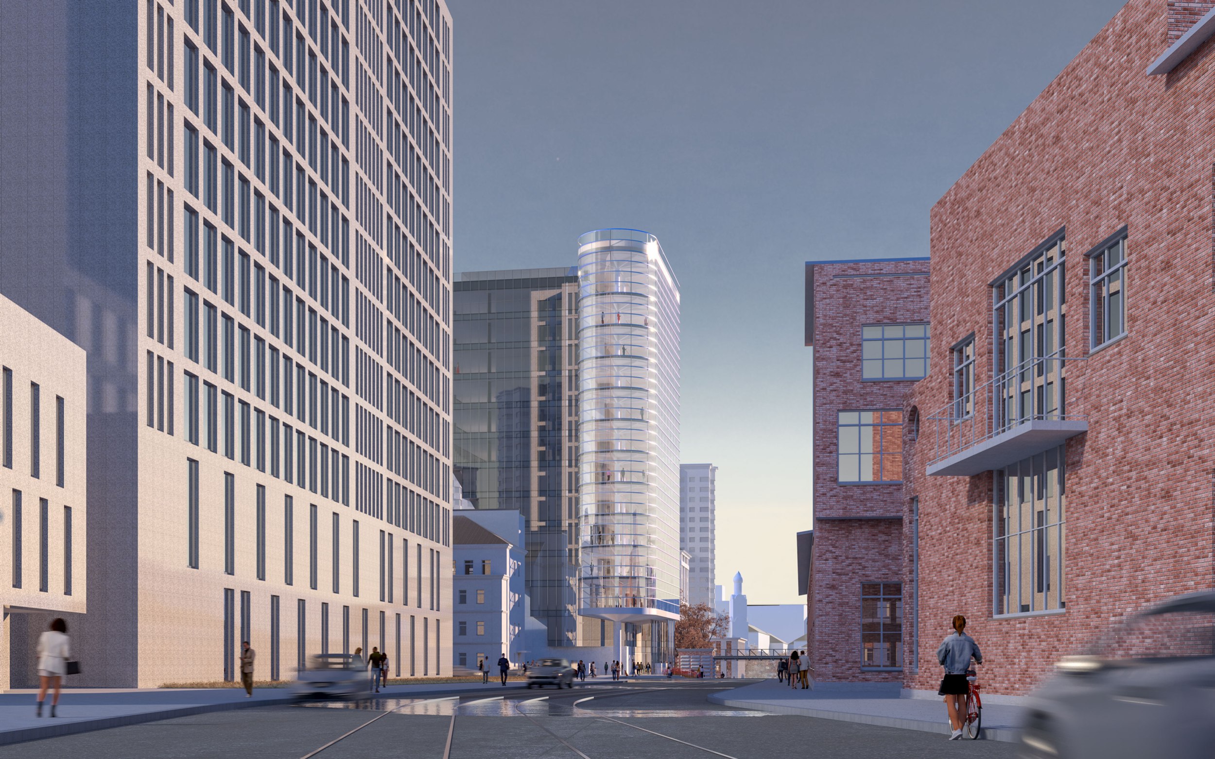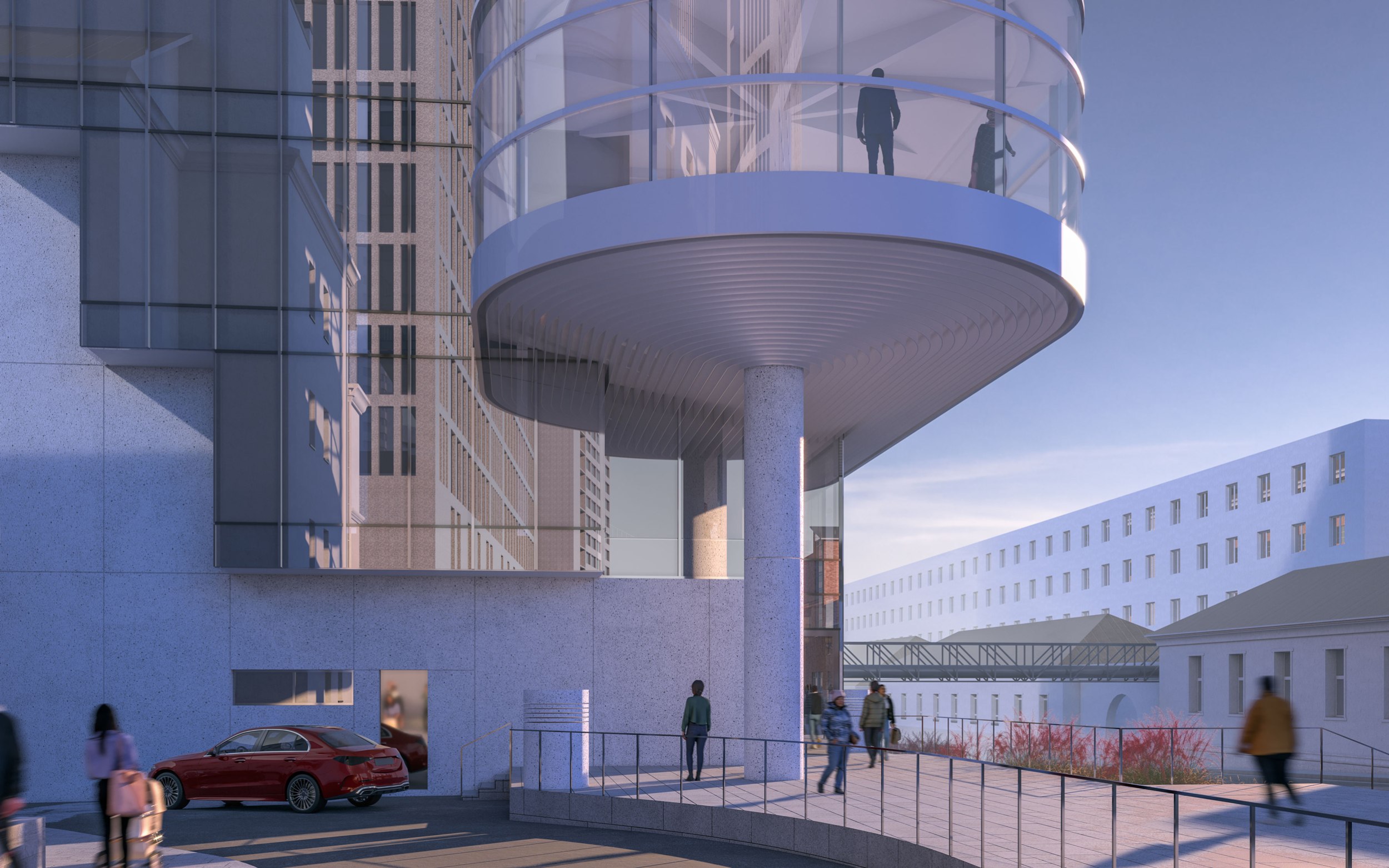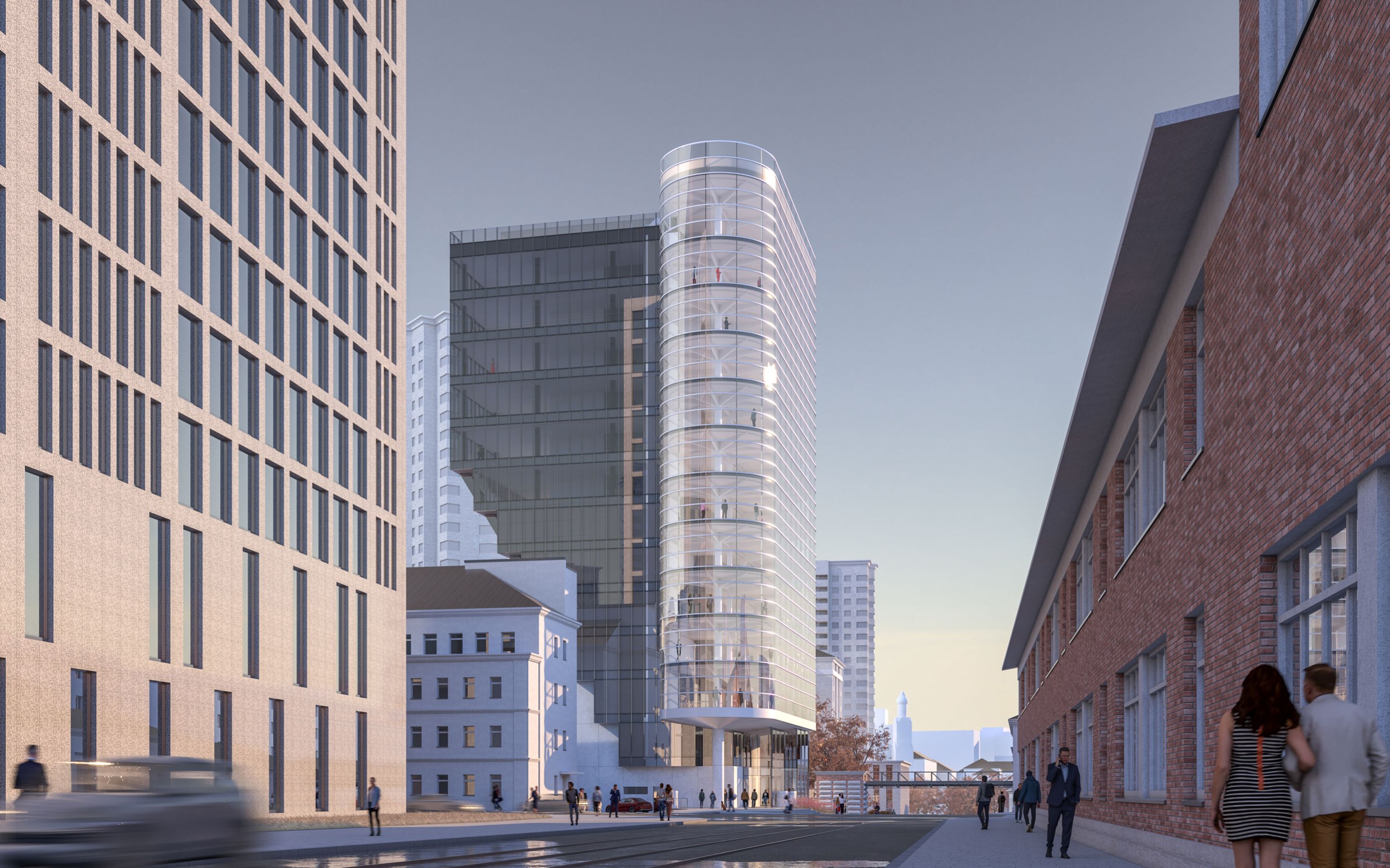 Архитектурное решение. Конструктивистский характер композиции соответствует контексту – рядом памятники конструктивизма – ЦАГИ и ЦКБ-29. Тектоника обнажена. Контуры – чистые. Мелкий рисунок переплётов делает объёмы цельнее – урок Эриха Мендельсона. С основных точек здание работает в контражуре, на сочетании видимого каркаса и невесомого стекла. Входы в офисное здание и кафе – с создаваемой площади. Служебные двери, ворота паркинга и трансформаторных не видны с улиц. Сложное сочетание объёмов дозволяет выполнить каждый из них банальными средствами – обычные витражи (моллирования – минимум), архитектурный бетон.
