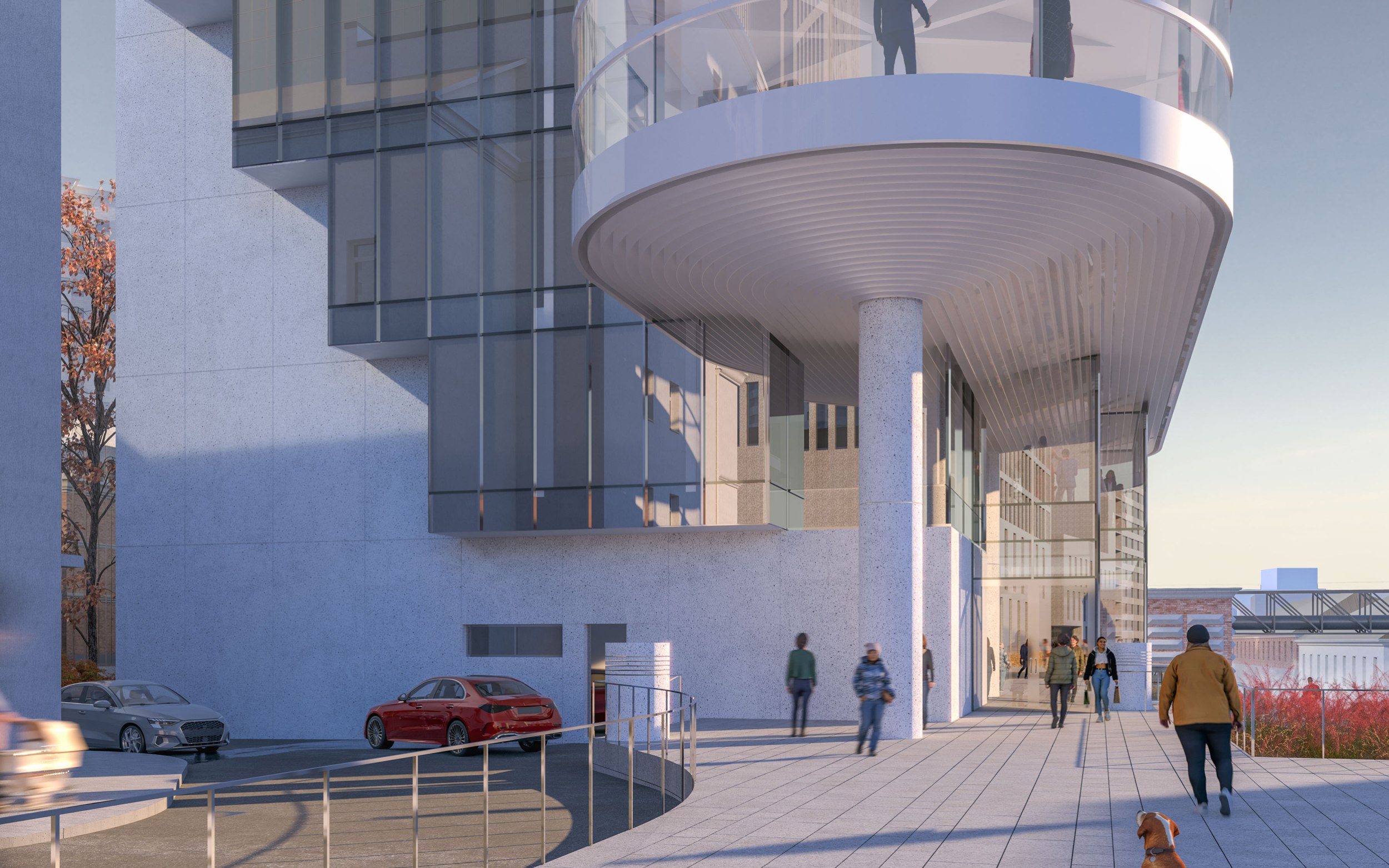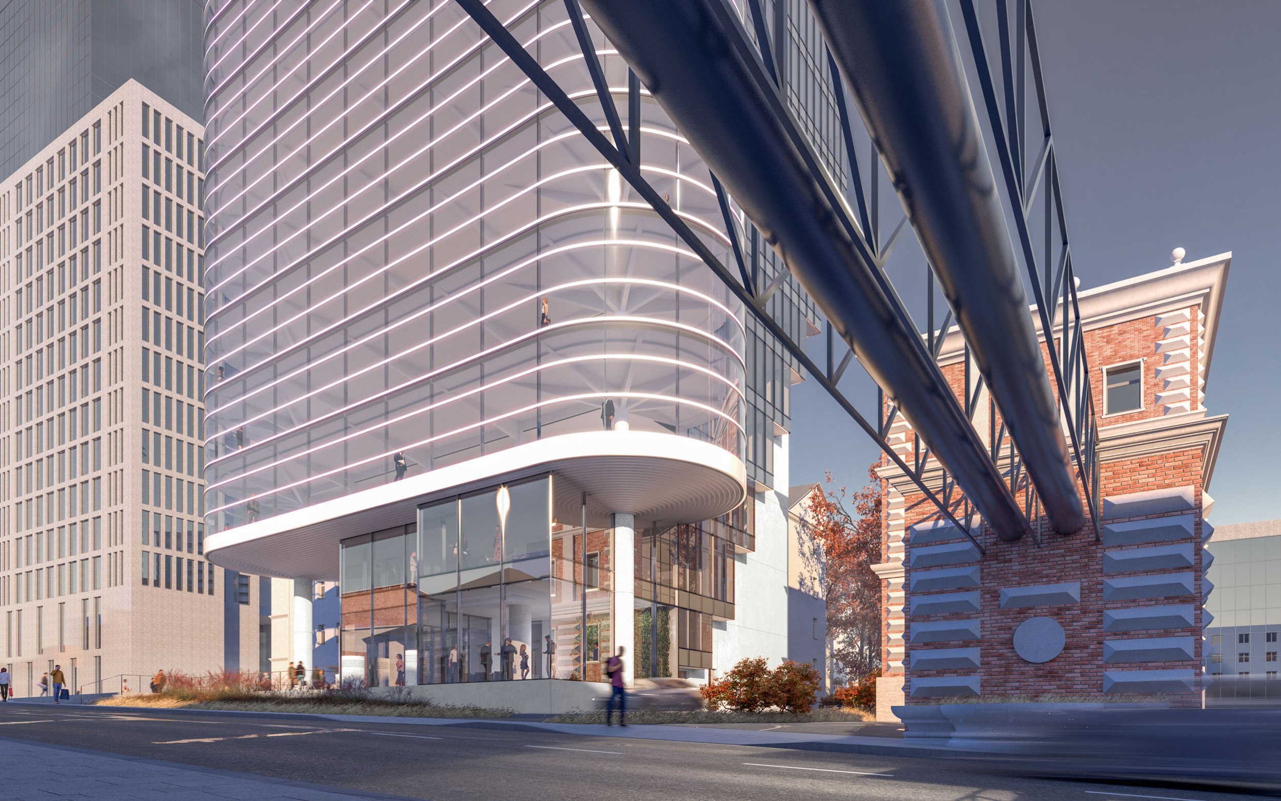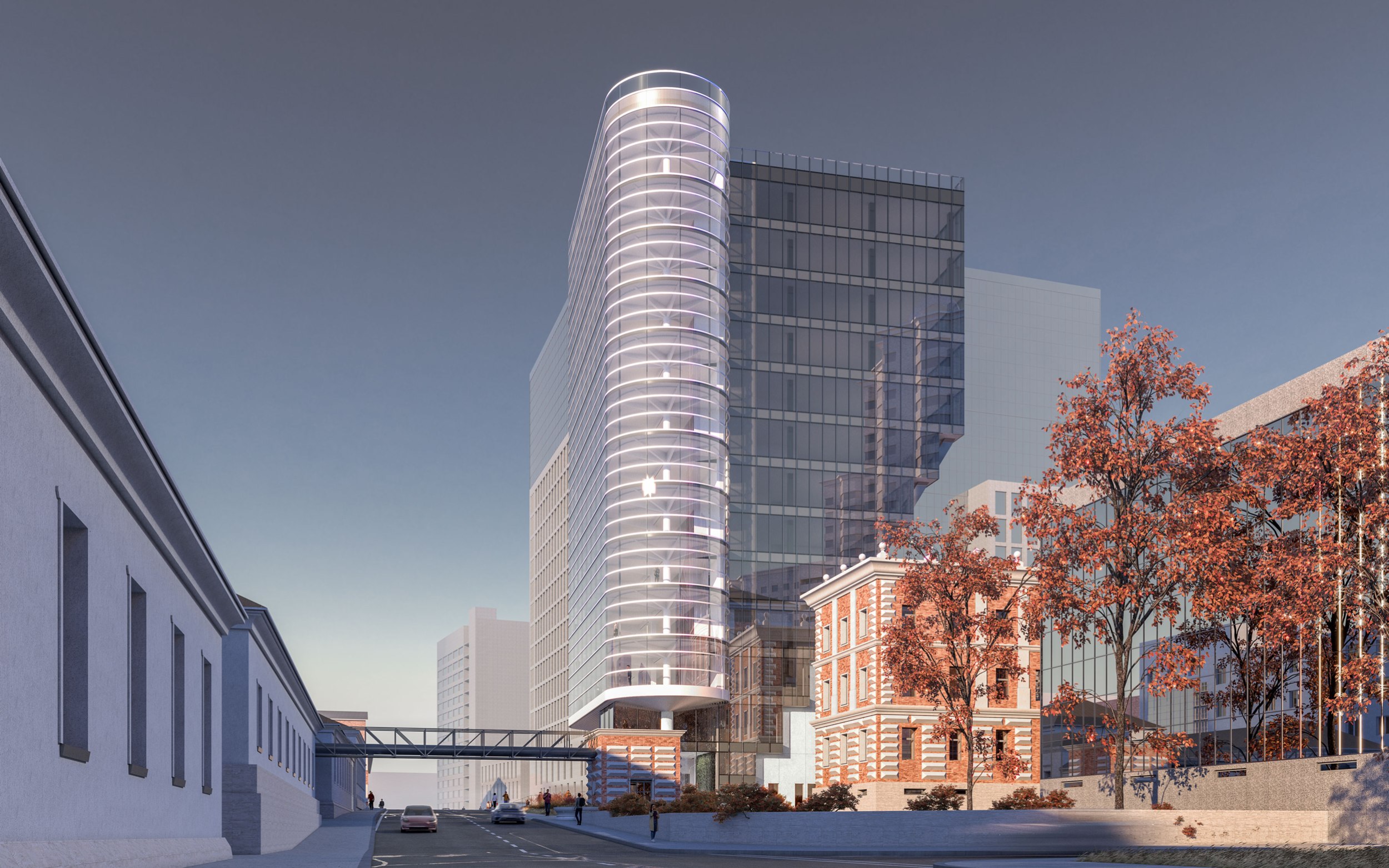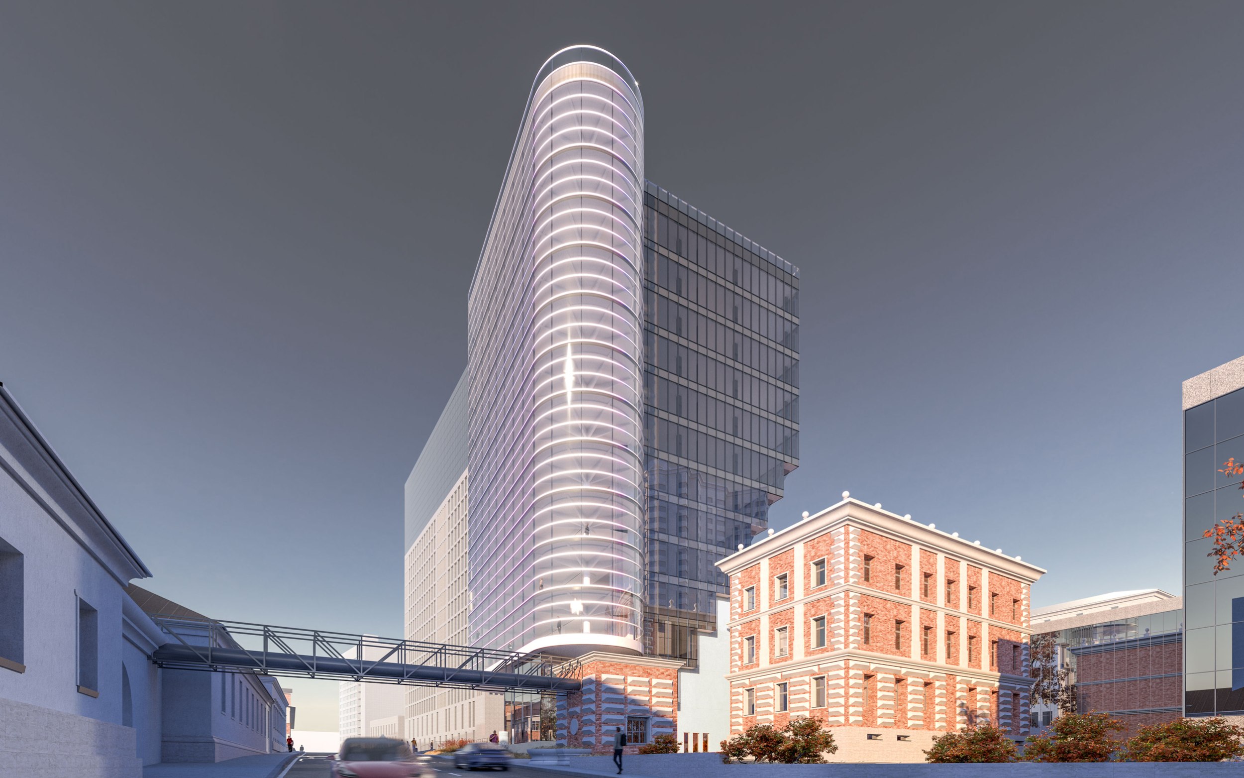 Архитектурное решение. Конструктивистский характер композиции соответствует контексту – рядом памятники конструктивизма – ЦАГИ и ЦКБ-29. Тектоника обнажена. Контуры – чистые. Мелкий рисунок переплётов делает объёмы цельнее – урок Эриха Мендельсона. С основных точек здание работает в контражуре, на сочетании видимого каркаса и невесомого стекла. Входы в офисное здание и кафе – с создаваемой площади. Служебные двери, ворота паркинга и трансформаторных не видны с улиц. Сложное сочетание объёмов дозволяет выполнить каждый из них банальными средствами – обычные витражи (моллирования – минимум), архитектурный бетон.