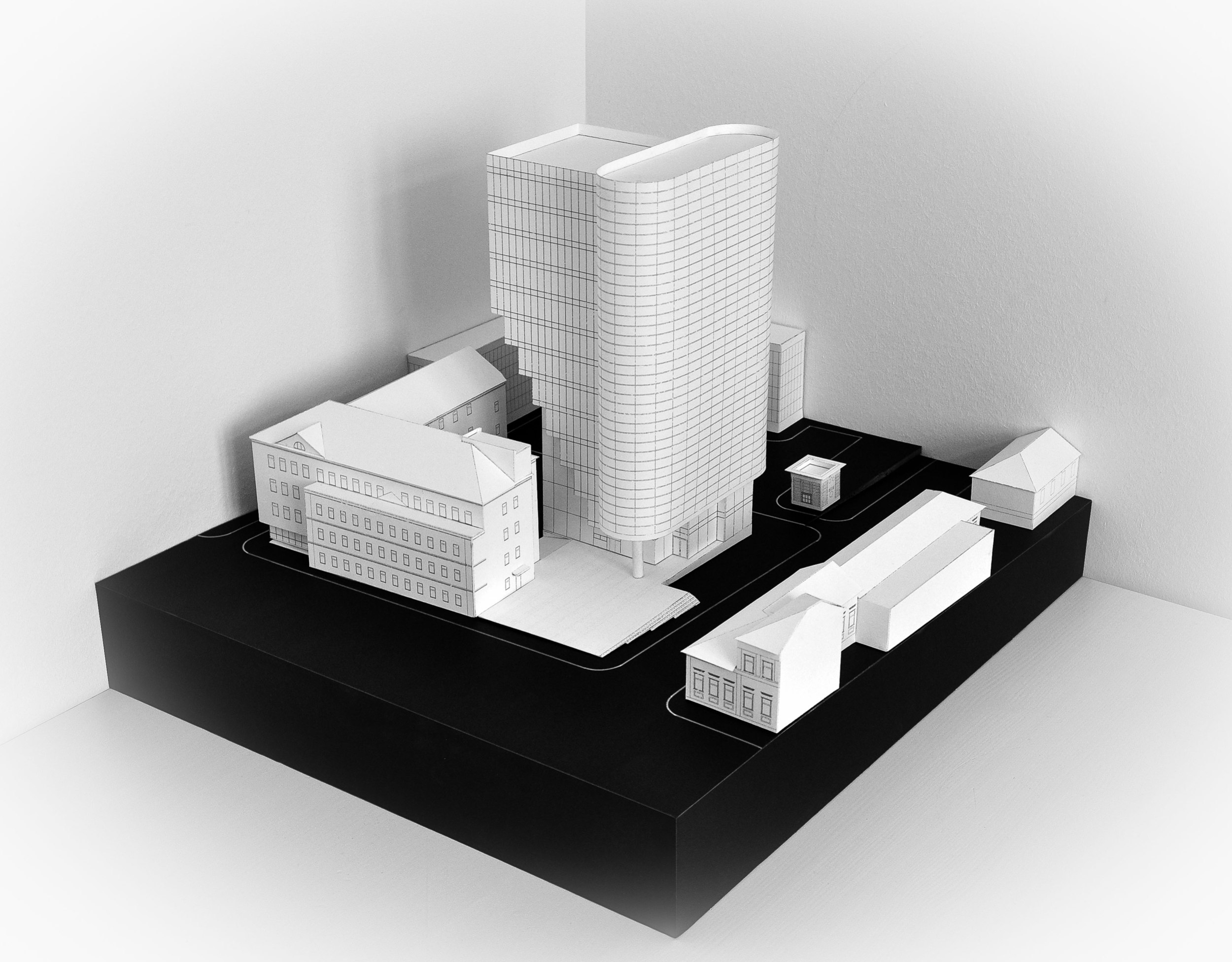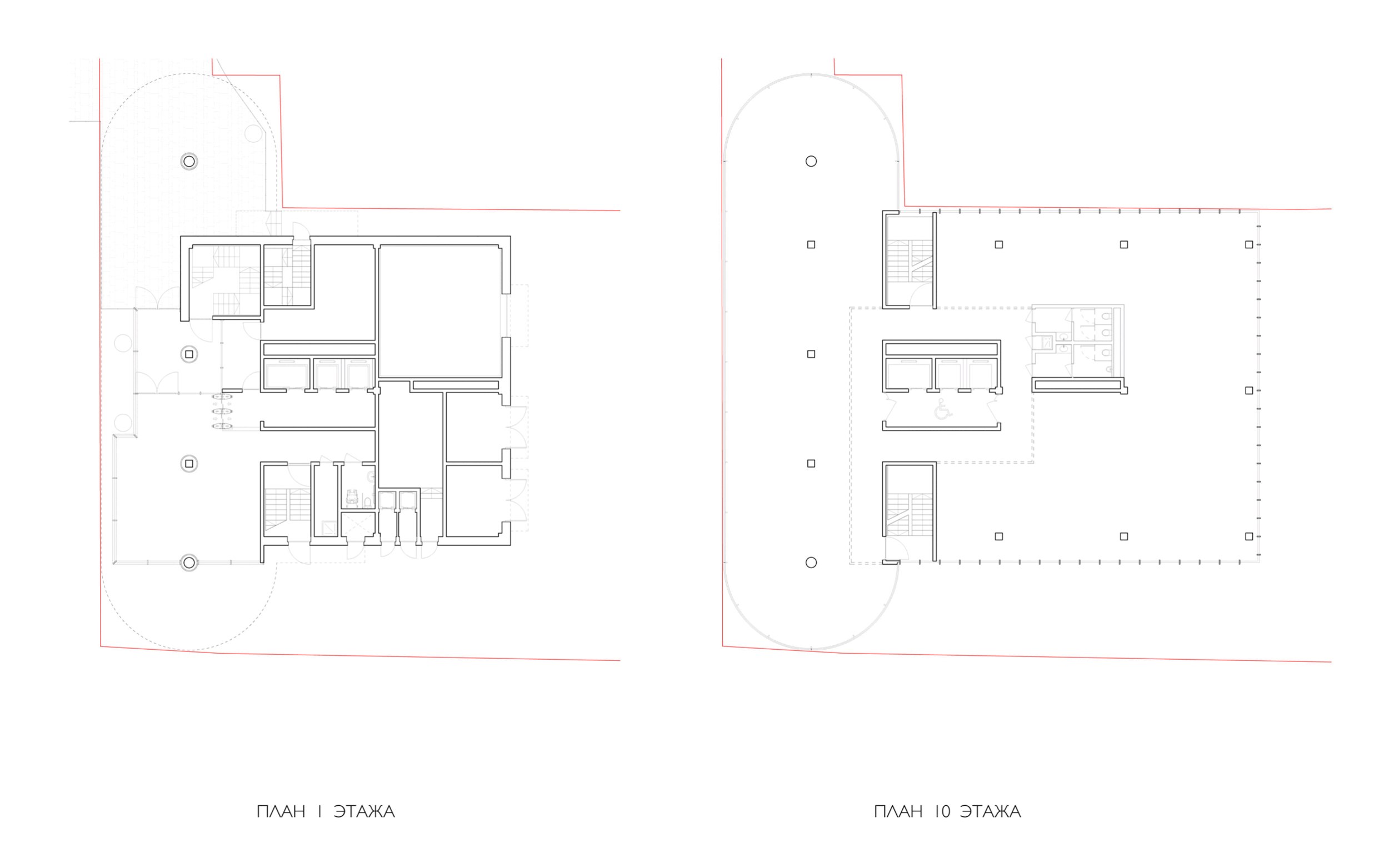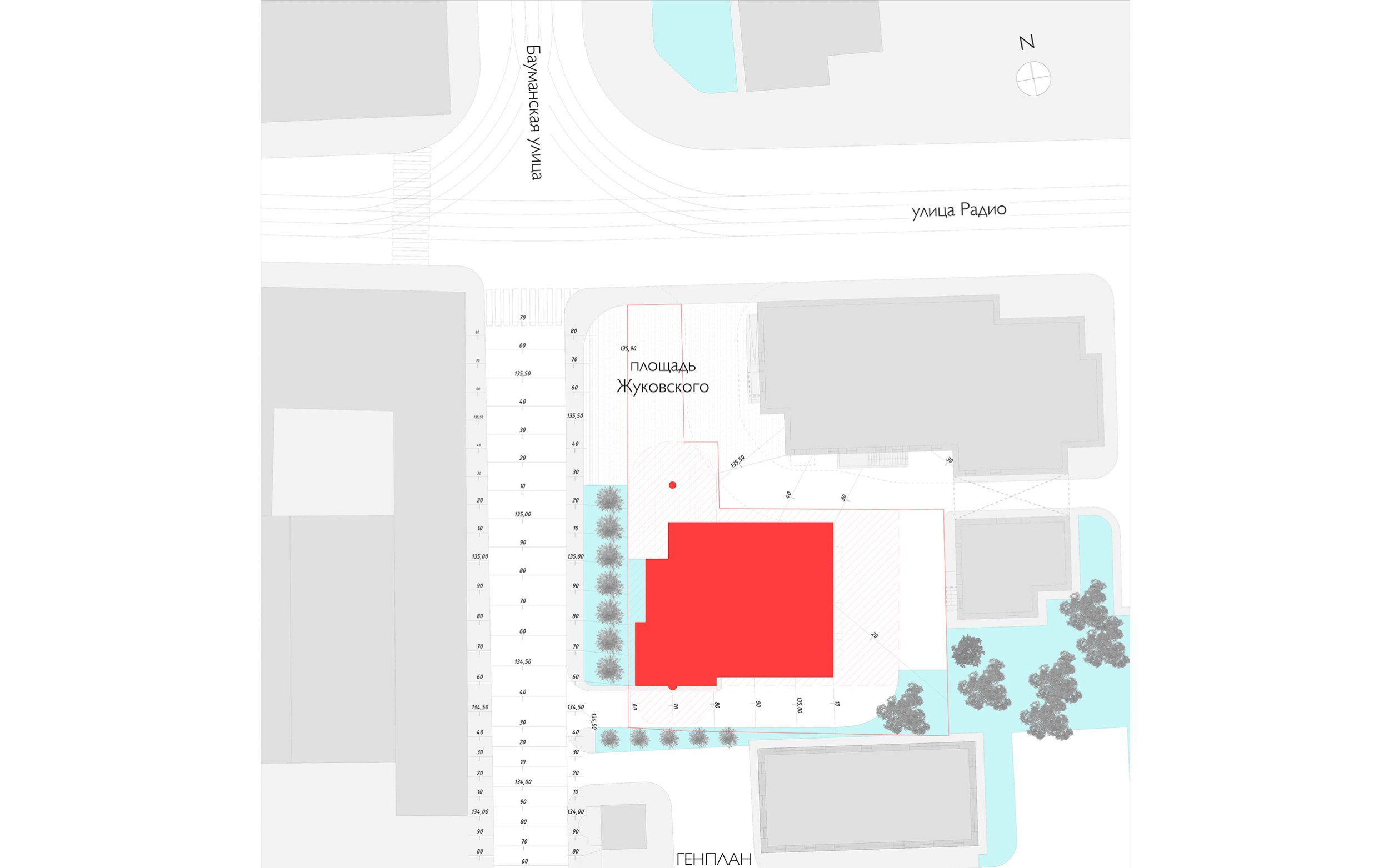 Градостроительное решение. Ориентация основного корпуса развивает пространство Бауманской улицы в направлении Яузы. От улицы Радио объём отступает, сохраняя фронт 1-4-этажной застройки. На пересечении улиц образуется новая городская площадь 22х27 метров – крайне дефицитное общественное пространство, место встреч и расставаний. На площади предлагается поставить памятник основоположнику отечественной аэро- и гидродинамики Николаю Егоровичу Жуковскому, бюст которого сейчас стоит рядом, в кустах. Если воткнуть циркуль в карту, выяснится, что Яуза течёт вокруг этой площади.
