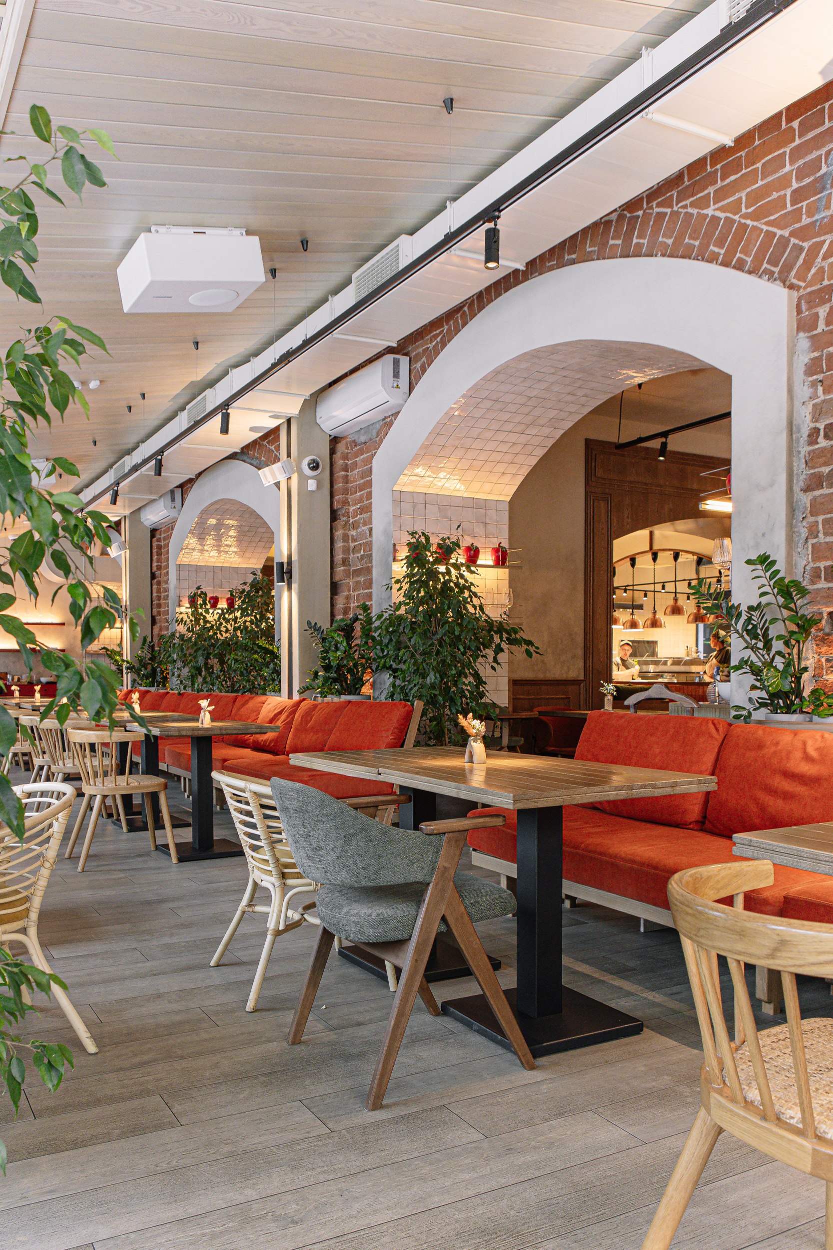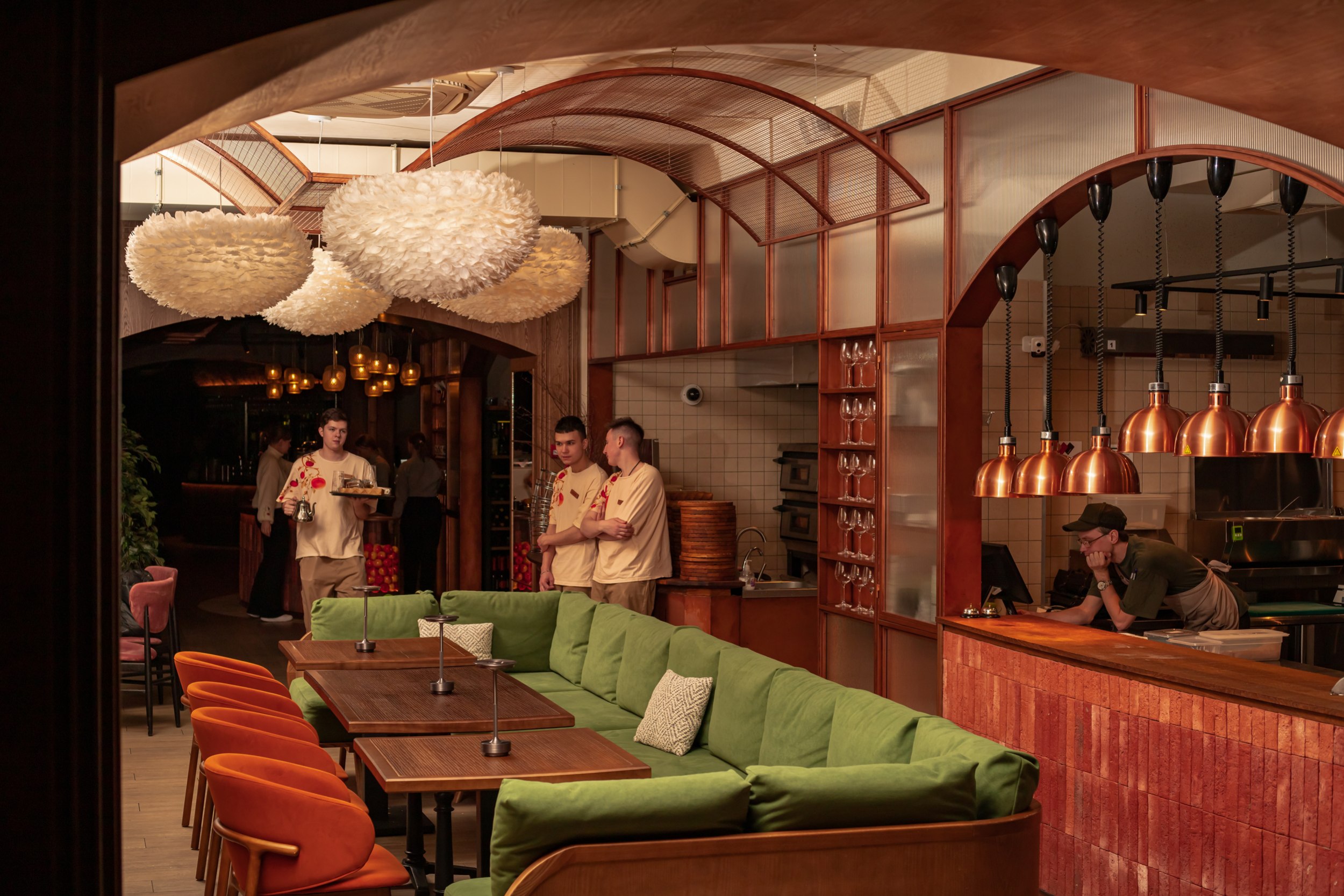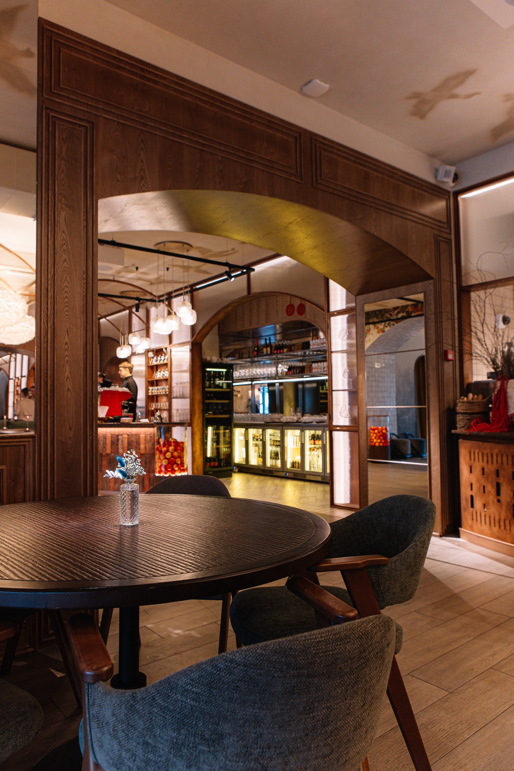 Планировочная структура организована вокруг нескольких обеденных залов с панорамными видами и логичным перетеканием пространств, включая основной зал, кафе-бар, открытую кухню, детскую зону и веранду. Такое решение усиливает связь интерьера с городским контекстом и позволяет гибко работать с разными сценариями посещения: от спокойных семейных обедов до встреч большими компаниями и проведения мероприятий. Посадка преимущественно модульная, с возможностью комфортного размещения гостей компаниями на 2, 4, 6 и 8 человек, при этом основные секции остаются визуально открытыми и объединенными, сохраняя ощущение единого пространства. Архитектурная концепция интерьера строится на ощущении «вне времени», – пространстве, которое будет актуально и через 10-20 лет. Важную роль играют просматриваемые проемы на открытую кухню с видом на живое пламя, печь и камин, облицованные глазурной плиткой, а также декоративно подчеркнутое оборудование. Огонь, свет и фактура формируют эмоциональное ядро интерьера и усиливают связь с идеей кухни на огне как одной из ключевых ценностей проекта.