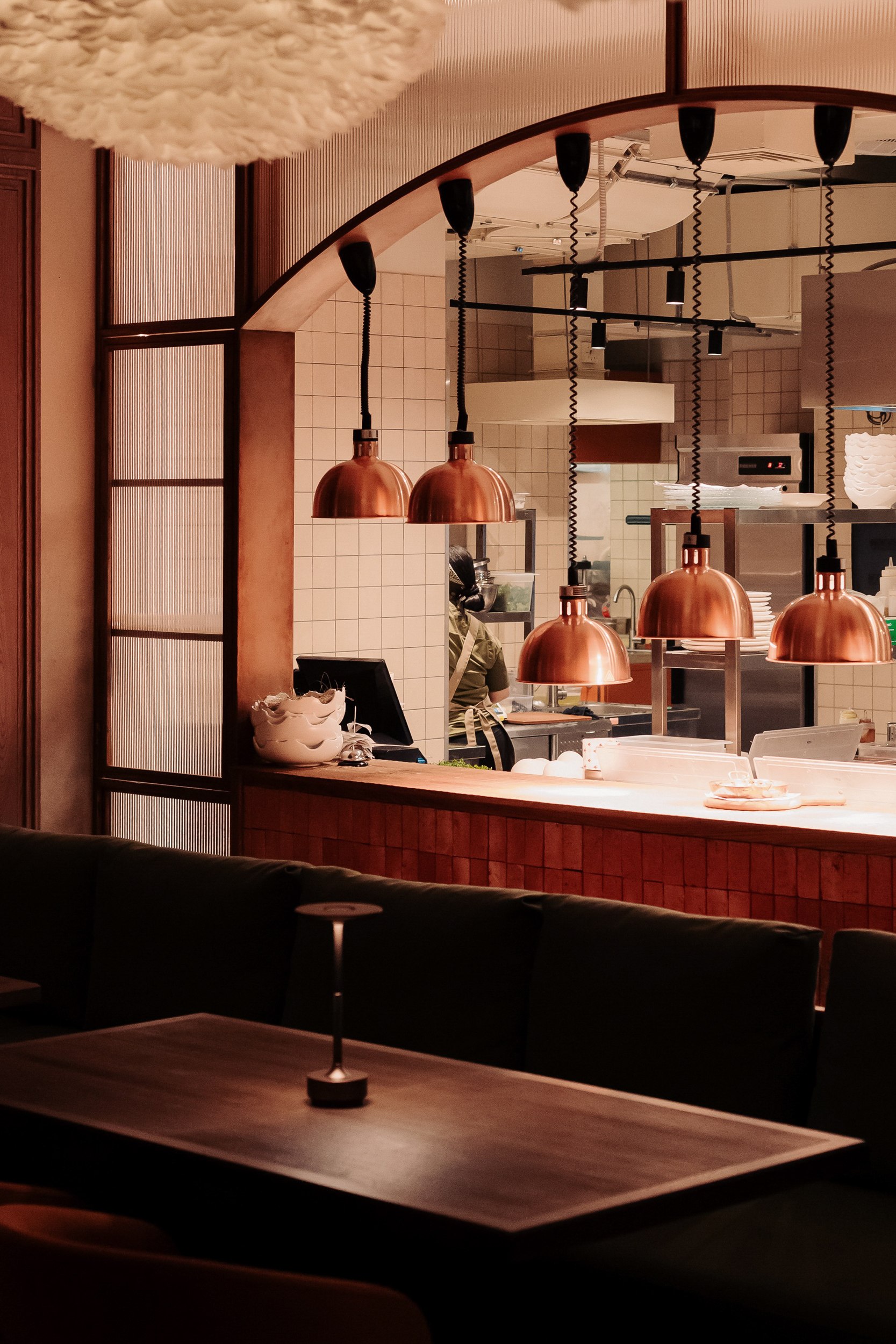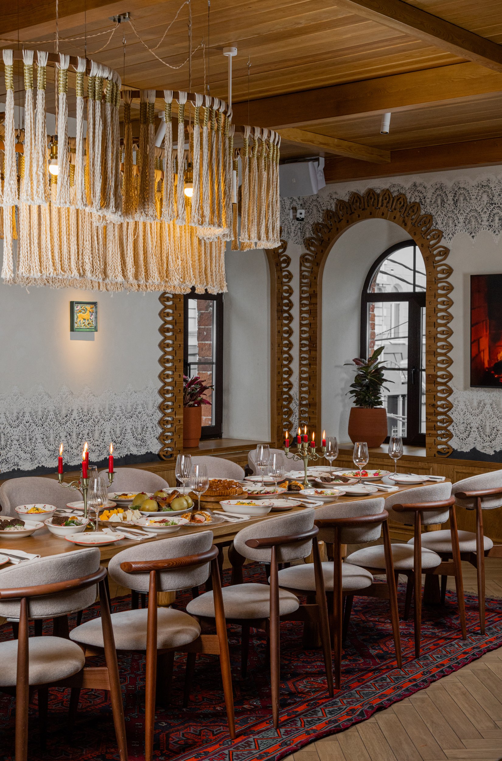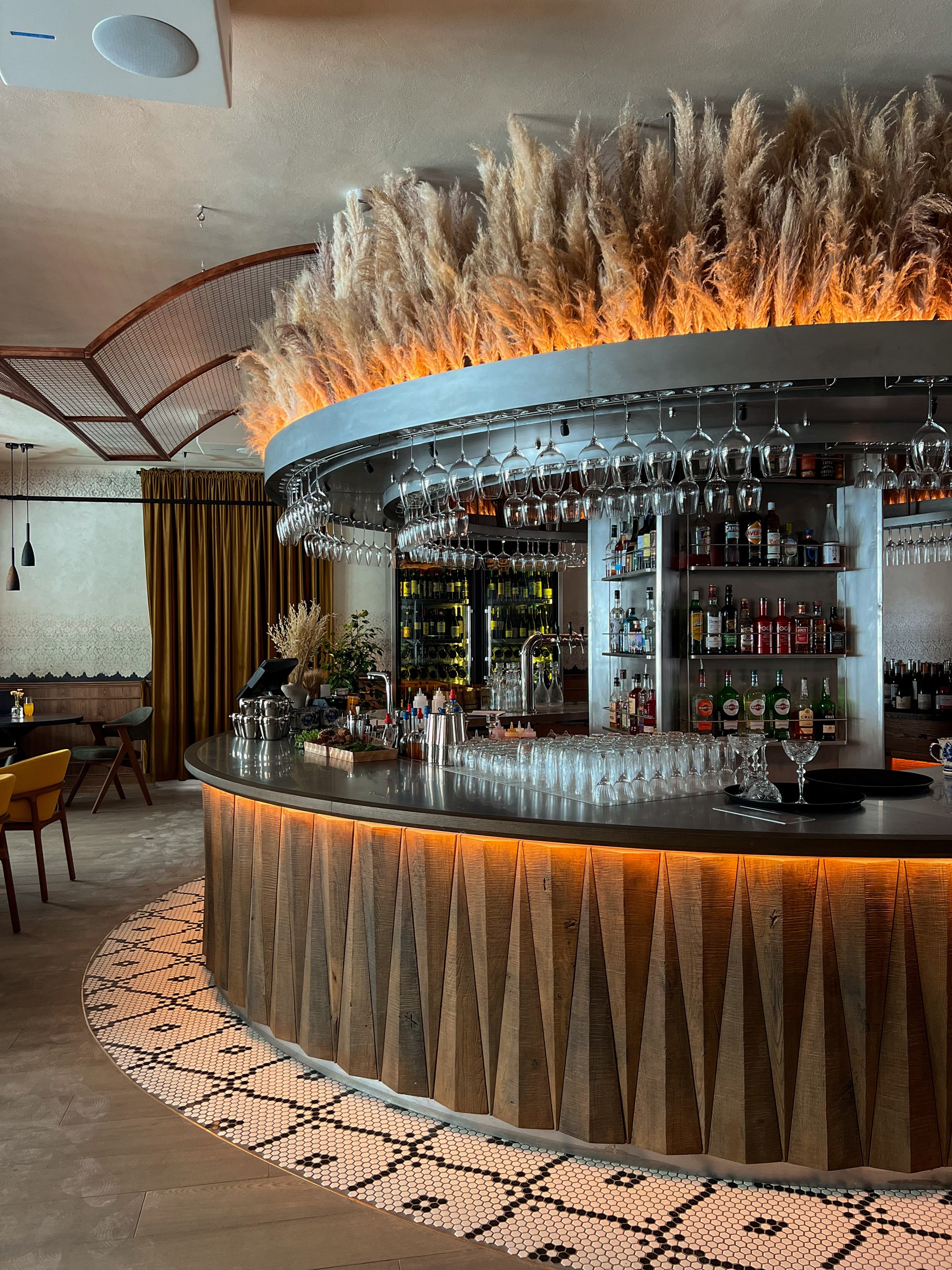 Планировочная структура организована вокруг нескольких обеденных залов с панорамными видами и логичным перетеканием пространств, включая основной зал, кафе-бар, открытую кухню, детскую зону и веранду. Такое решение усиливает связь интерьера с городским контекстом и позволяет гибко работать с разными сценариями посещения: от спокойных семейных обедов до встреч большими компаниями и проведения мероприятий. Посадка преимущественно модульная, с возможностью комфортного размещения гостей компаниями на 2, 4, 6 и 8 человек, при этом основные секции остаются визуально открытыми и объединенными, сохраняя ощущение единого пространства. Архитектурная концепция интерьера строится на ощущении «вне времени», – пространстве, которое будет актуально и через 10-20 лет. Важную роль играют просматриваемые проемы на открытую кухню с видом на живое пламя, печь и камин, облицованные глазурной плиткой, а также декоративно подчеркнутое оборудование. Огонь, свет и фактура формируют эмоциональное ядро интерьера и усиливают связь с идеей кухни на огне как одной из ключевых ценностей проекта.