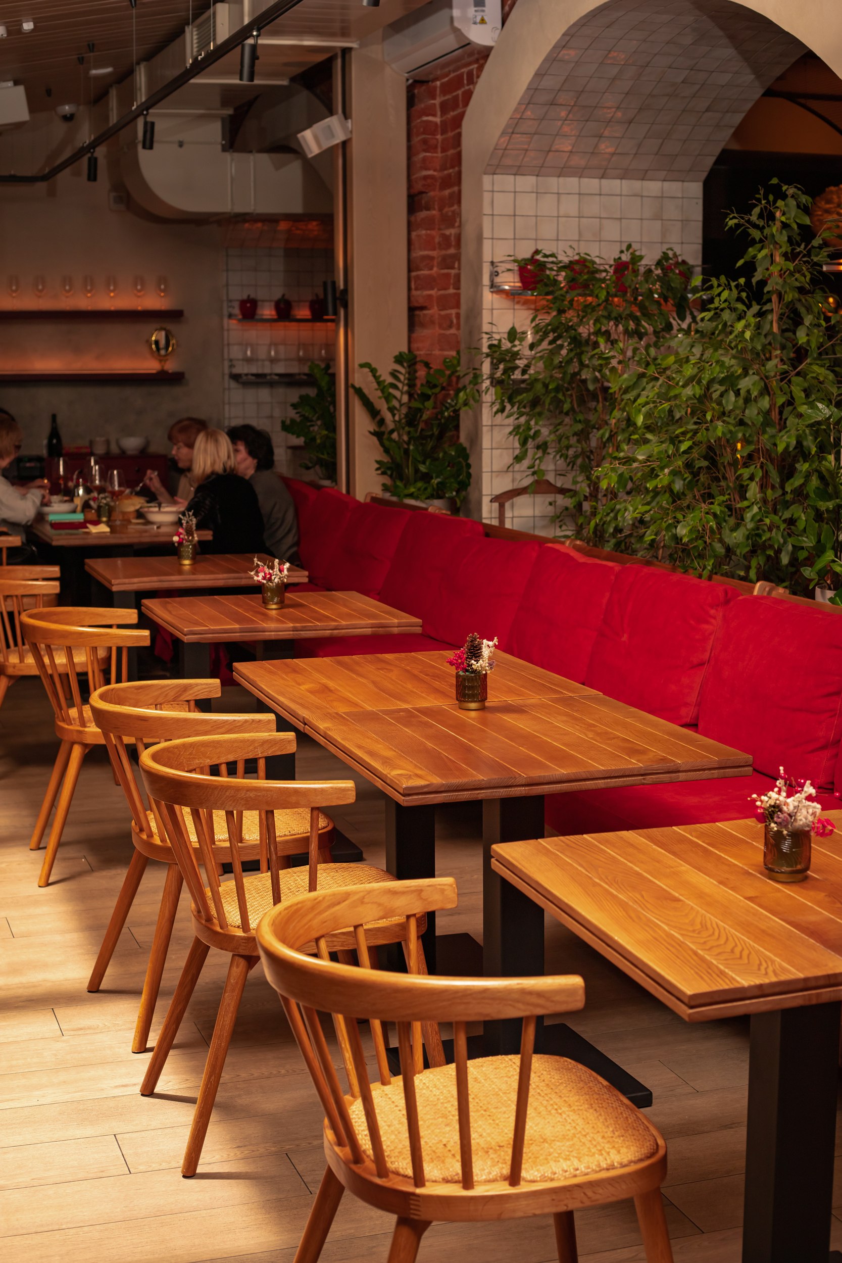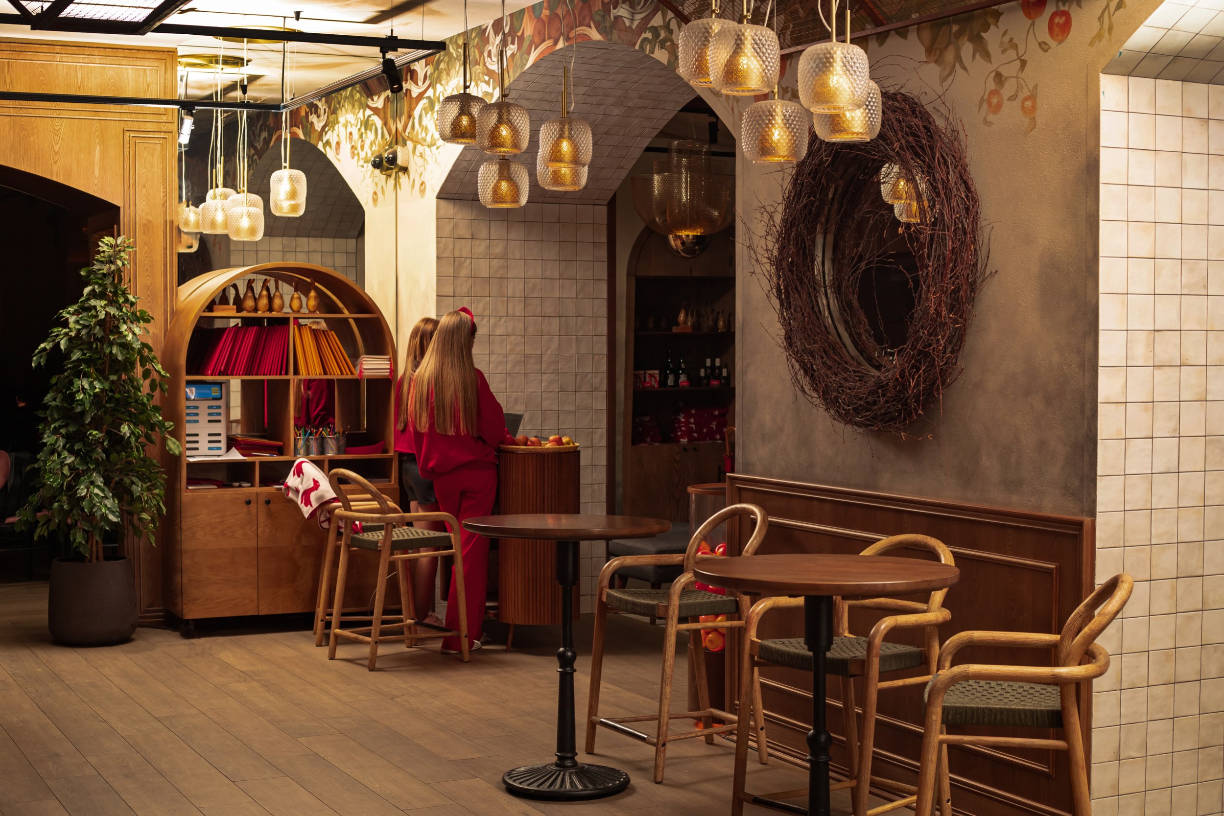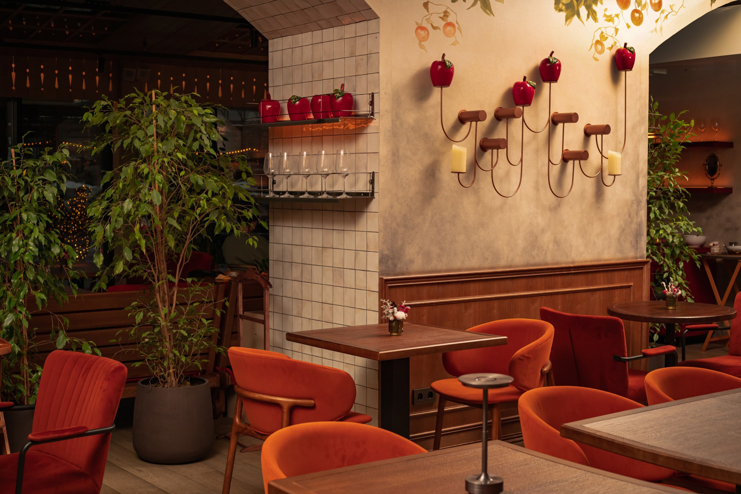 Отдельное внимание уделено фотогеничности интерьера и сценариям пребывания гостей в течение дня: пространство визуально вытянуто по высоте, насыщенность декором выдержана на сбалансированном уровне без перегруженности, озеленение мягко интегрировано в интерьер, особенно на веранде. Детская зона размещена в отдельном помещении рядом с лестницей, что делает пребывание семей с детьми более комфортным.