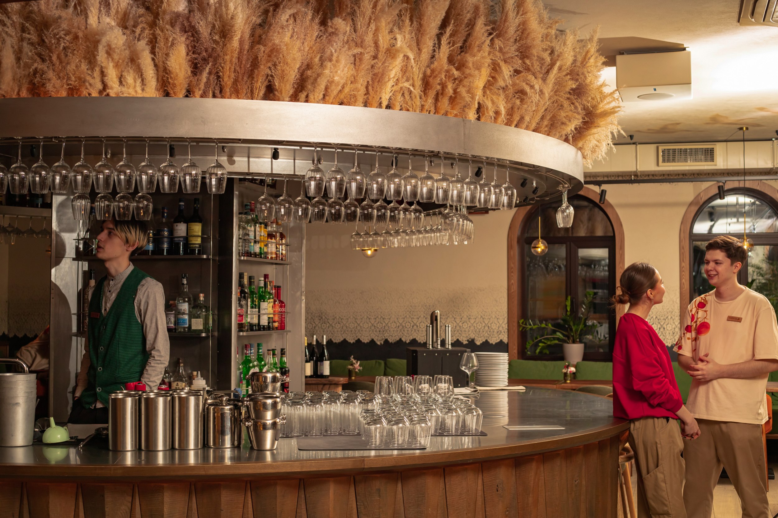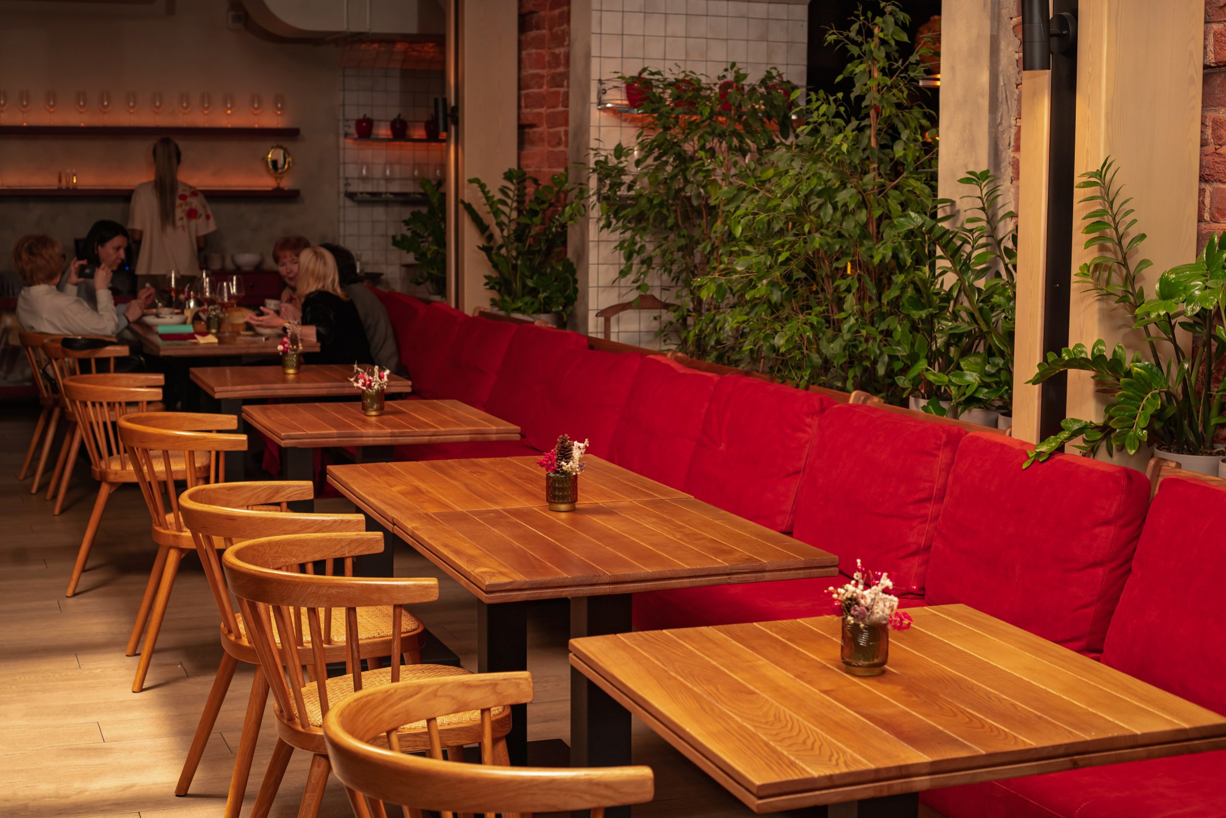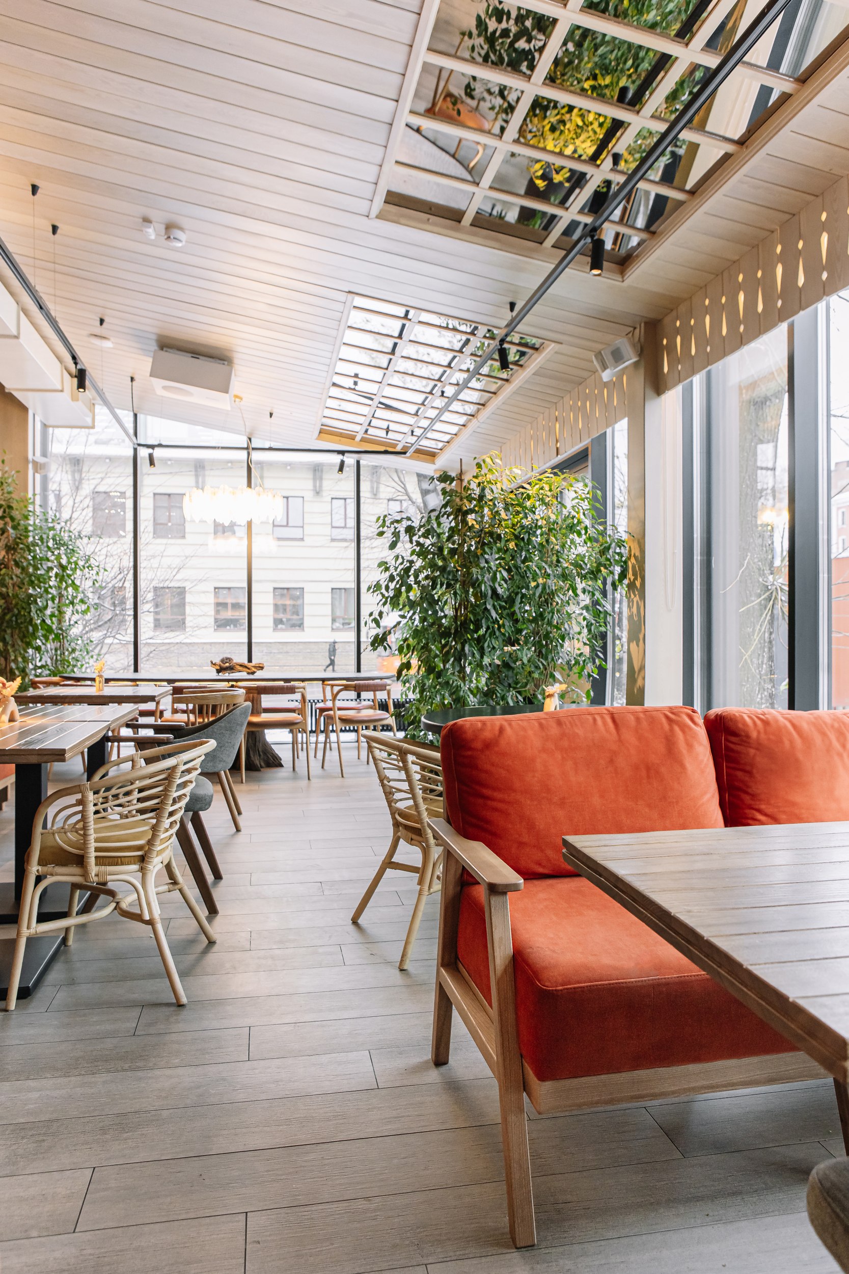 Отдельное внимание уделено фотогеничности интерьера и сценариям пребывания гостей в течение дня: пространство визуально вытянуто по высоте, насыщенность декором выдержана на сбалансированном уровне без перегруженности, озеленение мягко интегрировано в интерьер, особенно на веранде. Детская зона размещена в отдельном помещении рядом с лестницей, что делает пребывание семей с детьми более комфортным.