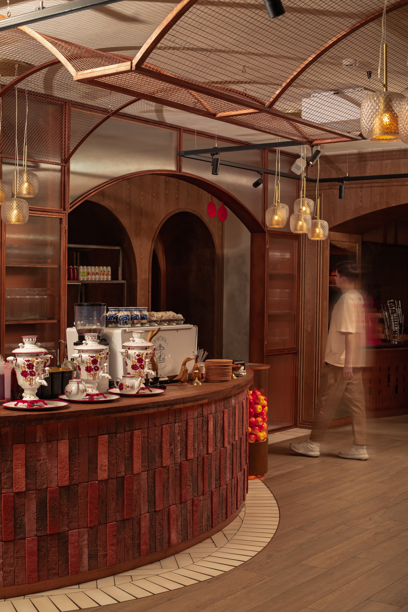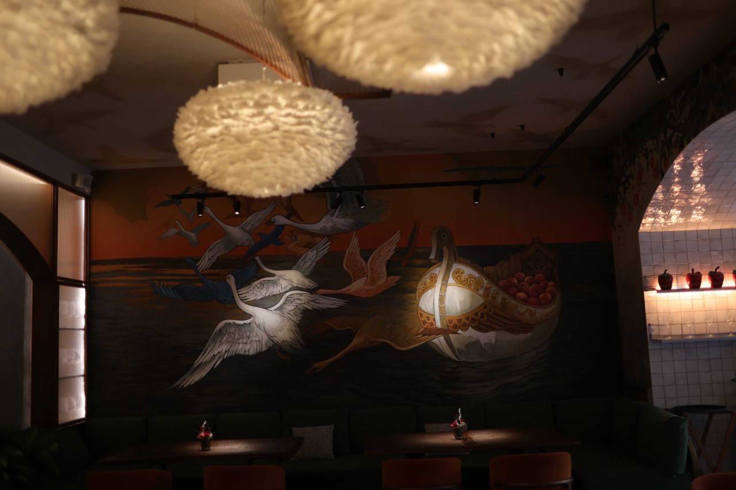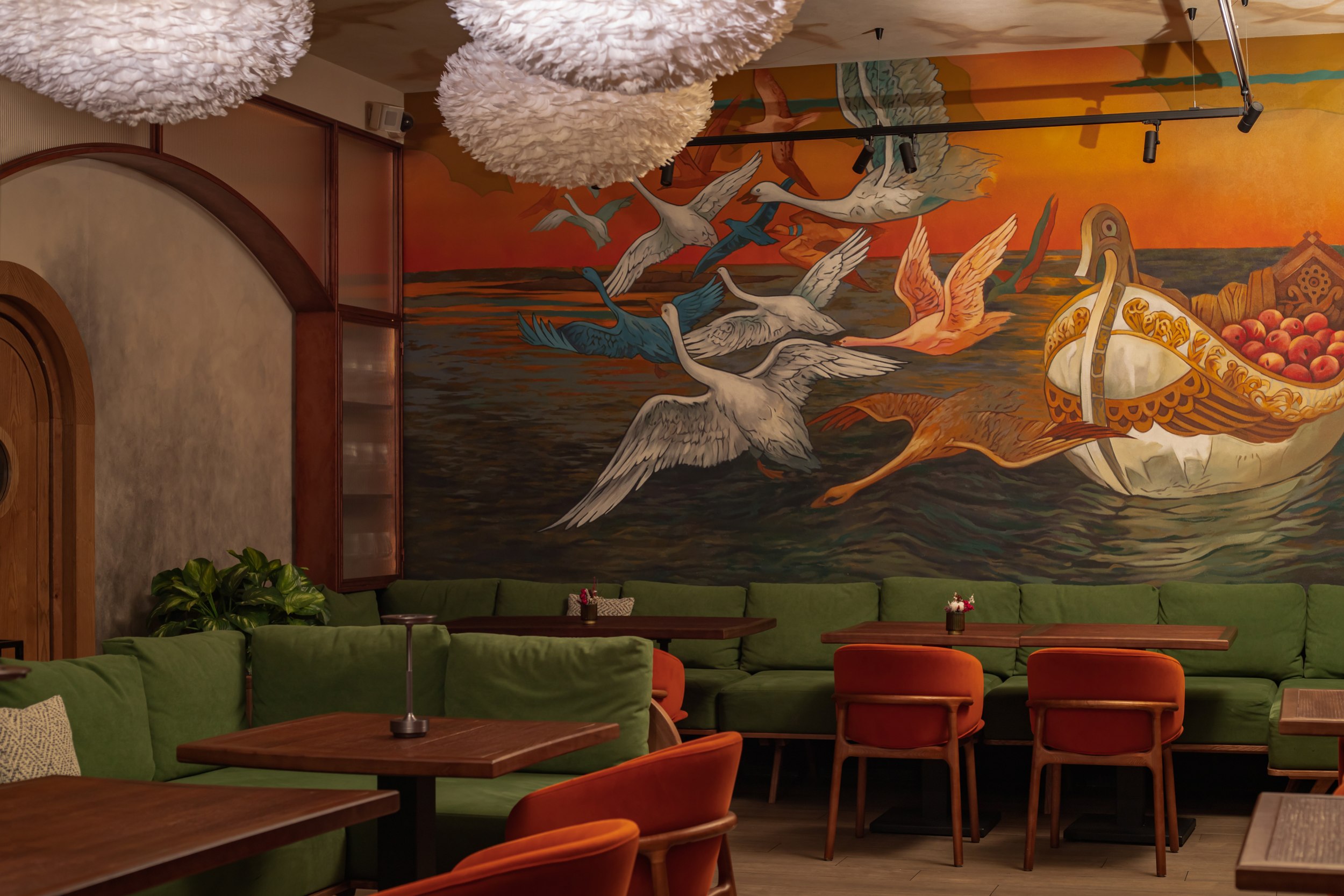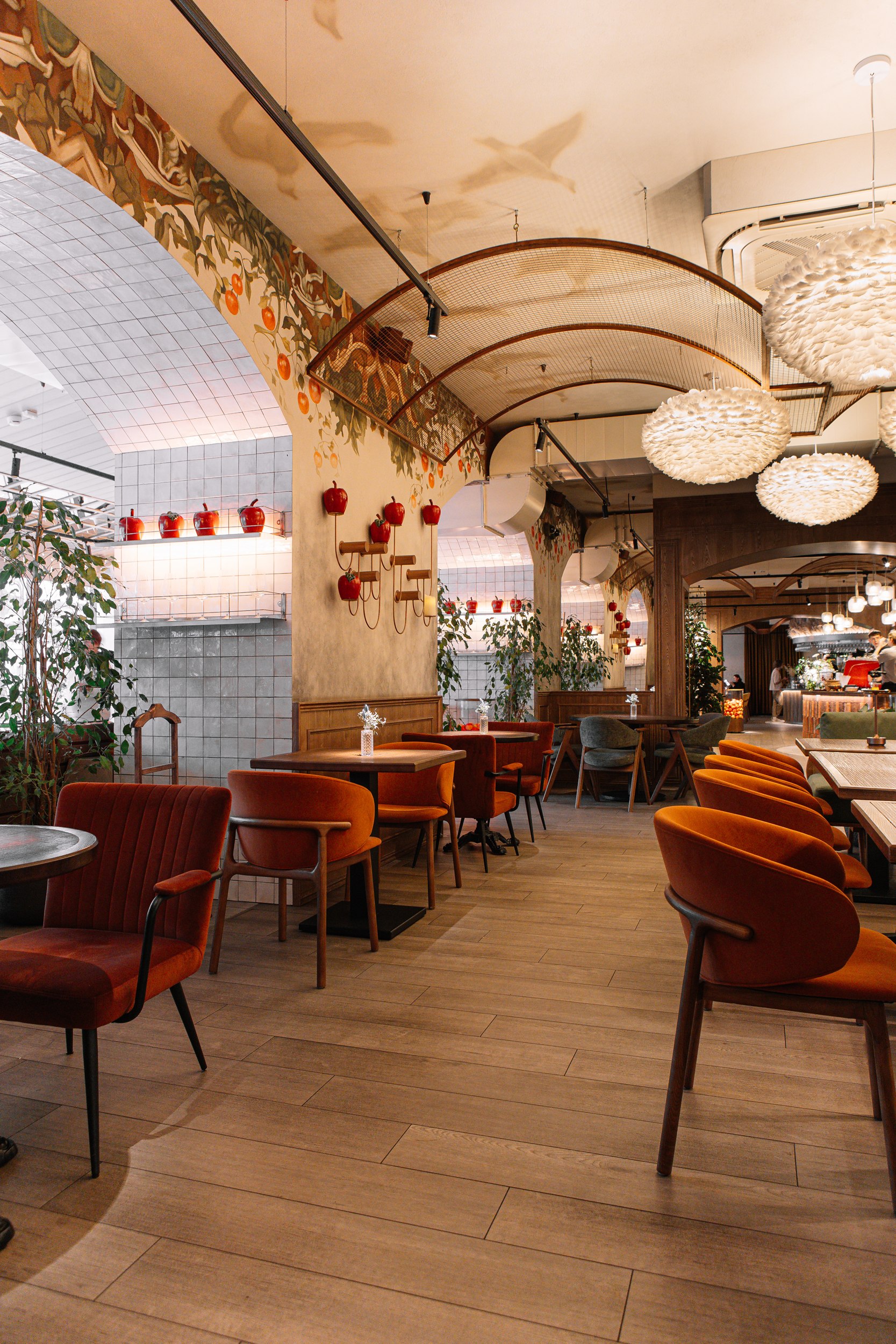 Гранд-кафе «Гусь в яблоках» расположено в историческом центре Нижнего Новгорода, на Рождественской улице, в зоне активного туристического и пешеходного трафика. Проект интерьера построен на сочетании современного ресторанного формата и образных отсылок к традиционной русской гастрономии, переосмысленных через призму локальной идентичности и атмосферы «с огоньком». Эта идея становится сквозной для всего пространства и задает характер заведению – живой и теплый, наполненный движением и огнем как символом кухни и гостеприимства.