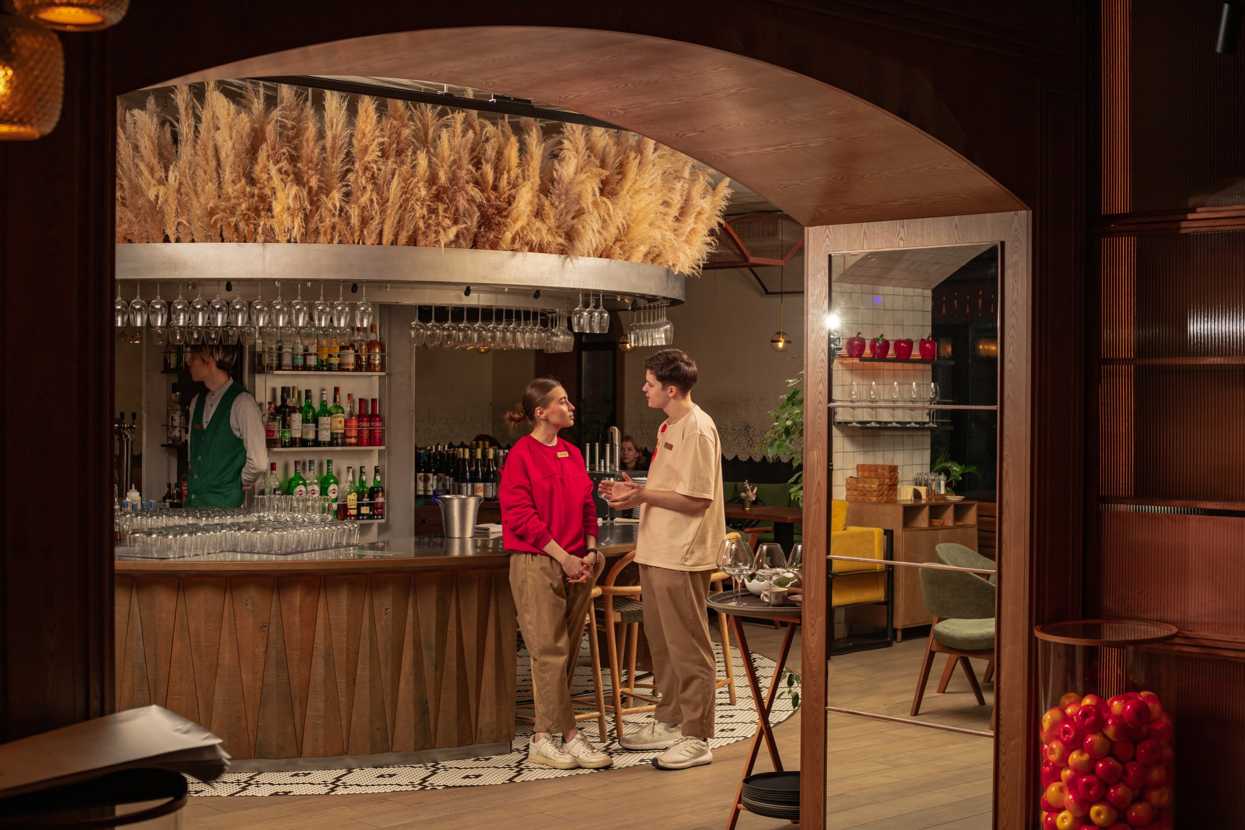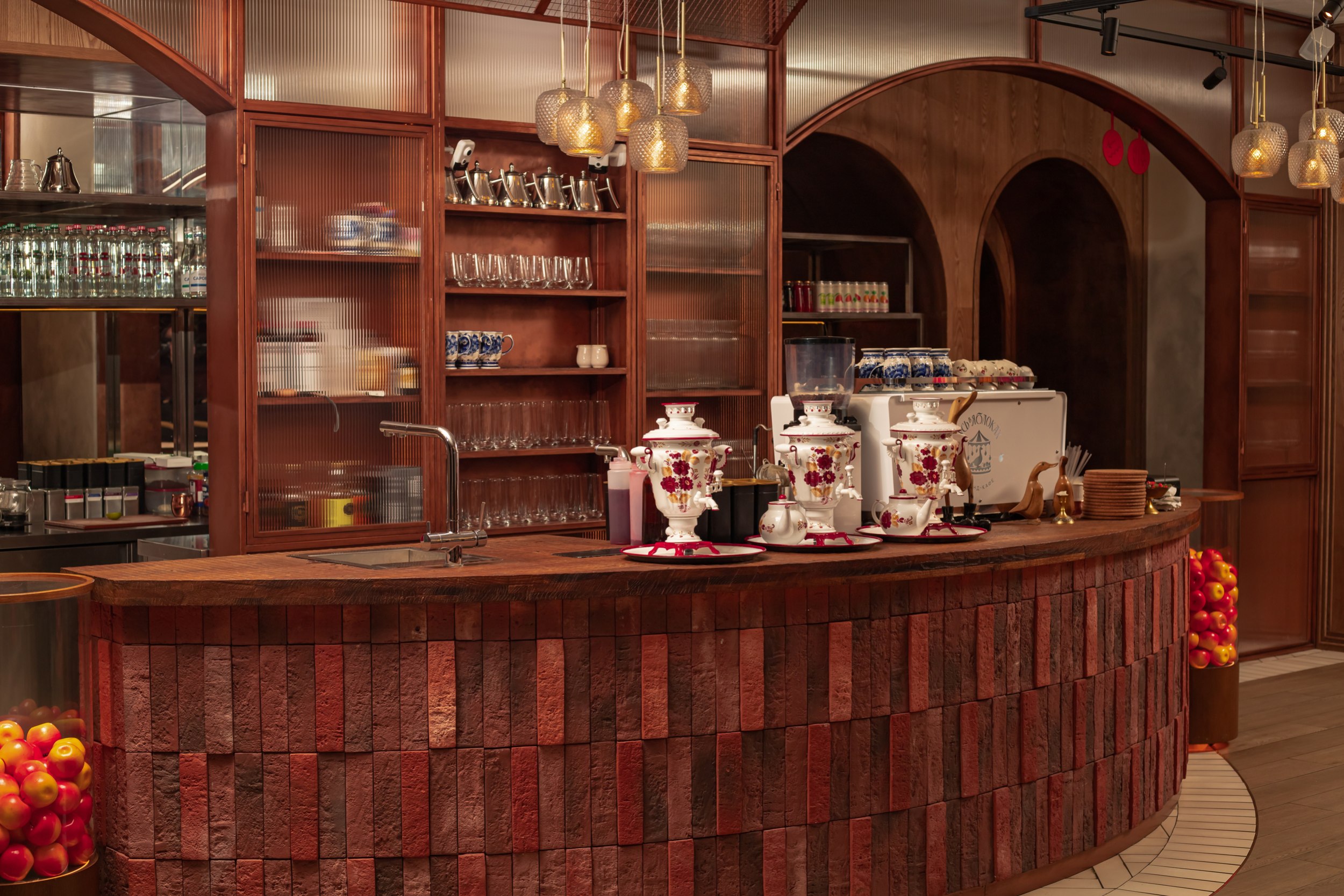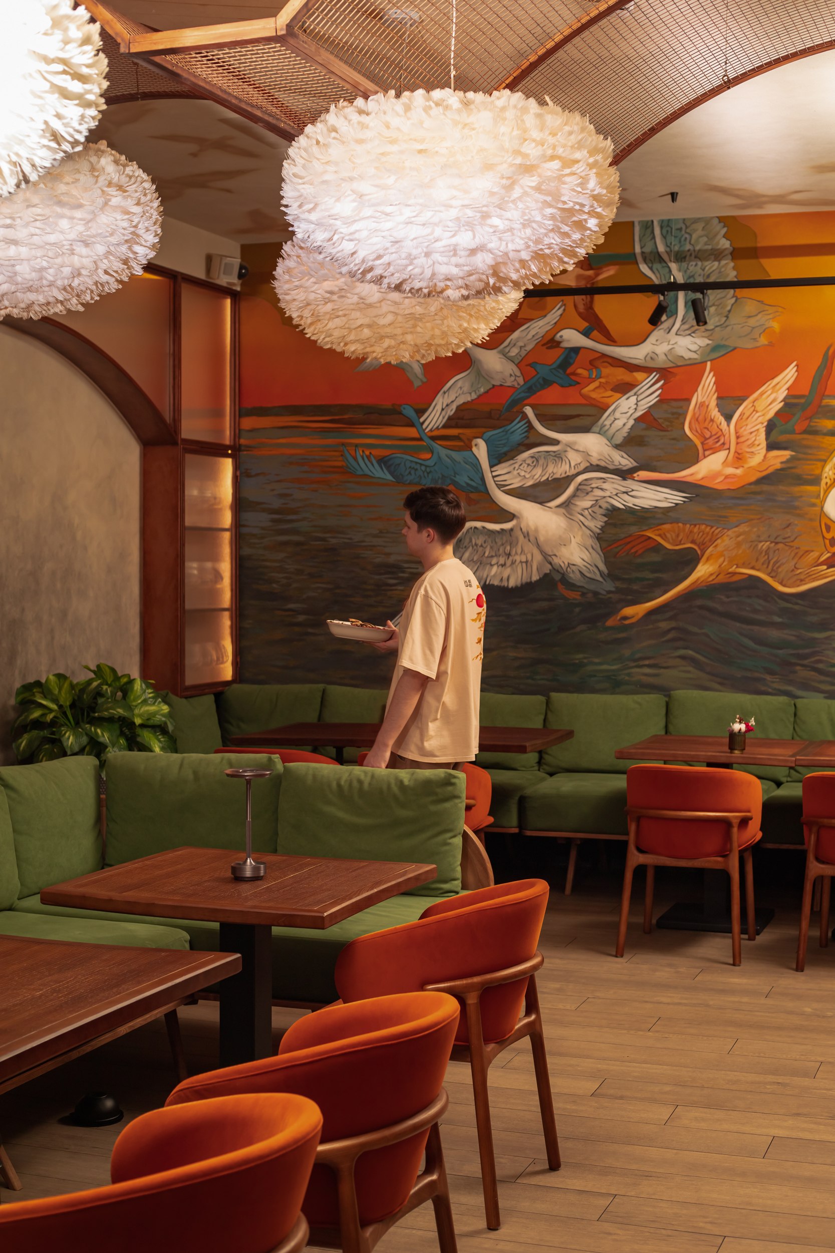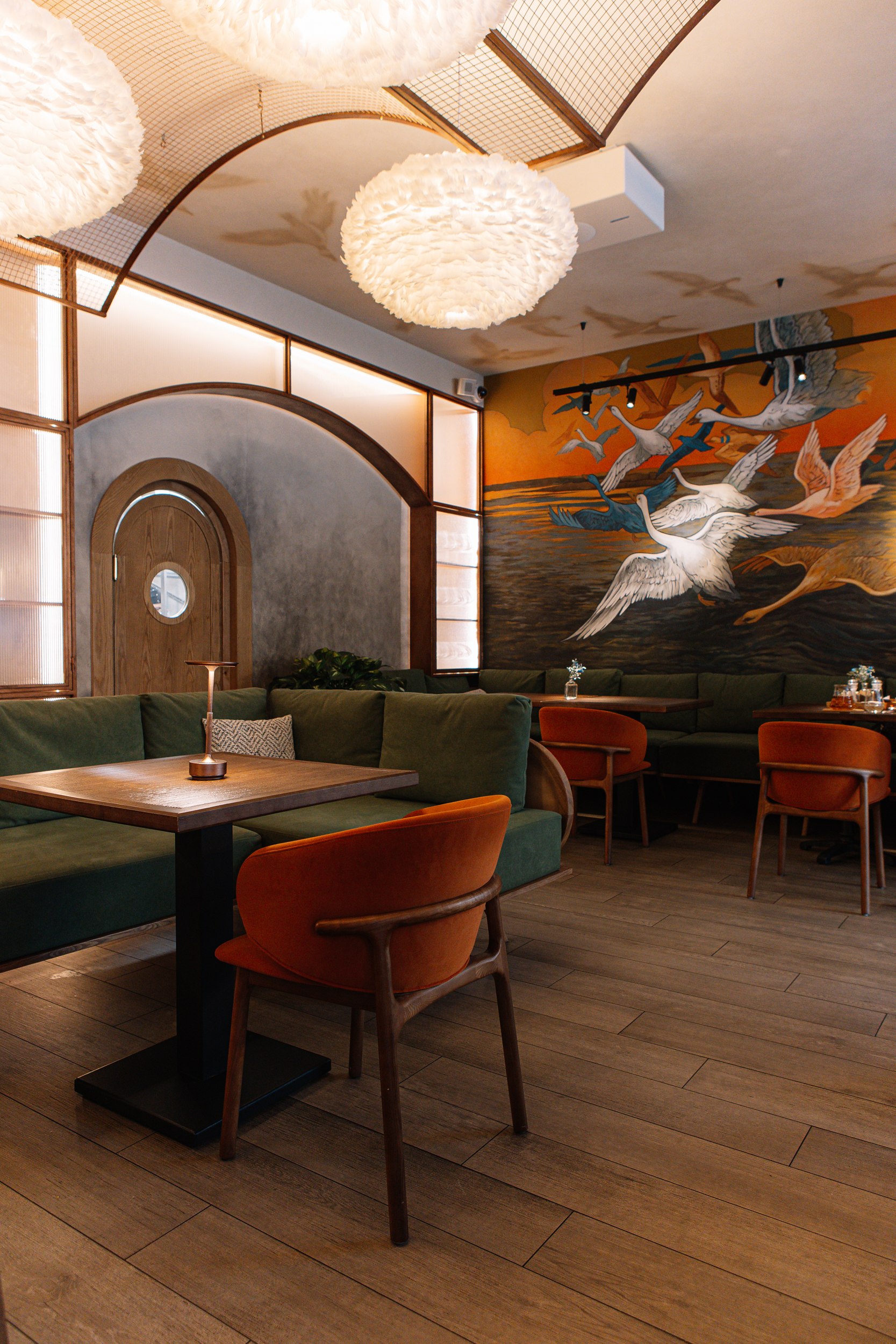 Гранд-кафе «Гусь в яблоках» расположено в историческом центре Нижнего Новгорода, на Рождественской улице, в зоне активного туристического и пешеходного трафика. Проект интерьера построен на сочетании современного ресторанного формата и образных отсылок к традиционной русской гастрономии, переосмысленных через призму локальной идентичности и атмосферы «с огоньком». Эта идея становится сквозной для всего пространства и задает характер заведению – живой и теплый, наполненный движением и огнем как символом кухни и гостеприимства.