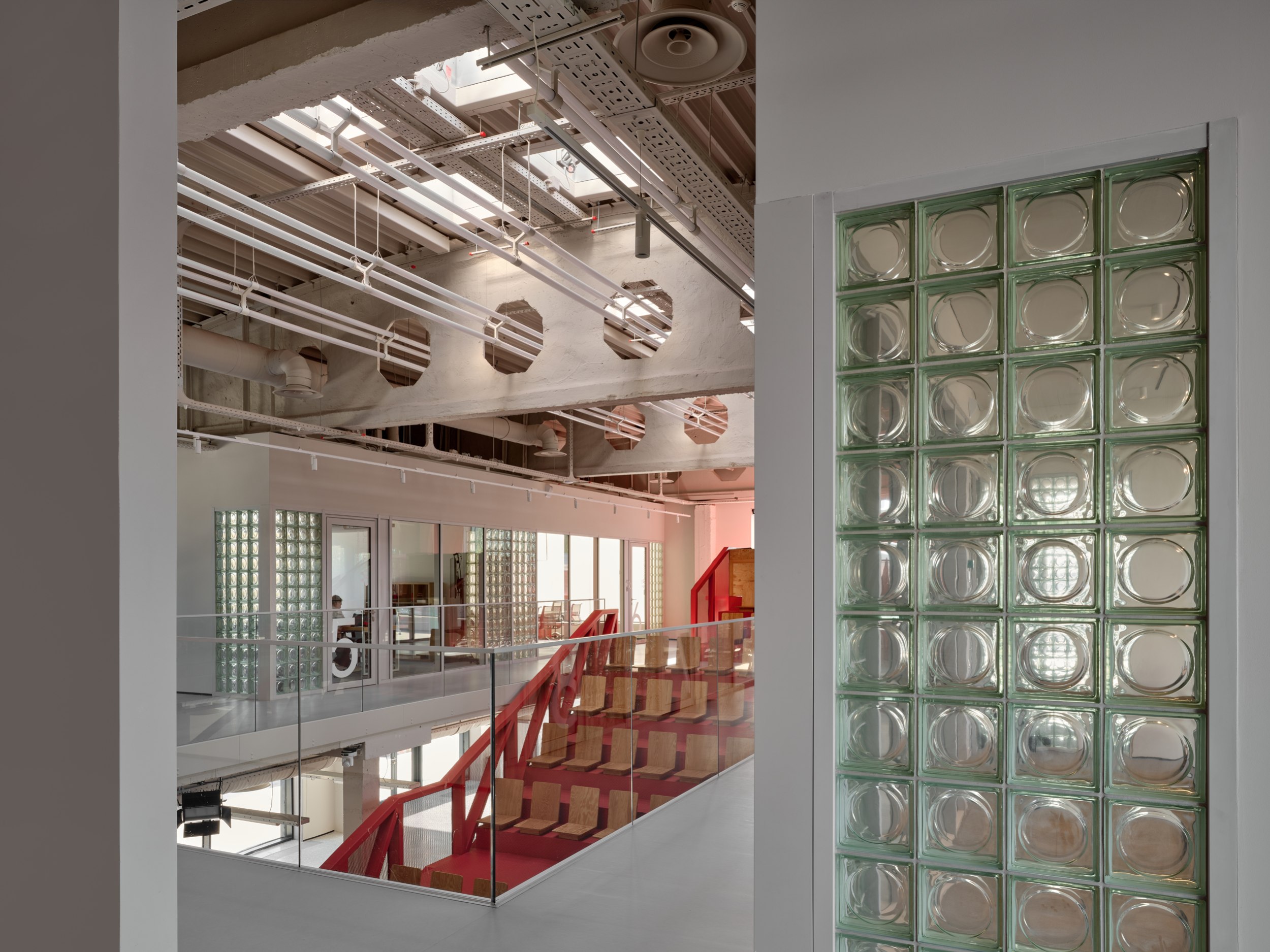 Основной и самый выразительный элемент пространства – красный инженерный амфитеатр, соединяющий первый и второй этажи. Он вмещает до 50 посадочных мест и служит одновременно местом для лекций, встреч и неформального общения.