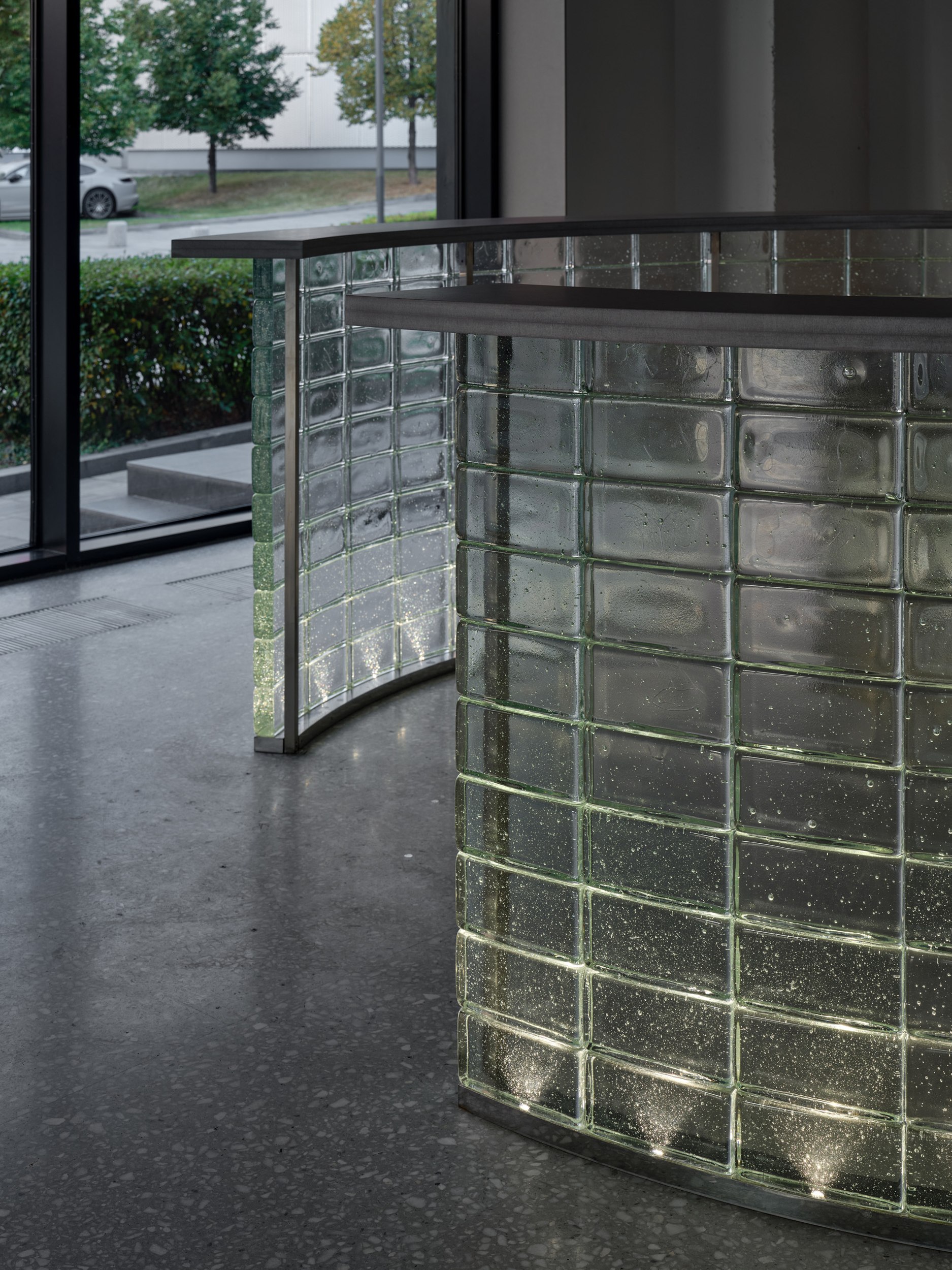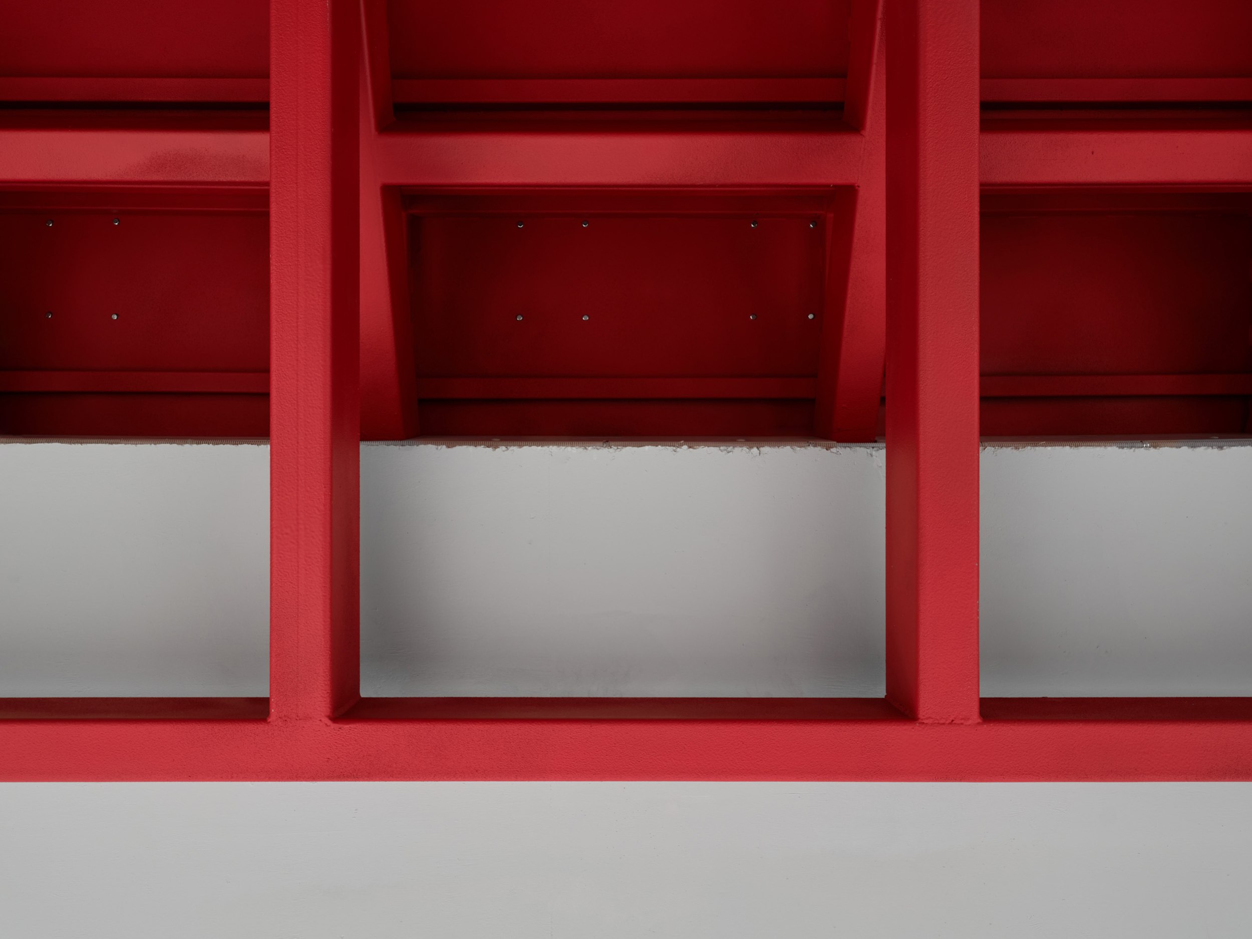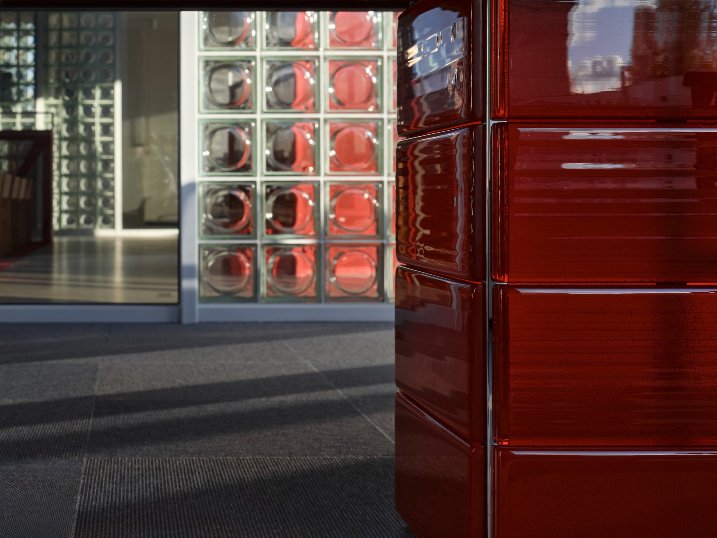 Всё пространство решено в спокойной монохромной тепло-серой гамме –нейтральный фон, на котором особенно эффектно звучат несколько ярких красных акцентов. Такой приём подчёркивает лаконичность архитектурного решения и усиливает эмоциональное воздействие главного элемента.