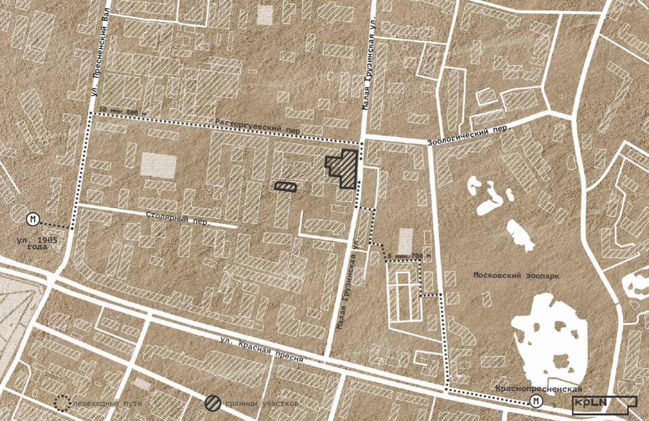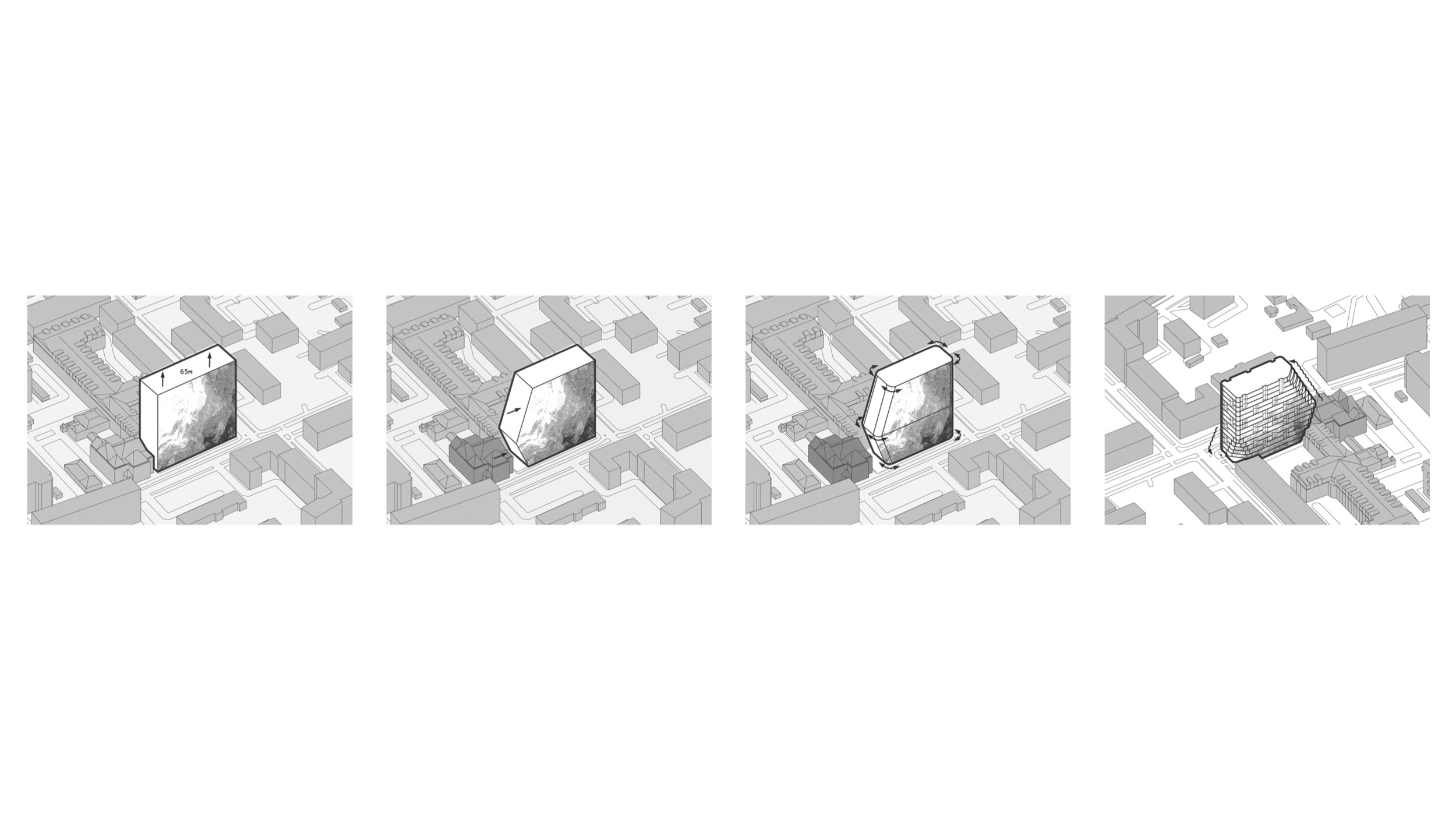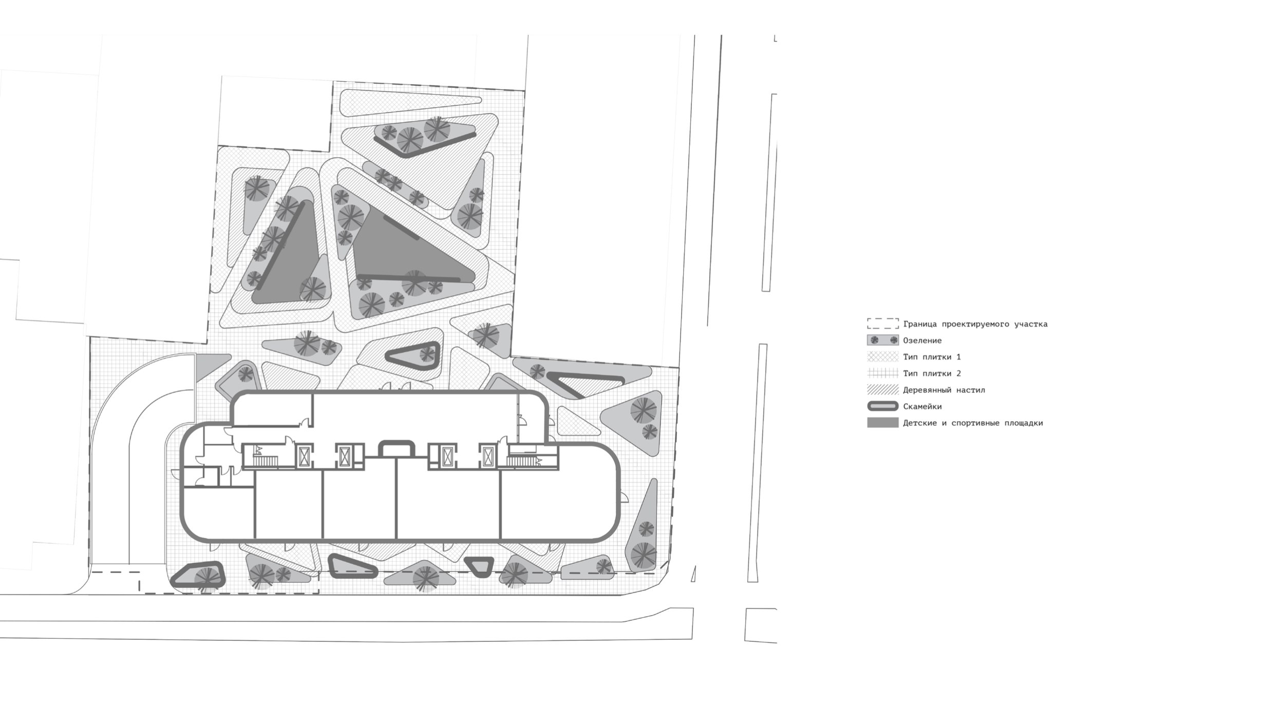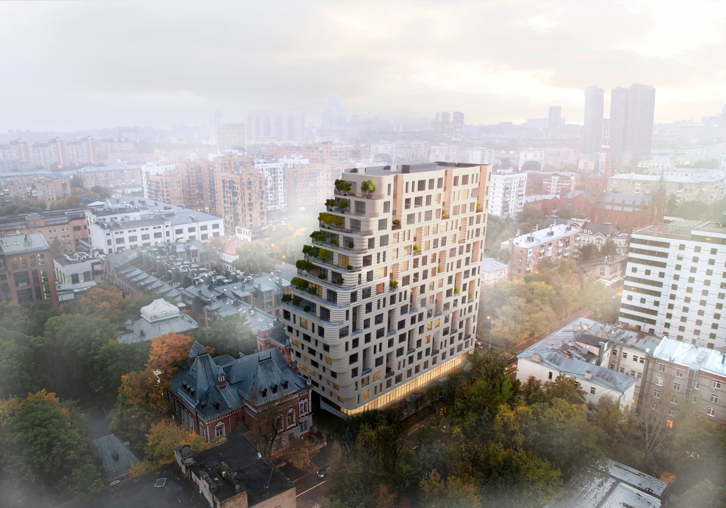 Объемно–пространственная композиция сформирована как реакция на контекст. Скругление угла обращено в сторону здания Государственного биологического музея имени Климента Аркадьевича Тимирязева. Смещение этажных плит по вертикали создает ритмичный силуэт, обеспечивает образование террас и визуально выделяет парадный вход.