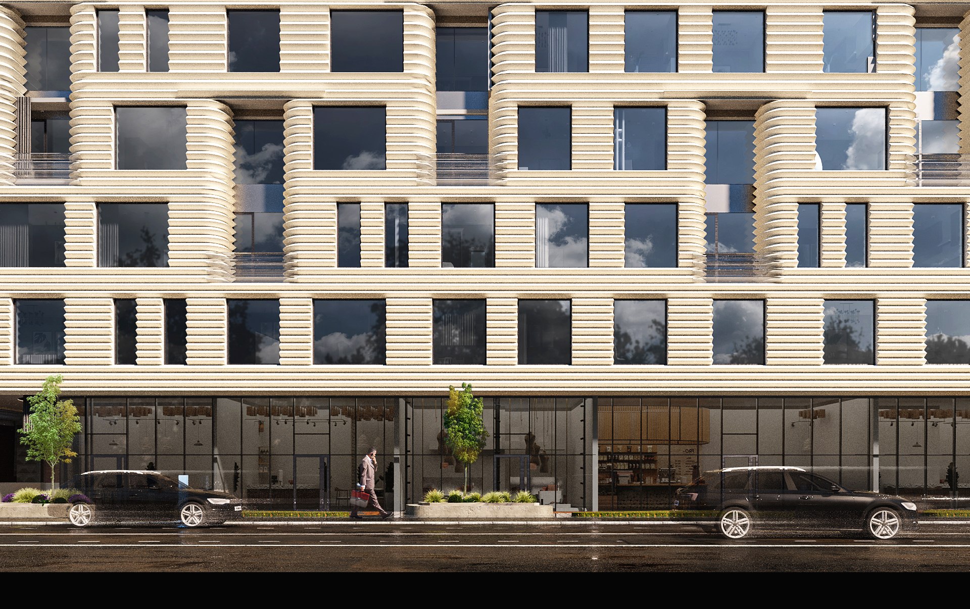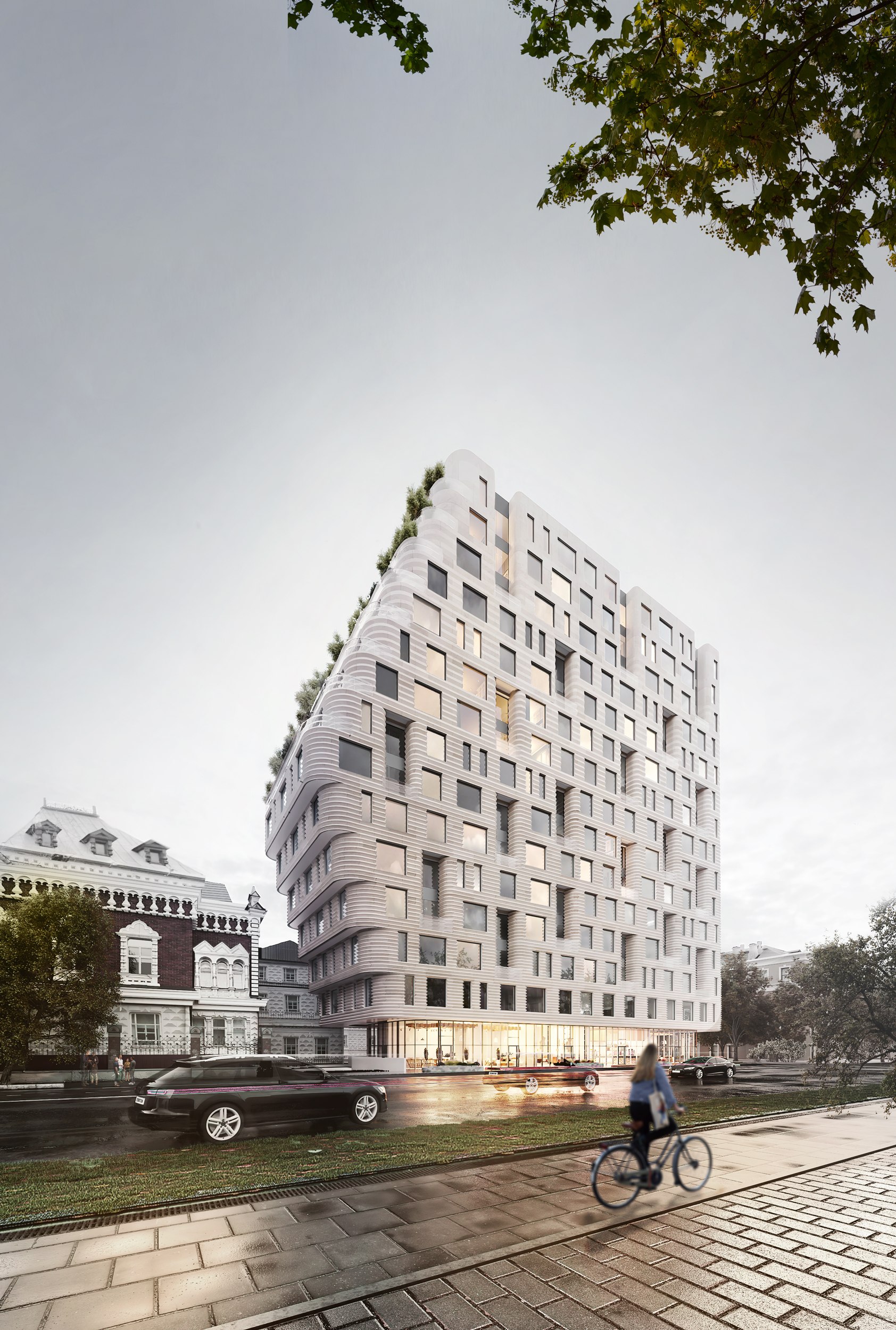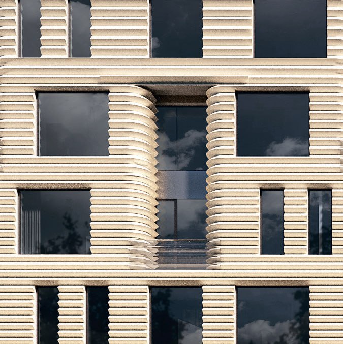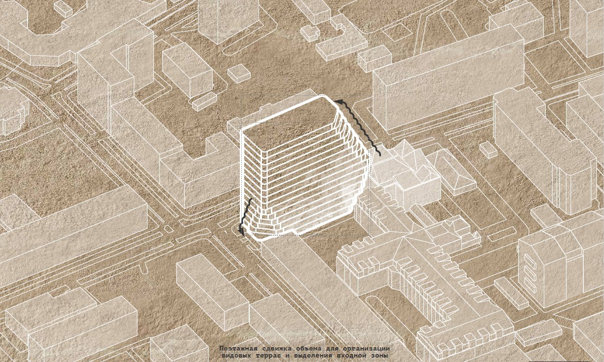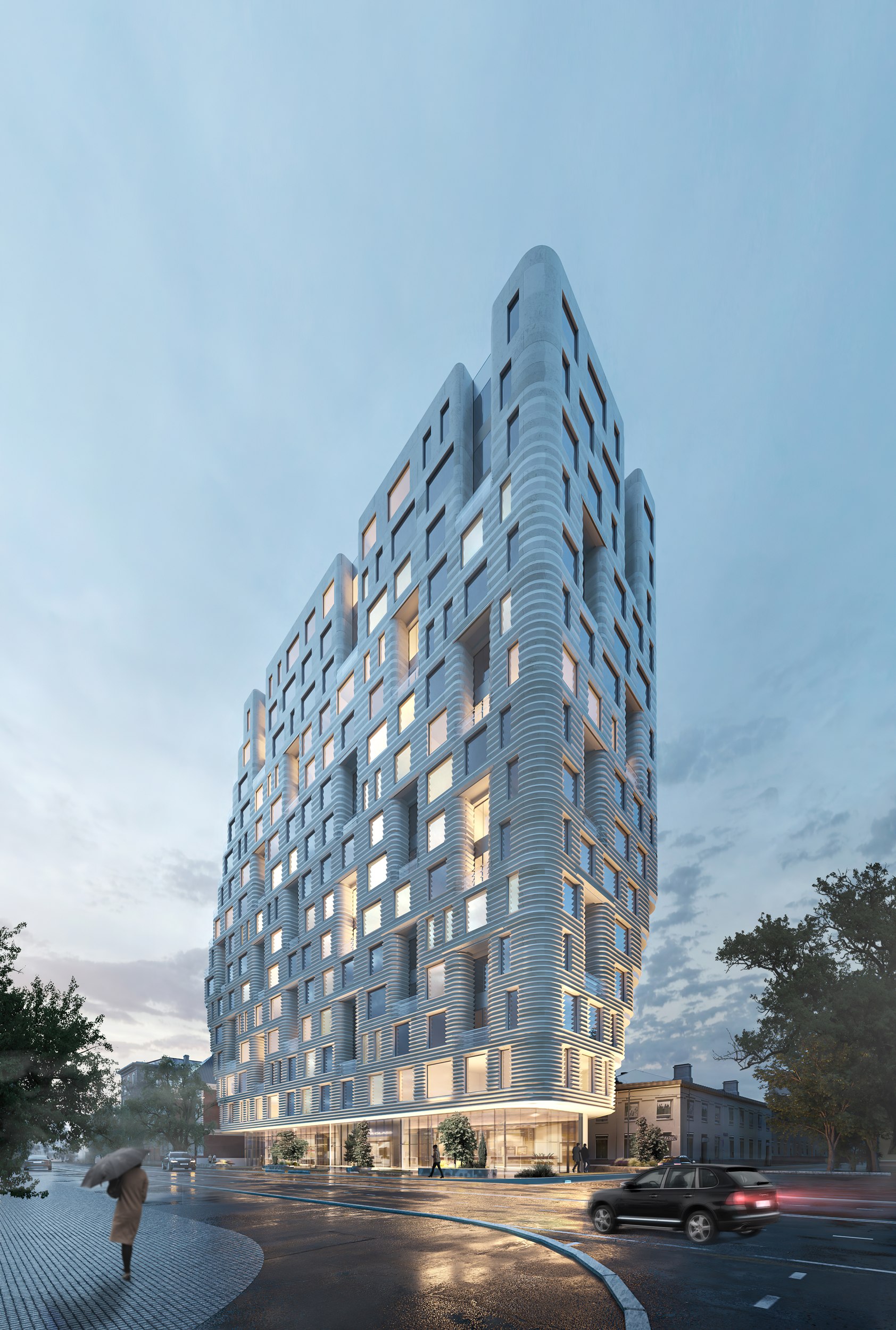 Ступенчато–пирамидальный объем с ритмичным горизонтальным рустом – ключевая тема проекта архитектурного бюро «Крупный план» (KPLN). Ключевой прием – эволюция формы: от ярко выраженной, тектоничной рустовки в нижней части к ее постепенному сглаживанию и облегчению в верхних этажах. Ритмичные горизонтальные элементы фасада с острым профилем отсылают к классической алмазной рустовке, но решены в современном, минималистичном ключе.