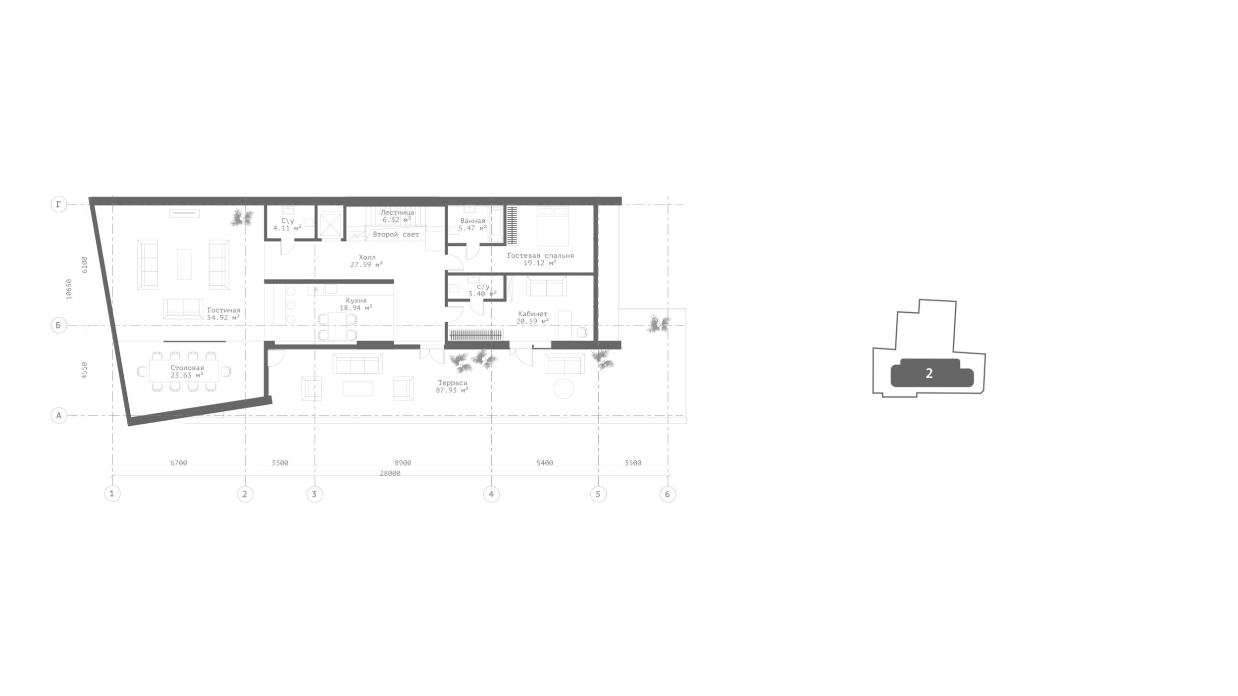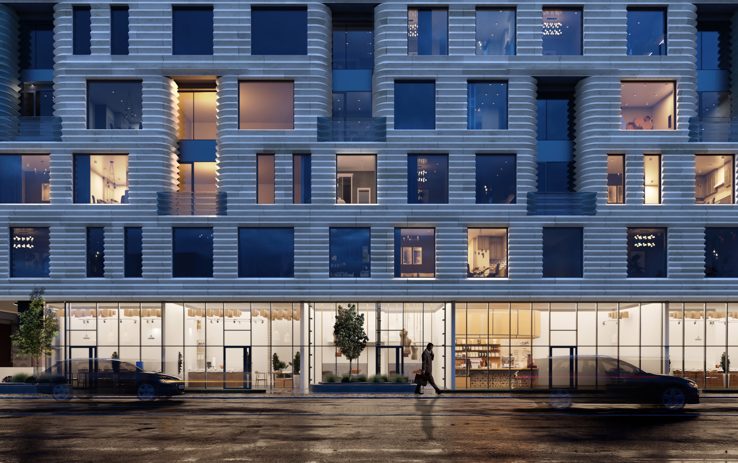 Входная зона решена как полностью остекленный объем, визуально отделяющий рустованный цоколь от основного массива здания. В интерьерах общественных пространств транслируют код архитектурного окружения: рельефная символика, элементы сводов и пол из терраццо считываются как мотивы Римско–католического собора. Из лобби запланирован доступ в жилые блоки с панорамным остеклением, в приватный двор и подземный паркинг.