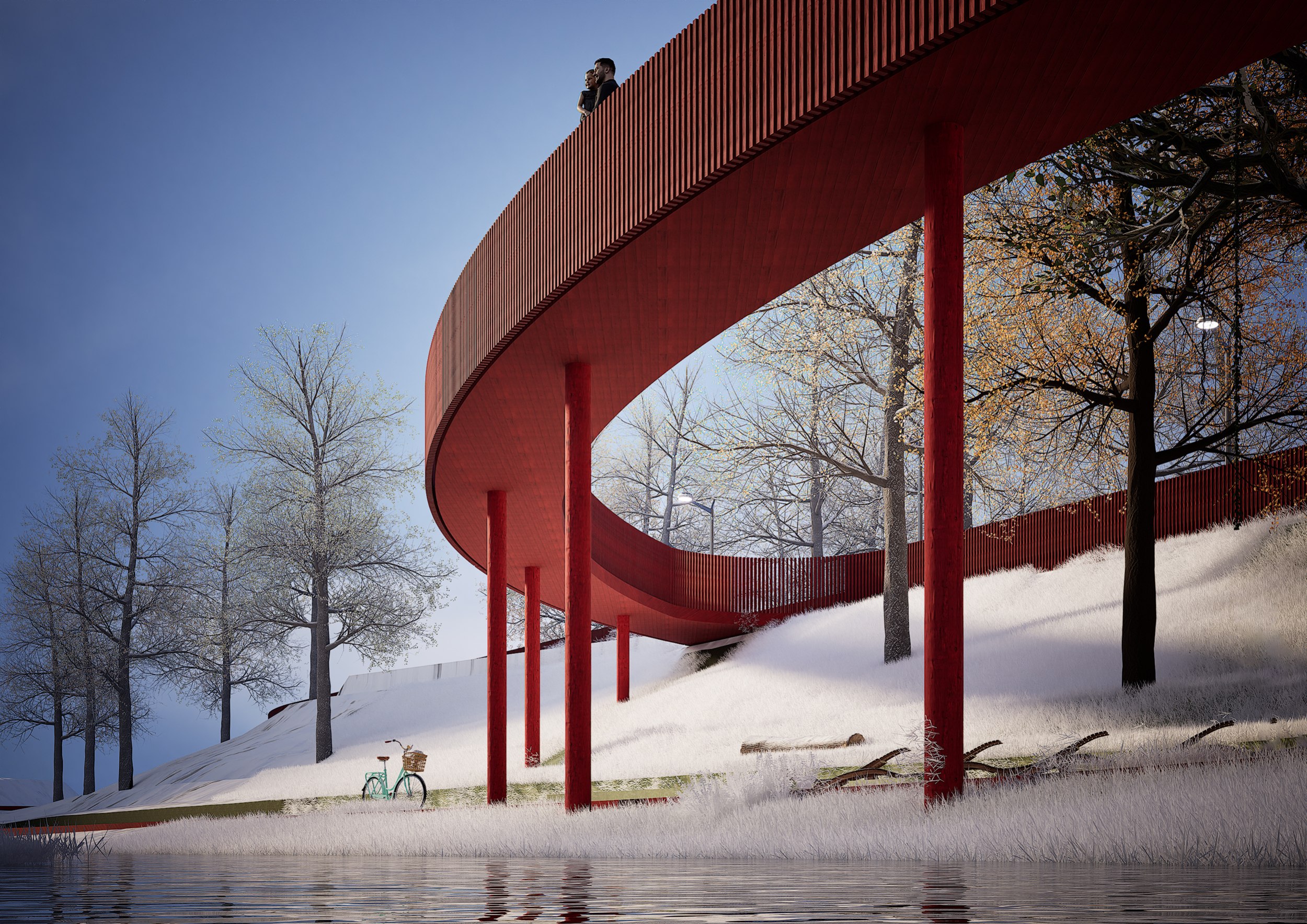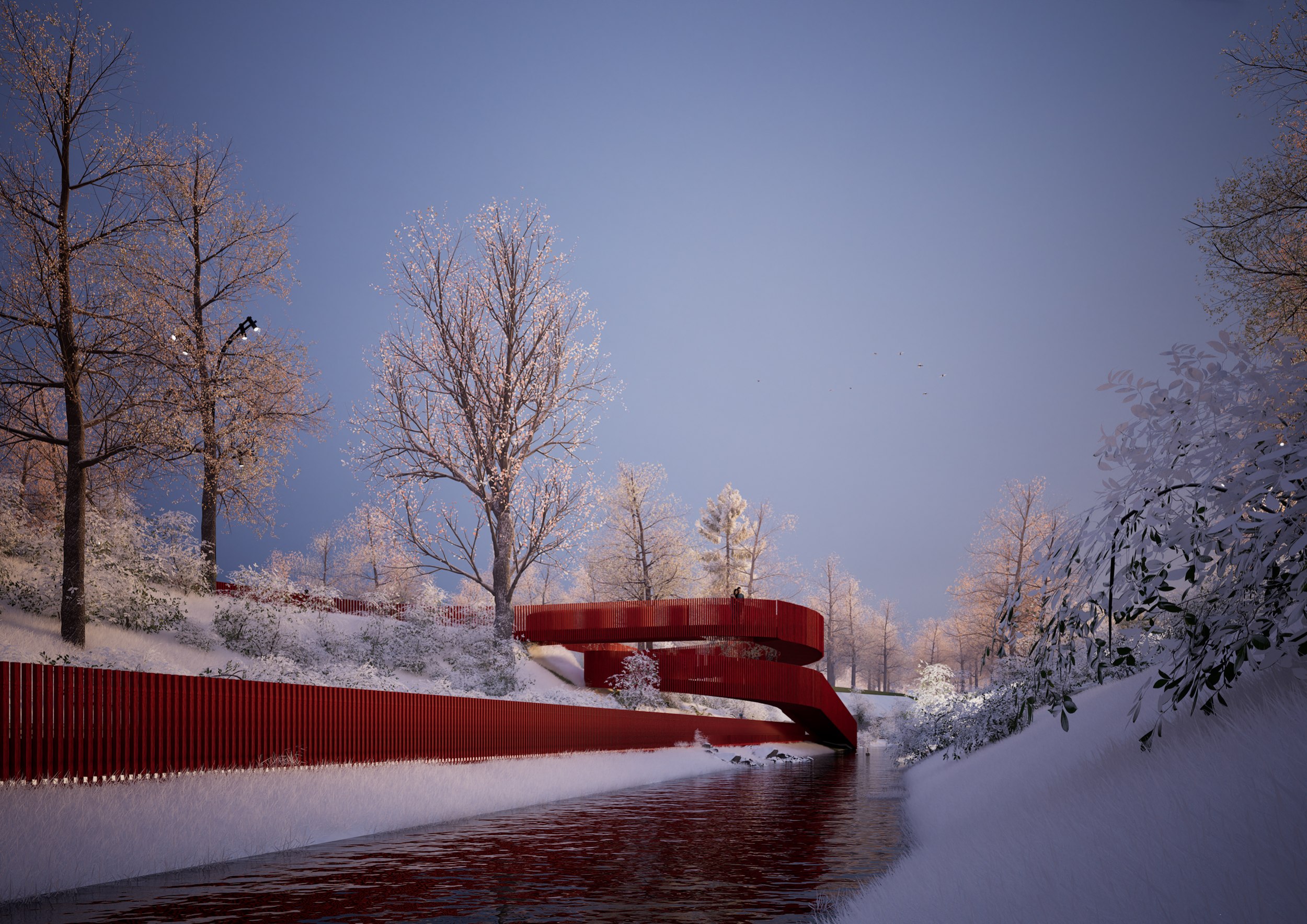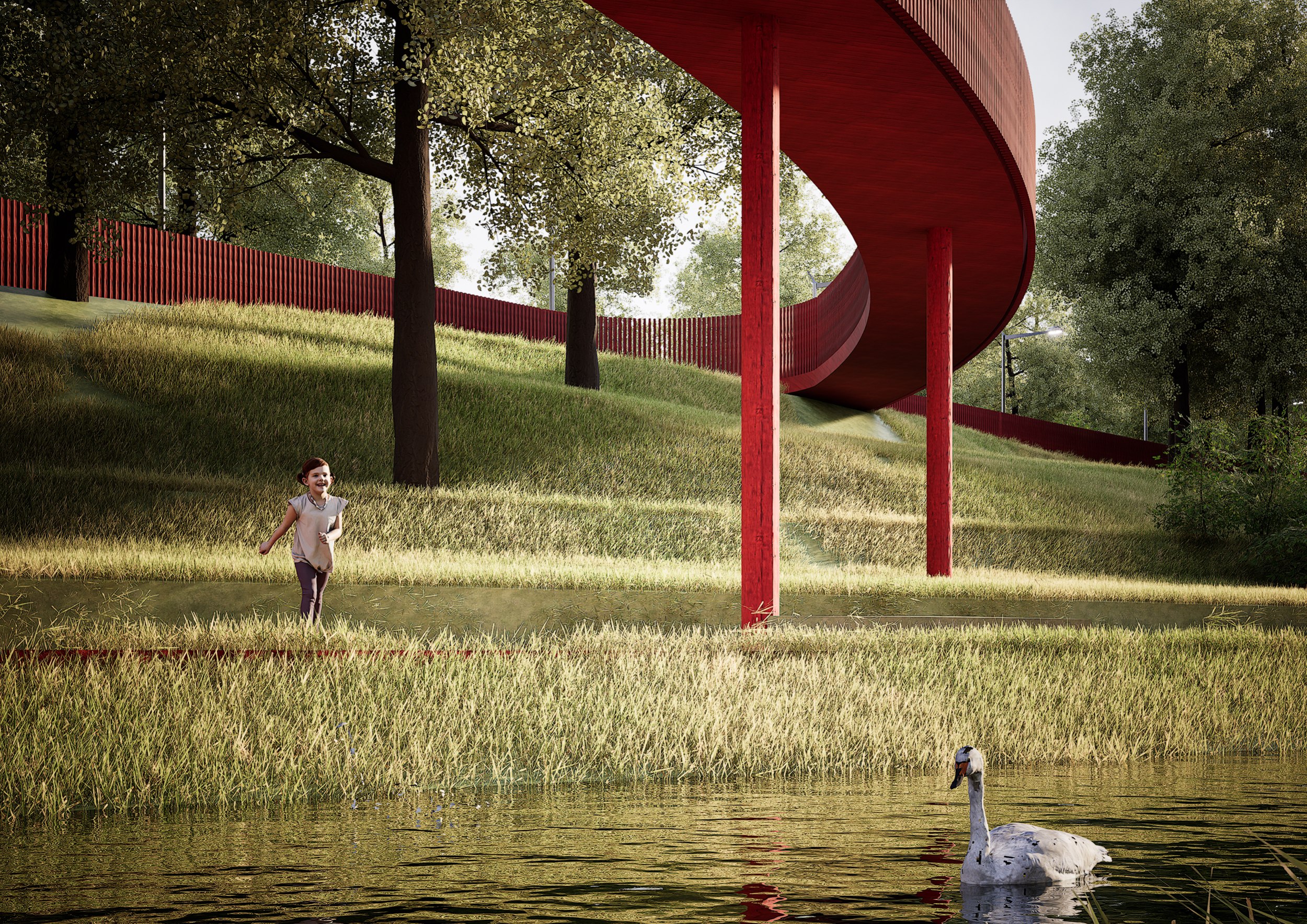Проект линейного парка, подготовленный мастерской Алексея Ильина для благоустройства берега реки в одном из жилых районов, стремится соединить человека и природу. Два уровня набережной помогают погрузиться в созерцание ландшафта и одновременно защищают его от антропогенной нагрузки. «Воздушная улица» соединяет функциональные зоны и противоположные берега, а также создает новые точки притяжения: балконы, мосты и даже «грот».