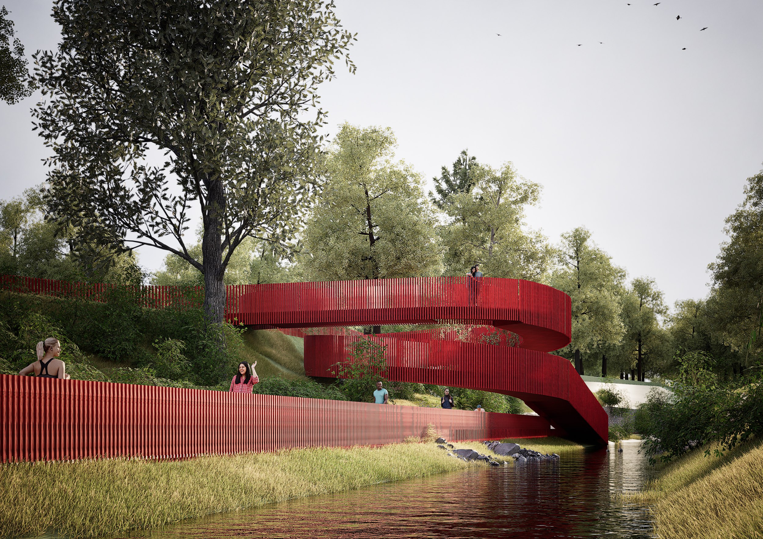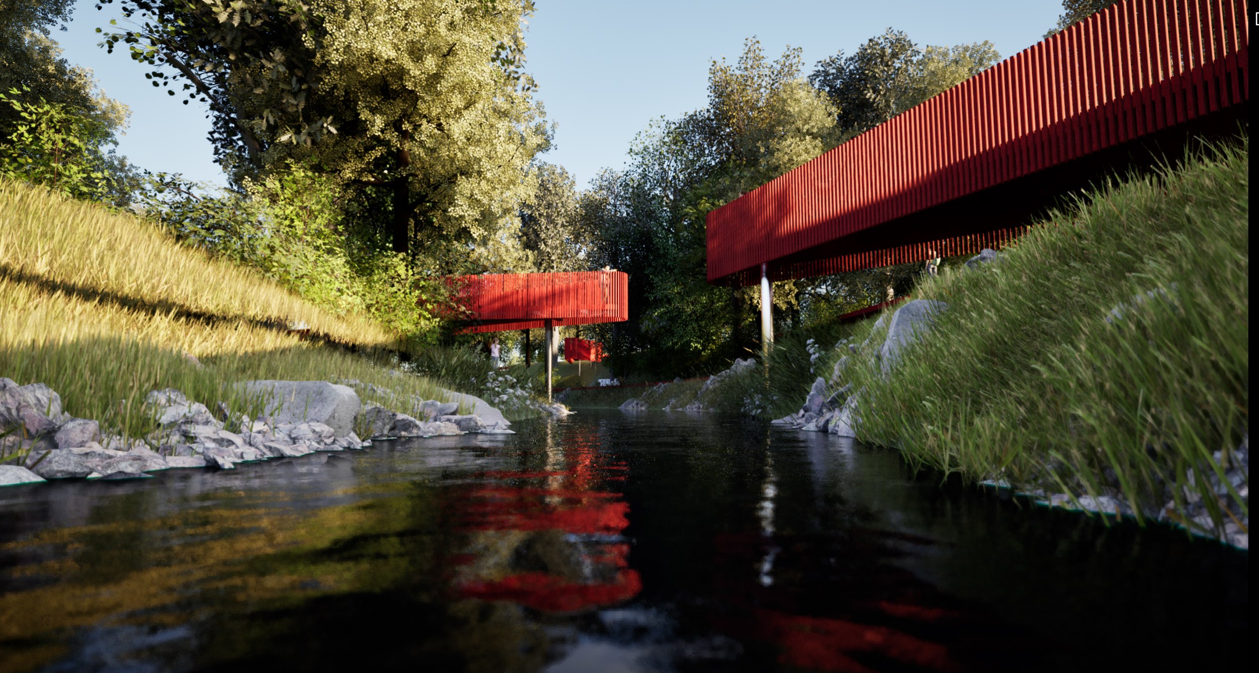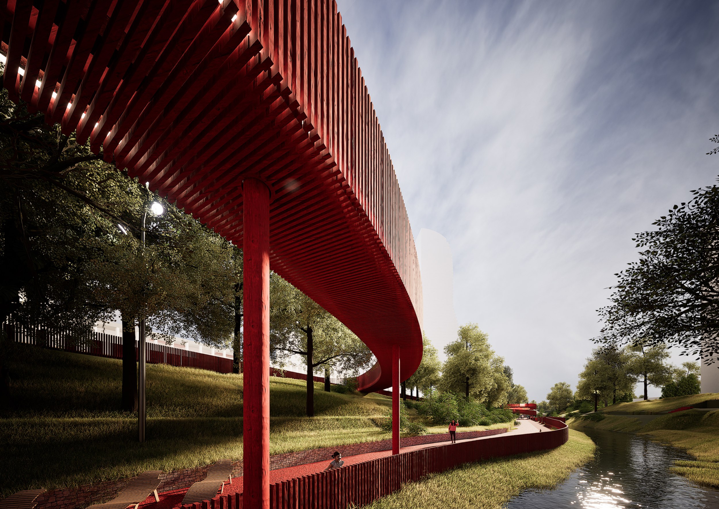 Проект линейного парка, подготовленный мастерской Алексея Ильина для благоустройства берега реки в одном из жилых районов, стремится соединить человека и природу. Два уровня набережной помогают погрузиться в созерцание ландшафта и одновременно защищают его от антропогенной нагрузки. «Воздушная улица» соединяет функциональные зоны и противоположные берега, а также создает новые точки притяжения: балконы, мосты и даже «грот».
