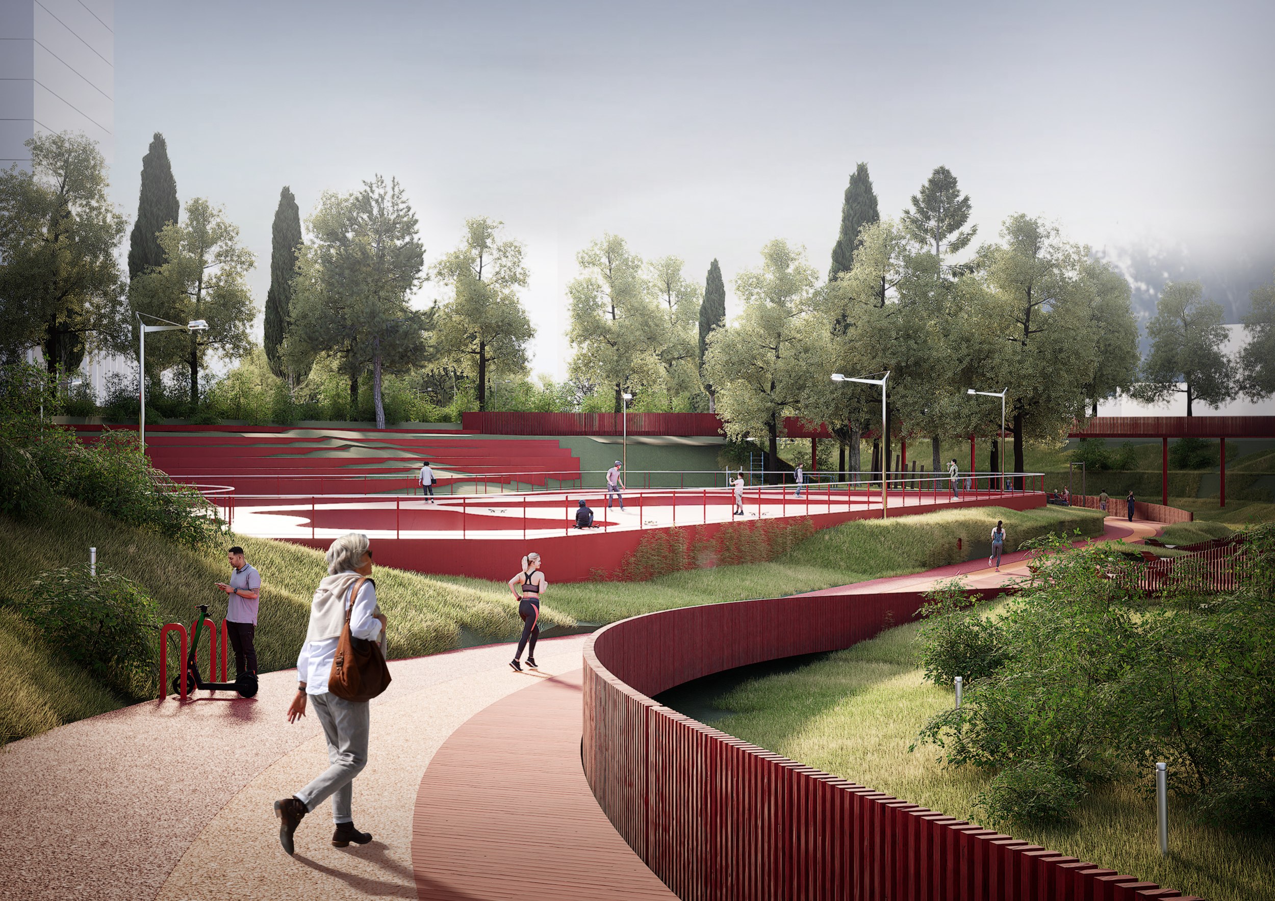 Проект был непростым из–за сложного ландшафта, но именно это сделало задачу особенно интересной. Хотелось создать единый визуальный язык: словно красная нить, сквозь всю территорию протянулась тропа, на которую «нанизаны» разные зоны, места встреч, МАФы и другие точки притяжения. Контрастные красные оттенки помогли связать среду и добавить энергии.