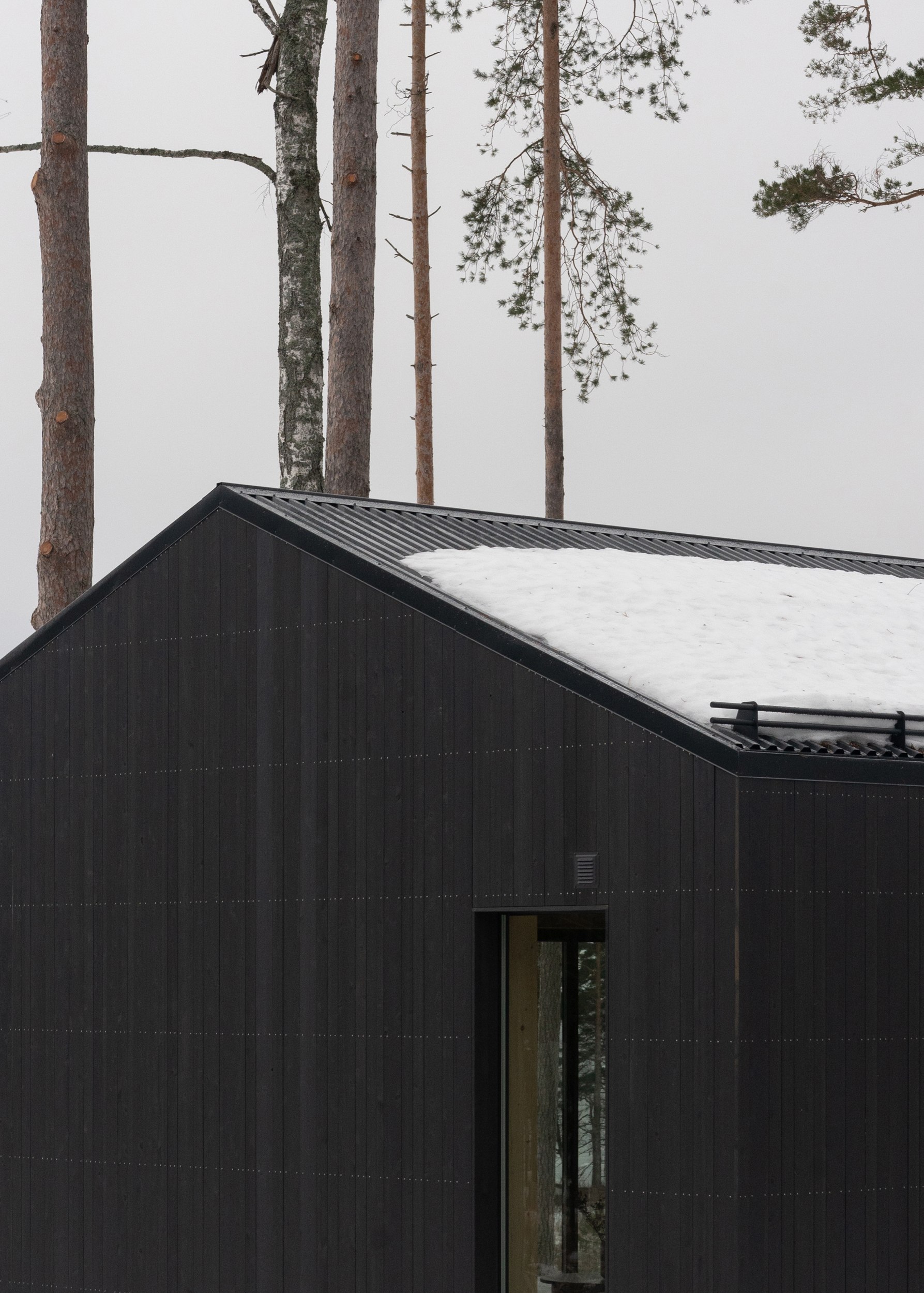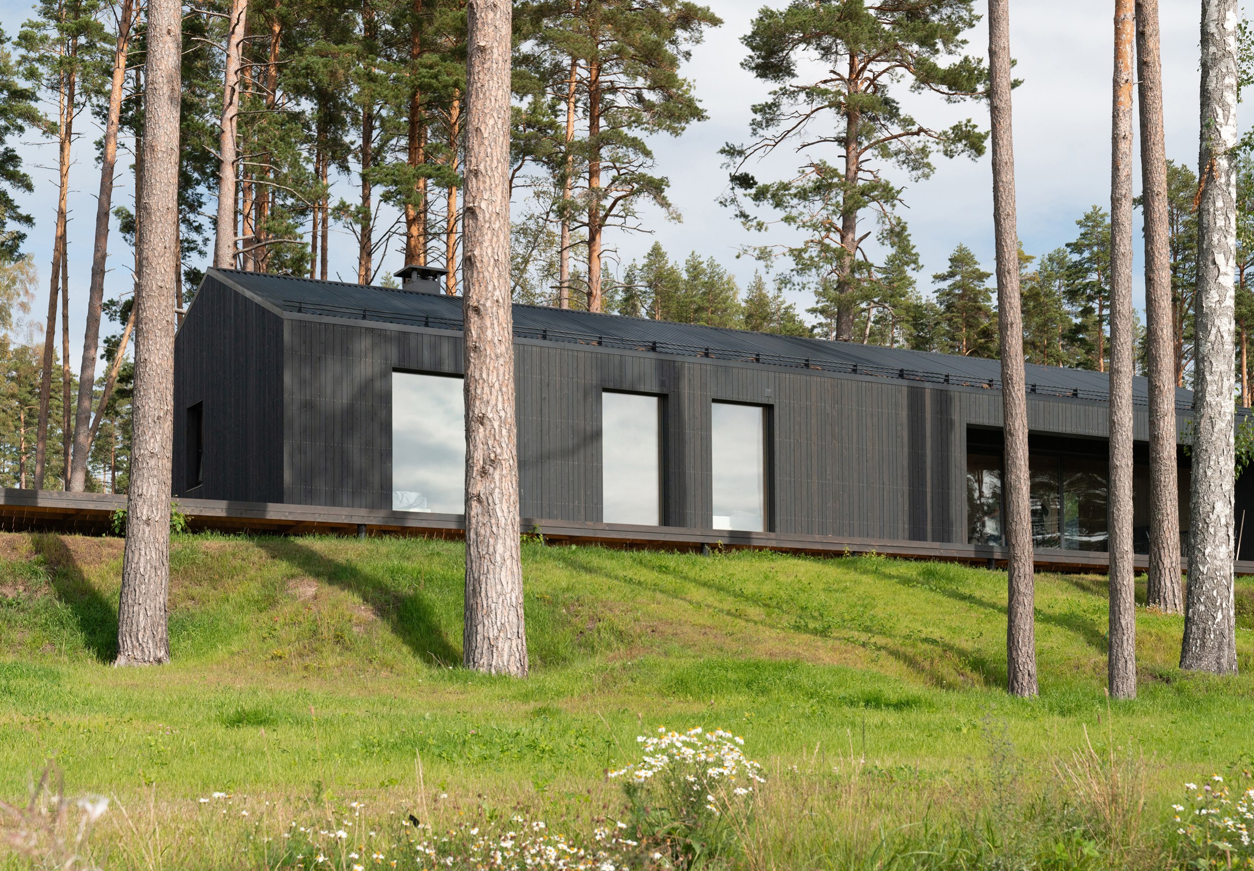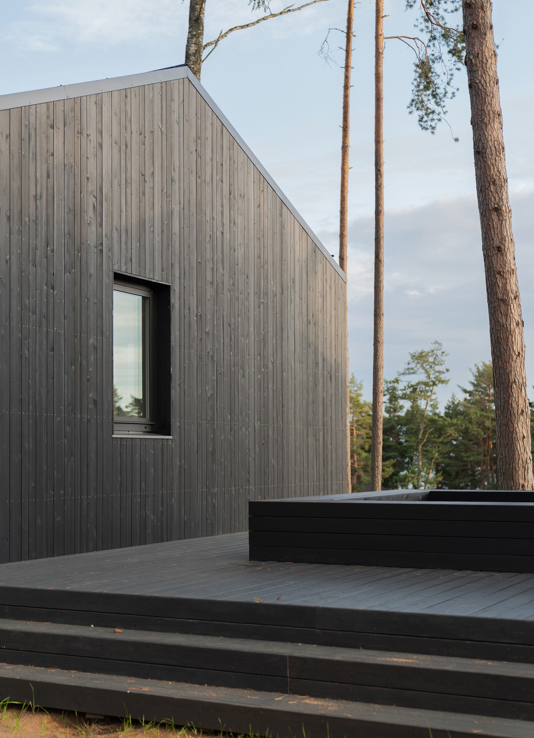 Дом расположен на возвышенности недалеко от берега Финского залива. Основной объем и флигель объединяет терраса из лиственницы, формирующая защищенное патио с клумбой, предназначенной для посадки плодовых растений. Линейная структура объекта продиктована генпланом участка: все ключевые помещения ориентированы таким образом, чтобы из них открывались виды на сосновую рощу и акваторию залива, а внутренние пространства были максимально связаны с окружающим ландшафтом.