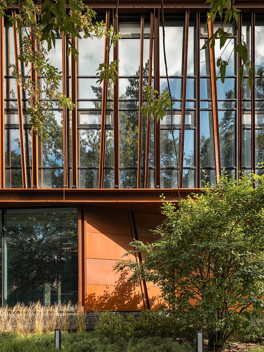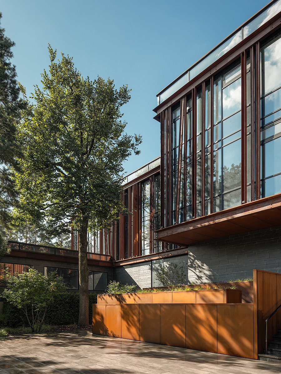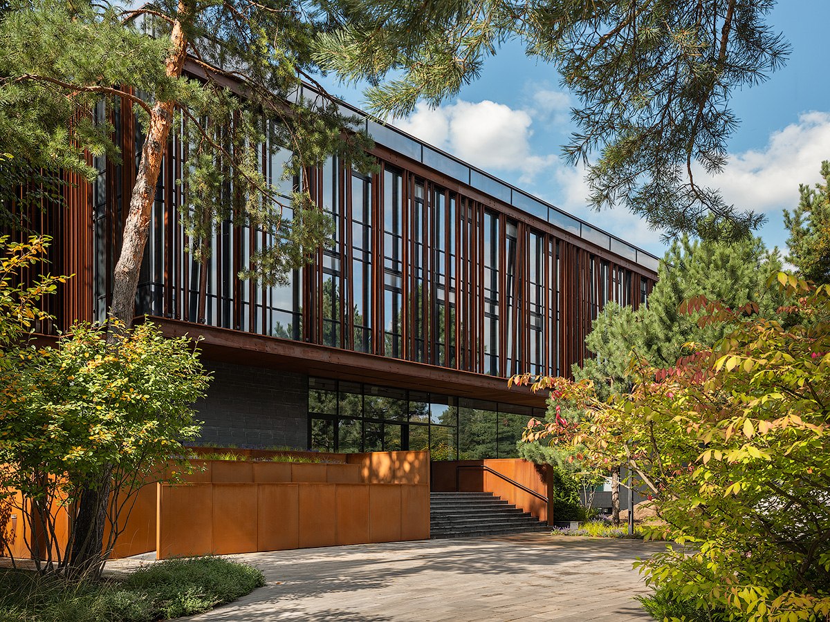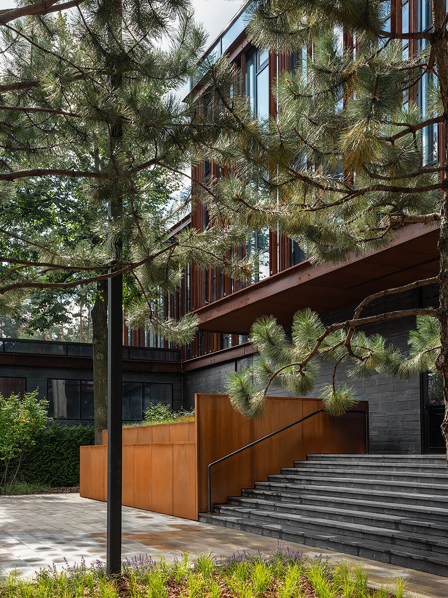 Фасад здания выстроен на тонком сочетании натурального камня, стекла и металла. Ламели из стали Corten – основной элемент, формирующий весь облик здания, – вторят палитре лесного массива и, наподобие сосновых стволов, установлены с легким отклонением от вертикали. Со временем под воздействием погодных факторов поверхность металла покрывается оксидной патиной терракотового оттенка, еще больше мимикрируя под природное окружение. Богатство визуального образа дополняет естественная тектоника натурального сланца на уровне первого этажа. Единый стиль поддерживают и другие элементы оформления – система навигации, мебель, малые формы, подчеркивая долговечность и благородство материалов.