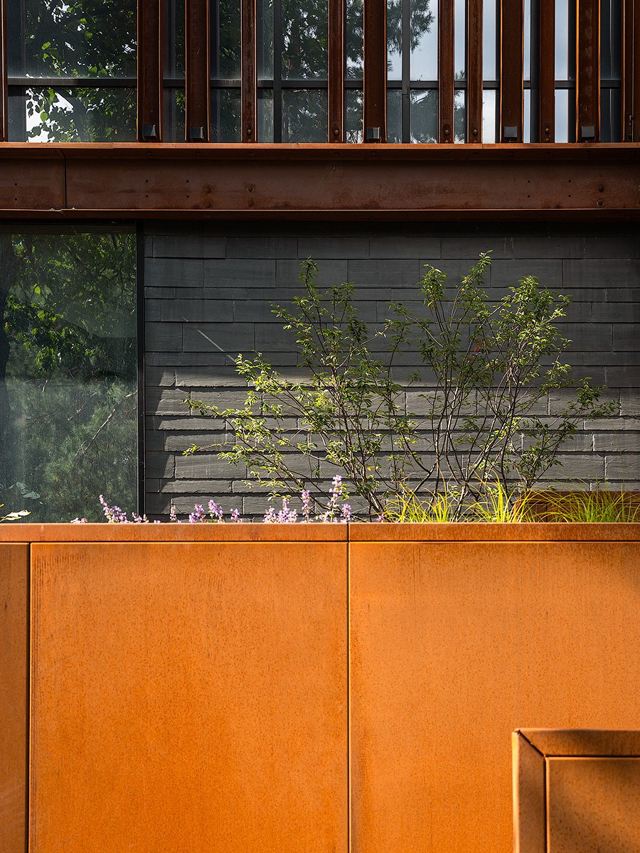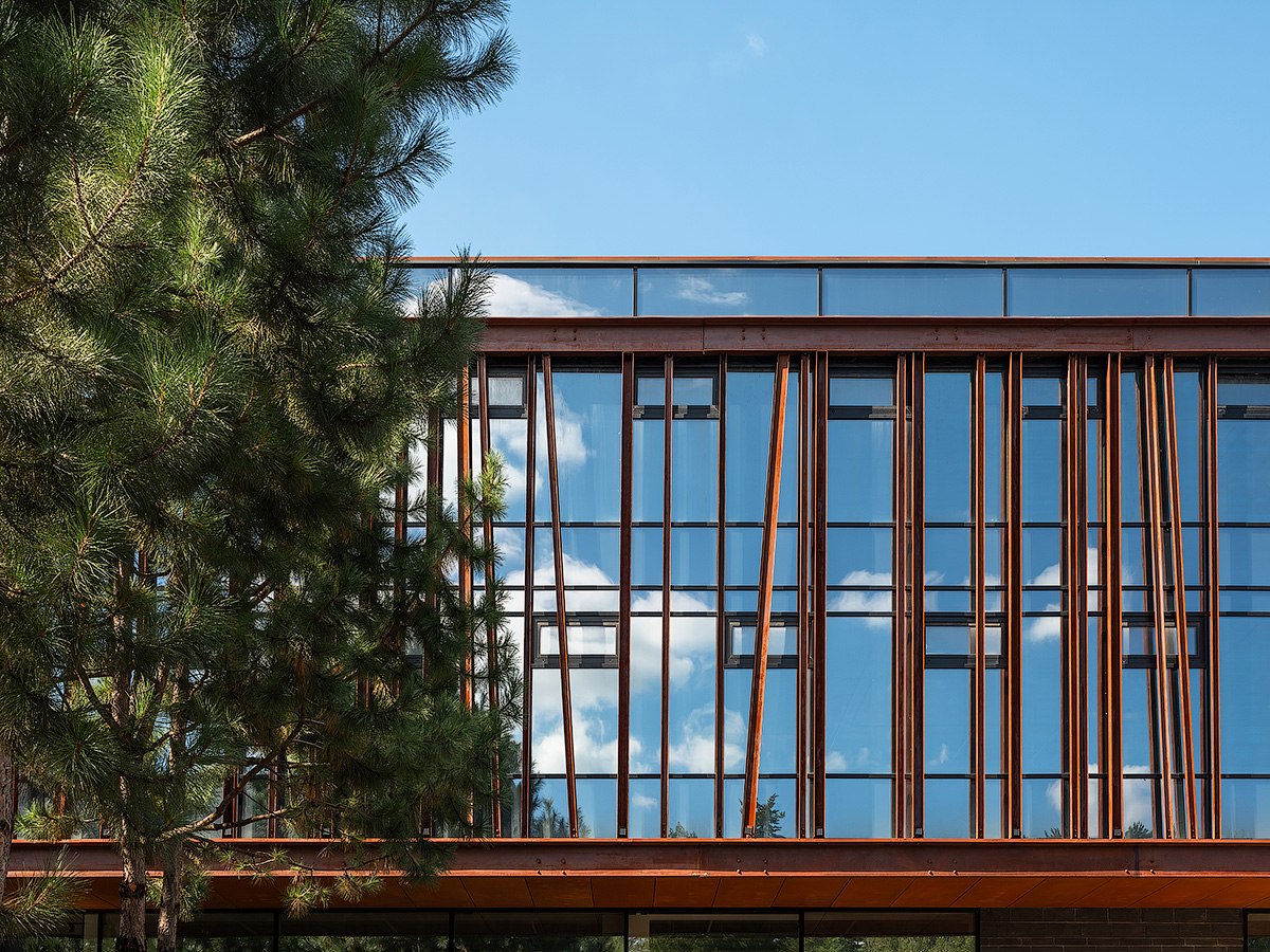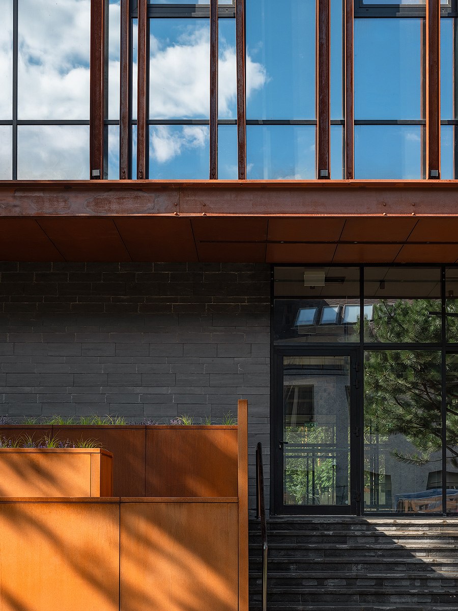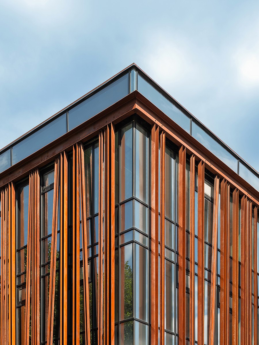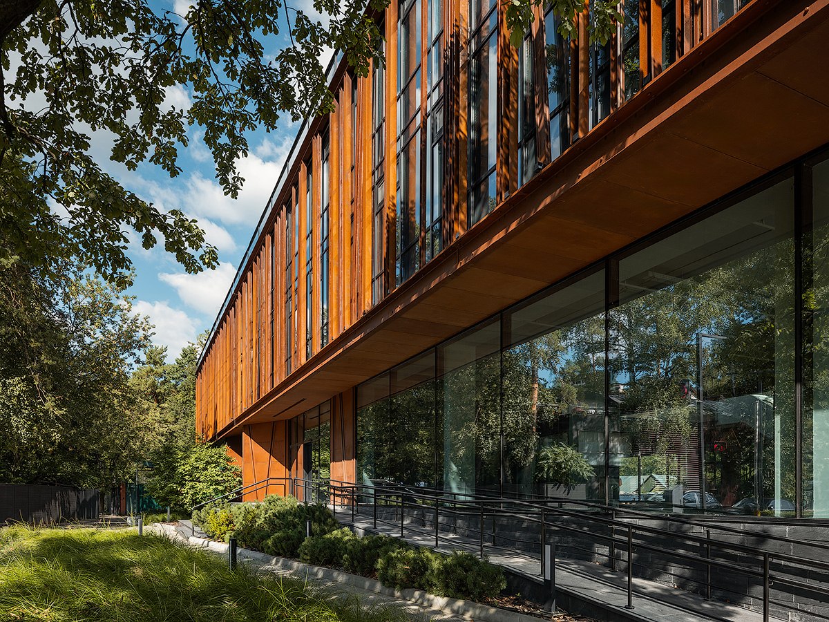Фасад здания выстроен на тонком сочетании натурального камня, стекла и металла. Ламели из стали Corten – основной элемент, формирующий весь облик здания, – вторят палитре лесного массива и, наподобие сосновых стволов, установлены с легким отклонением от вертикали. Со временем под воздействием погодных факторов поверхность металла покрывается оксидной патиной терракотового оттенка, еще больше мимикрируя под природное окружение. Богатство визуального образа дополняет естественная тектоника натурального сланца на уровне первого этажа. Единый стиль поддерживают и другие элементы оформления – система навигации, мебель, малые формы, подчеркивая долговечность и благородство материалов.
