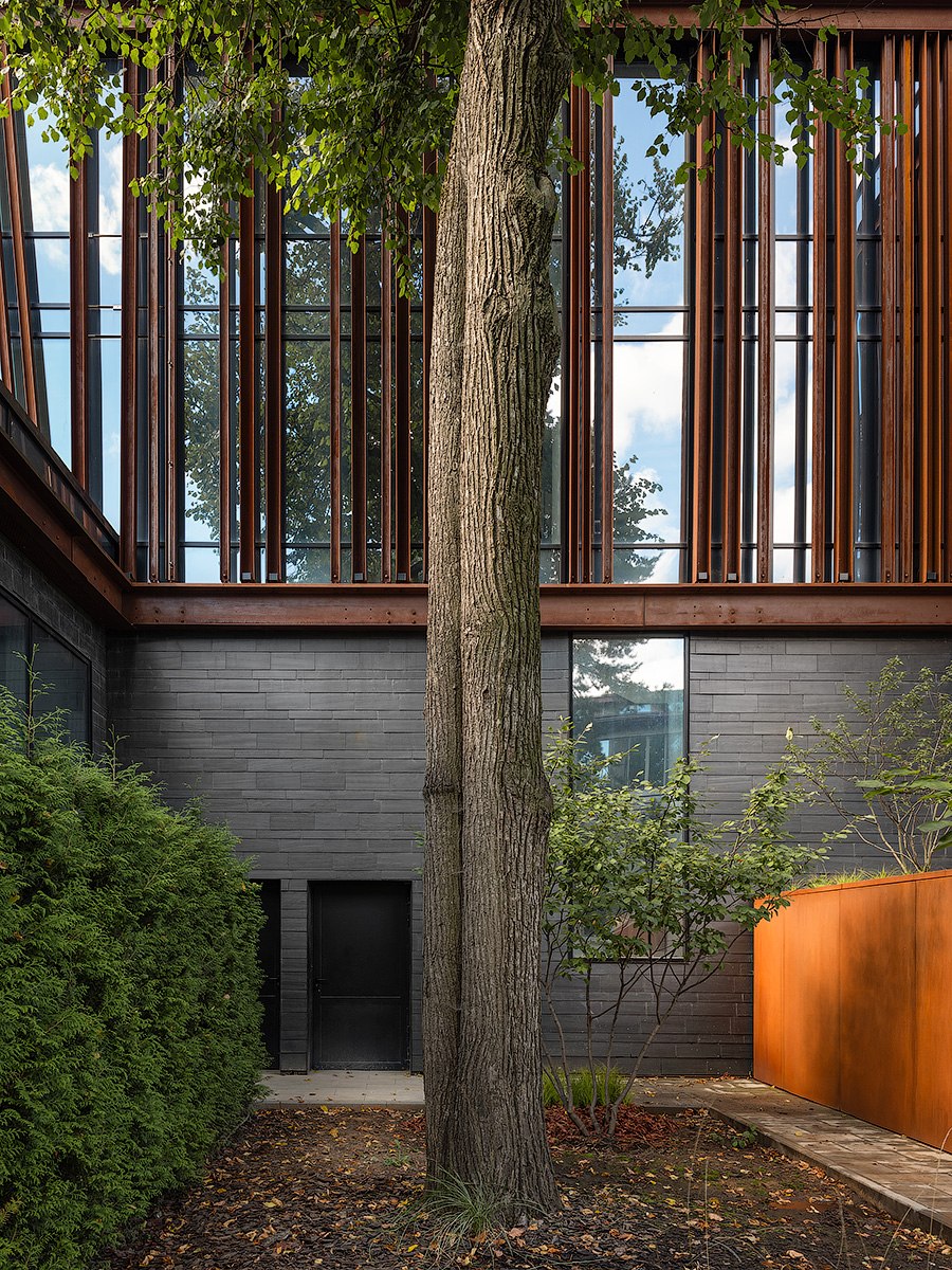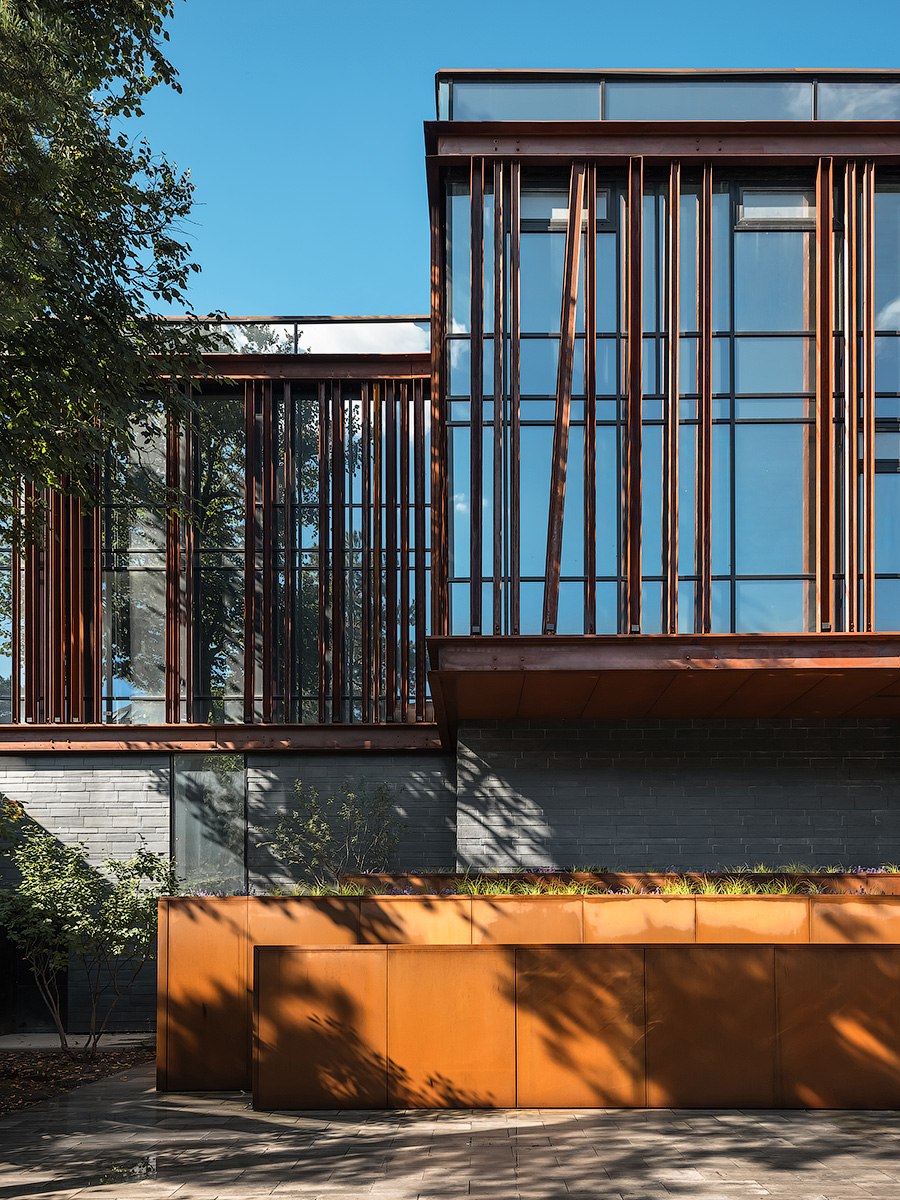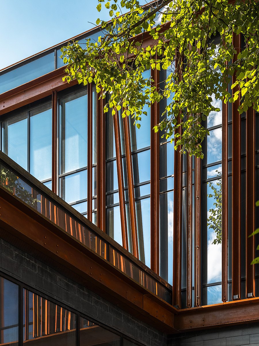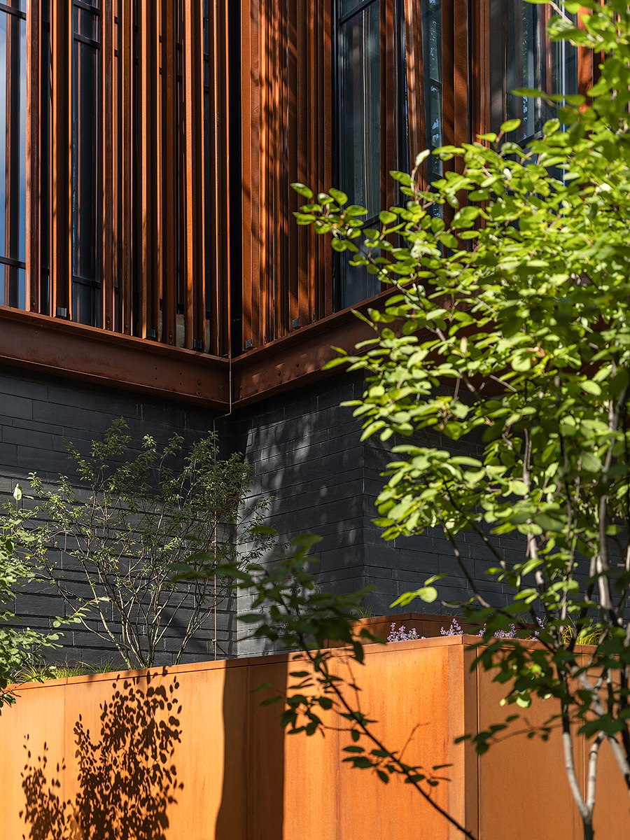Фасад здания выстроен на тонком сочетании натурального камня, стекла и металла. Ламели из стали Corten – основной элемент, формирующий весь облик здания, – вторят палитре лесного массива и, наподобие сосновых стволов, установлены с легким отклонением от вертикали. Со временем под воздействием погодных факторов поверхность металла покрывается оксидной патиной терракотового оттенка, еще больше мимикрируя под природное окружение. Богатство визуального образа дополняет естественная тектоника натурального сланца на уровне первого этажа. Единый стиль поддерживают и другие элементы оформления – система навигации, мебель, малые формы, подчеркивая долговечность и благородство материалов.