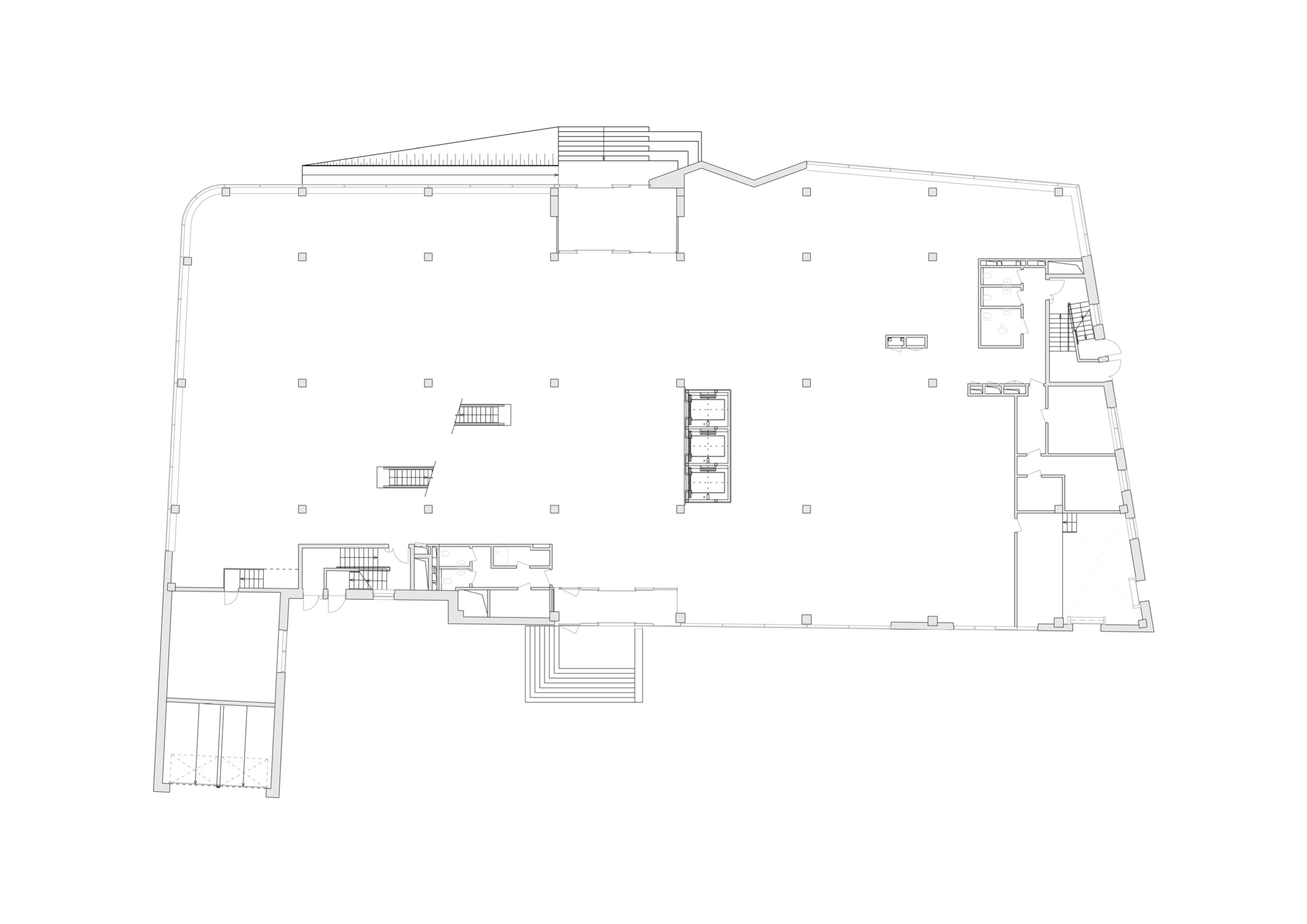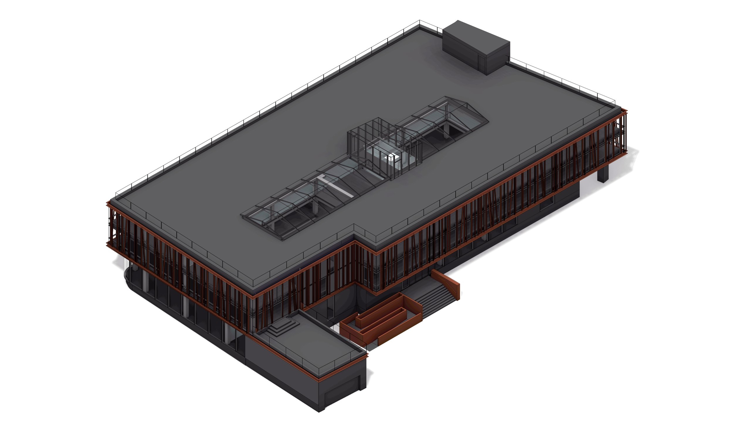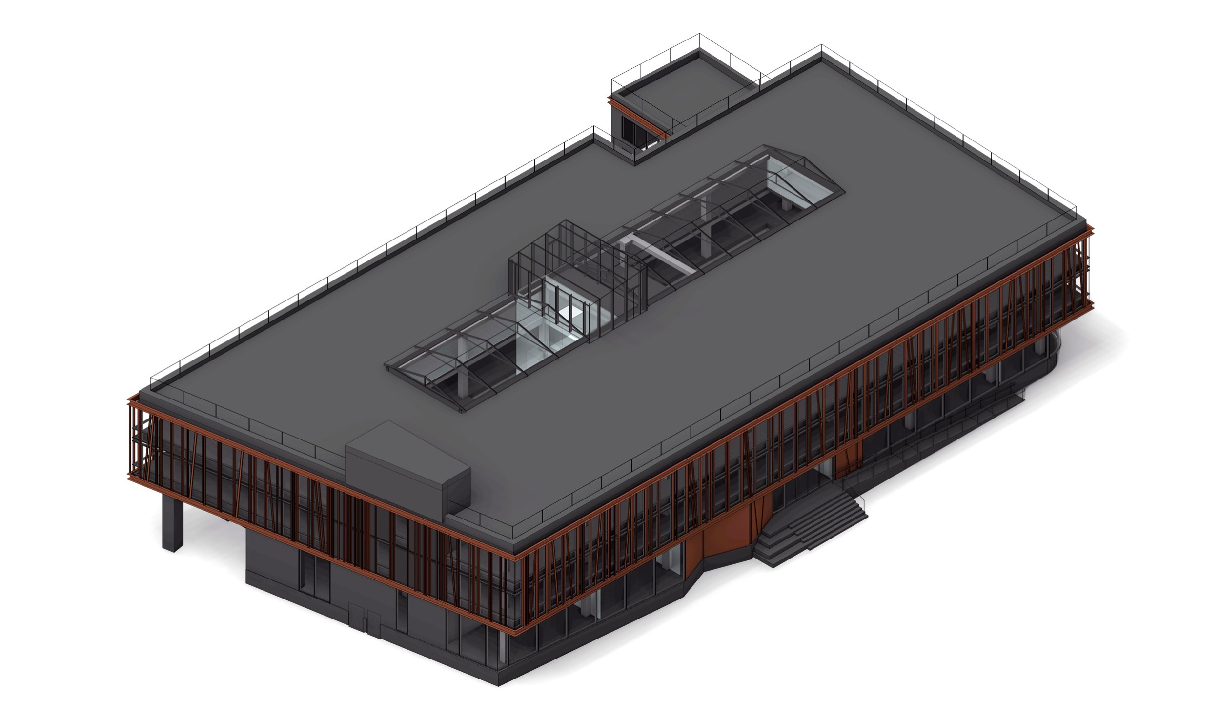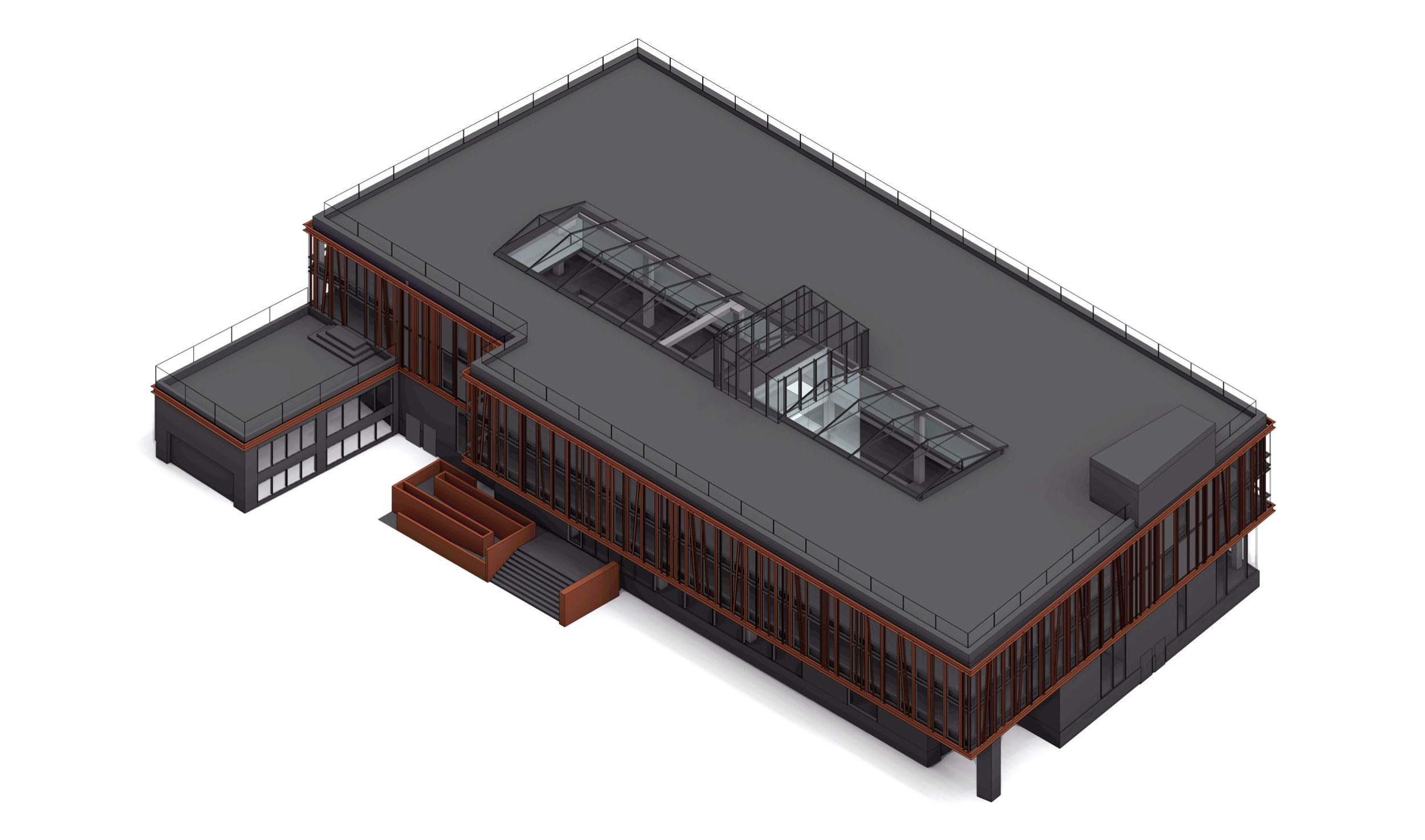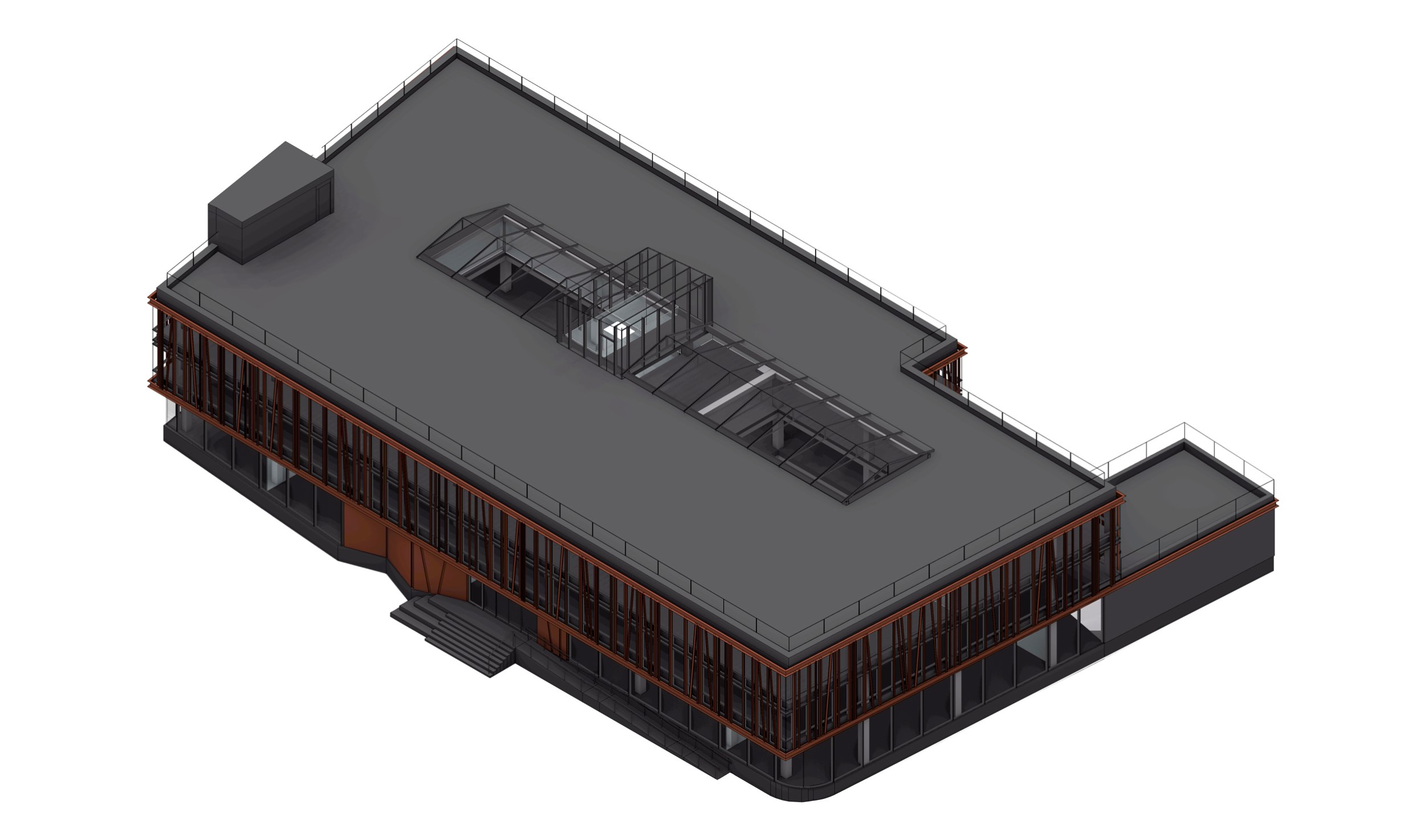 Синергия с природным окружением продолжается и в интерьере центра. Внутреннее пространство атриума пронизано колоннами из кортен–стали, также вторящими стволам сосновых деревьев. Это создает целостный образ, неразрывную взаимосвязь внутреннего и внешнего пространства, так характерную для проектов студии VFORM. Внутренняя планировка создана с учетом смены сценариев естественного освещения в течение дня, грамотно зонирована и адаптивна к различным типологиям арендных площадей и задачам использования. В верхней части предусмотрено размещение коммерческих офисных пространств, в нижней – зоны под рестораны и ритейл.