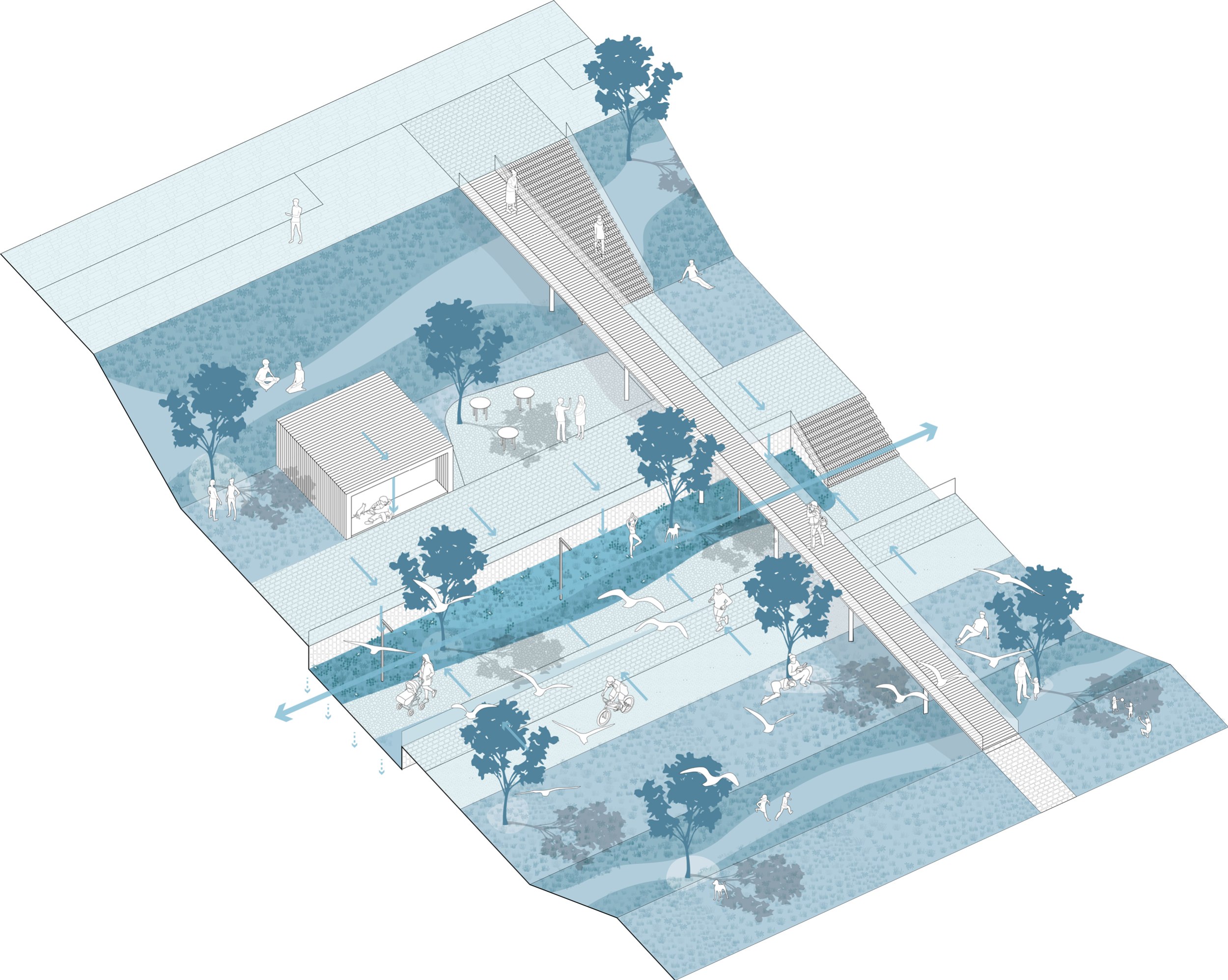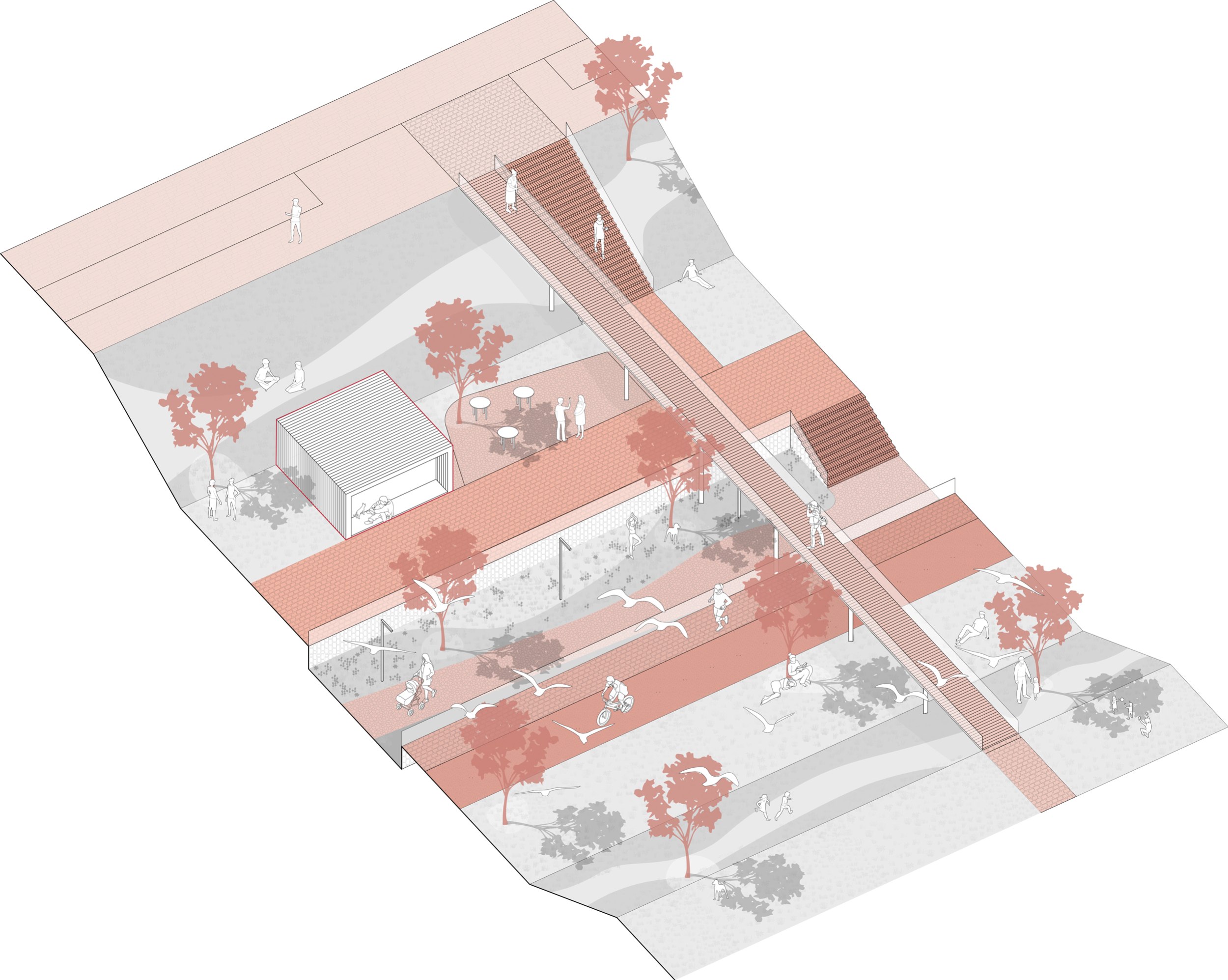 Зонирование маршрута формируется рельефом и окружающей застройкой. Путь разделен на несколько отрезков, и для каждого предложен свой набор решений при сохранении общей непрерывности. У жилых домов появляются площадки для отдыха и детских игр, в ключевых узлах – продуманные пересечения с улично–дорожной сетью и общественные пространства у станций метро. Важной частью проекта стали поперечные связи и пешеходные мосты, упрощающие перемещение жителей между кварталами.