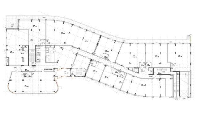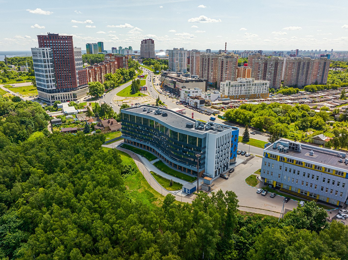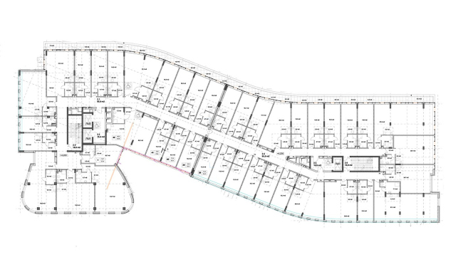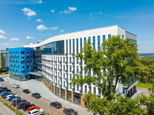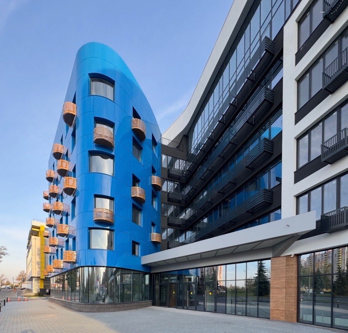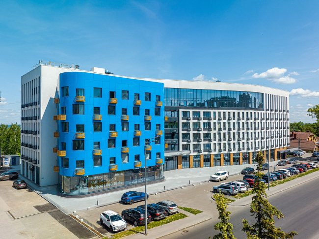 Здание представляет собой изогнутый плавный объем из 7 (6+технический) этажей, стыкующийся с бочкообразным синим объемом из 6 этажей, со встроенными помещениями общественного назначения (1 этаж), техническим этажом (h=3 м) и подземной автостоянкой.