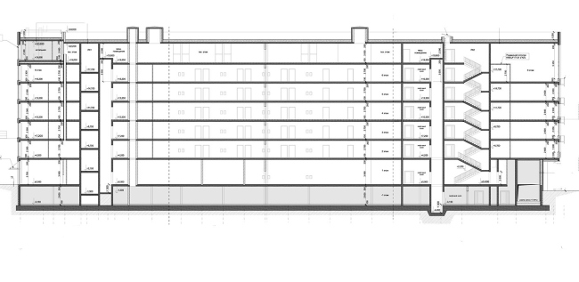 Размеры здания в плане 81,0х34,2 м. На первом этаже располагаются коммерческие помещения и помещения гостиницы. На 2–6 этажах располагаются апартаменты гостиницы. Связь этажей – за счет лестниц и лифтов. На -1 этаже – автостоянка и технические помещения. Автостоянка размещена в одном пожарном отсеке. Каждый этаж гостиницы представляет собой отдельный пожарный отсек. На техническом этаже размещены машинные помещения лифтов. На эксплуатируемой кровле – помещение котельной, вент. оборудование.
