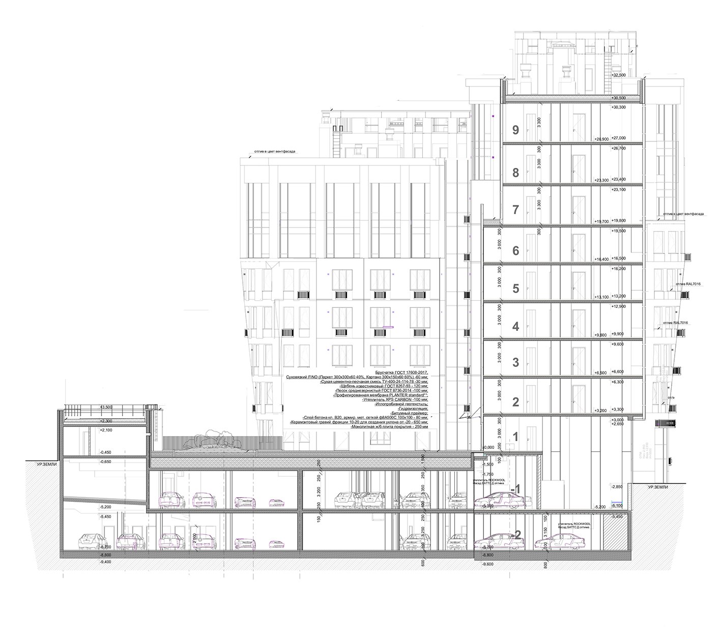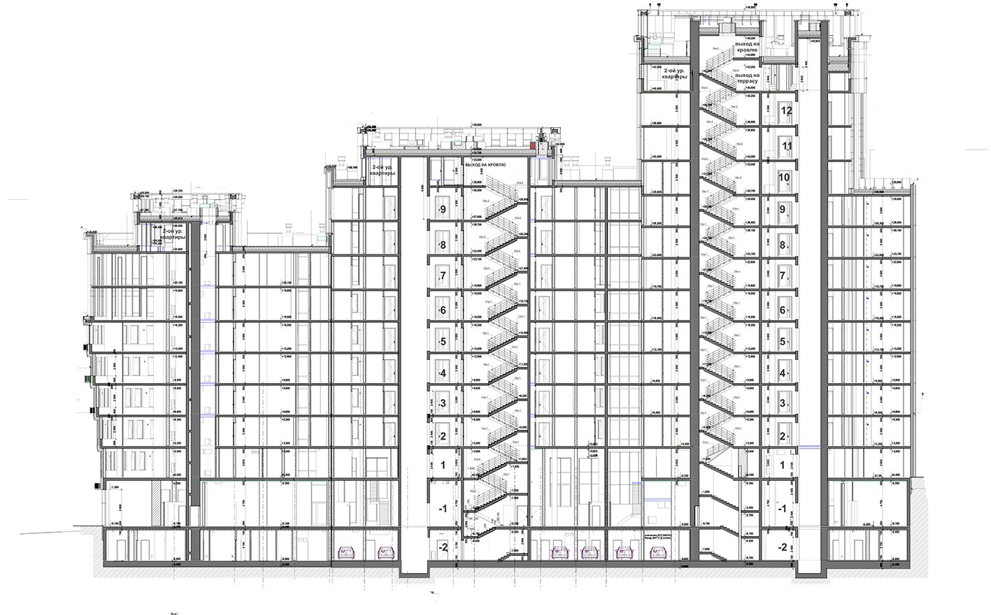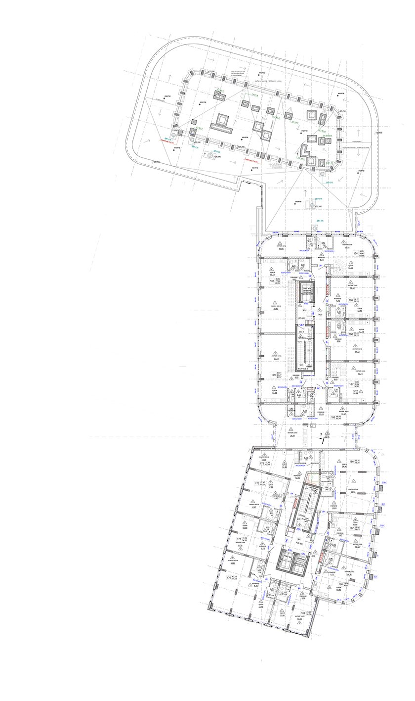 Здание – трехсекционное, имеет разное количество и высоту этажей. Первая секция – 7-этажная, с 1 по 5 этажи высота этажа – 3,3 м; 6–7 этажи высота 3,6 м. Вторая – 9-этажная секция, со 2–6 этажи высота – 3,3 м; 7–9 этажи -3,6 м. Третья секция – 12-этажная, с 2–9 этажи – 3,3 м; с 10–12 этажи – 3,6 м. Высота автостоянки: минус второй уровень – 3,6 м, минус первый уровень – 3,3 м. Помещения общественного значения имеют разновысотную конфигурацию – 3,3 м, 5,4 м, 8,4 м.