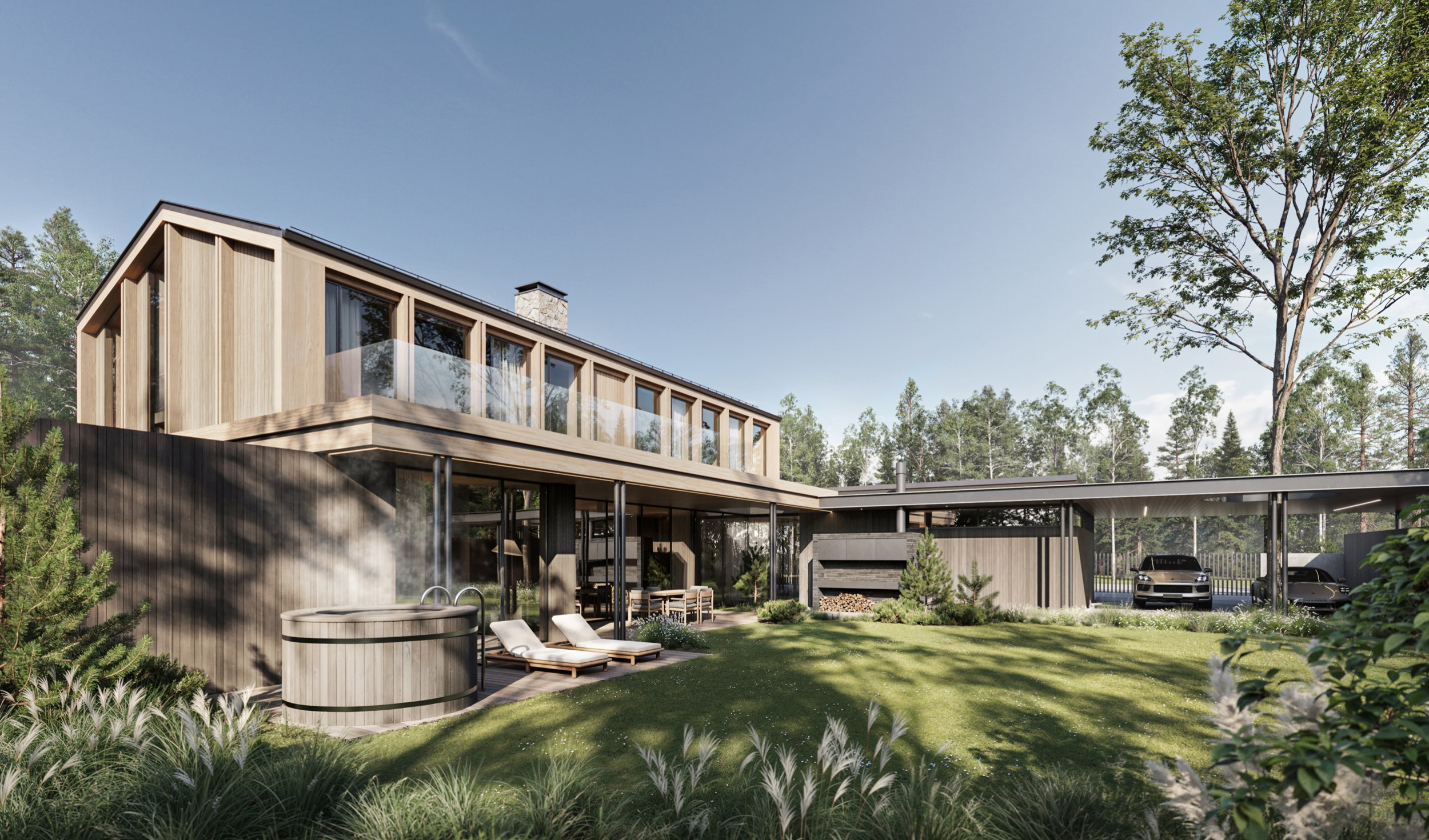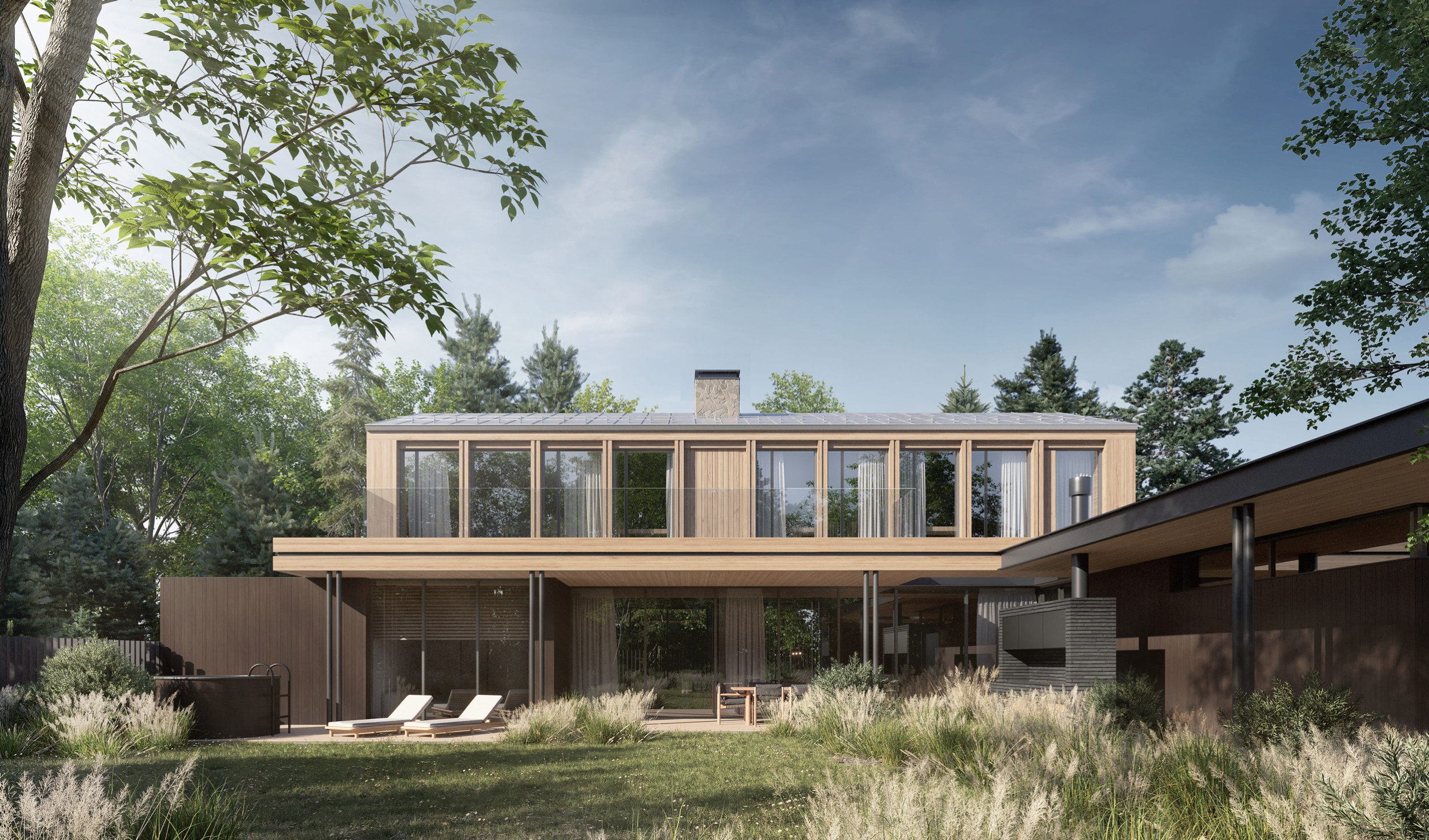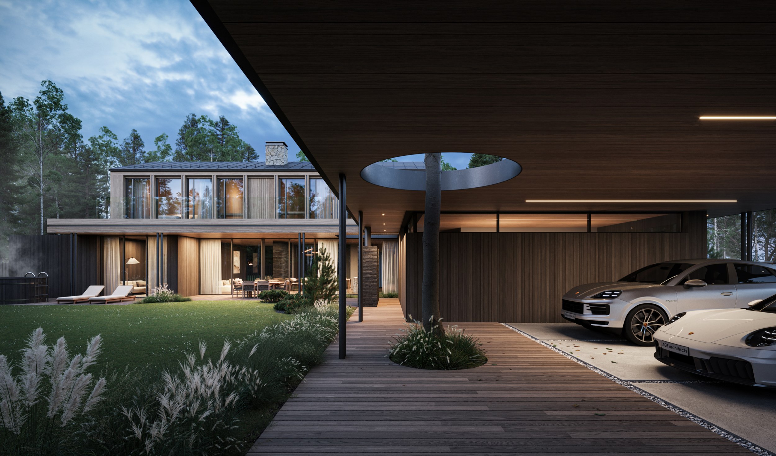 Мы отошли от классической формы фахверка в пользу силуэта барн-хауса, что сделало архитектуру более лаконичной и монолитной. Логика конструктивных решений подчёркивает горизонтальную динамику дома: в основной деревянной части акцентирована массивная сдвоенная балка, тогда как в зоне навесов для автомобиля использован металлический пояс, создающий ощущение лёгкости и технологичности. Этот баланс материалов усиливает визуальное разделение функций, придавая архитектуре цельность и выразительность.