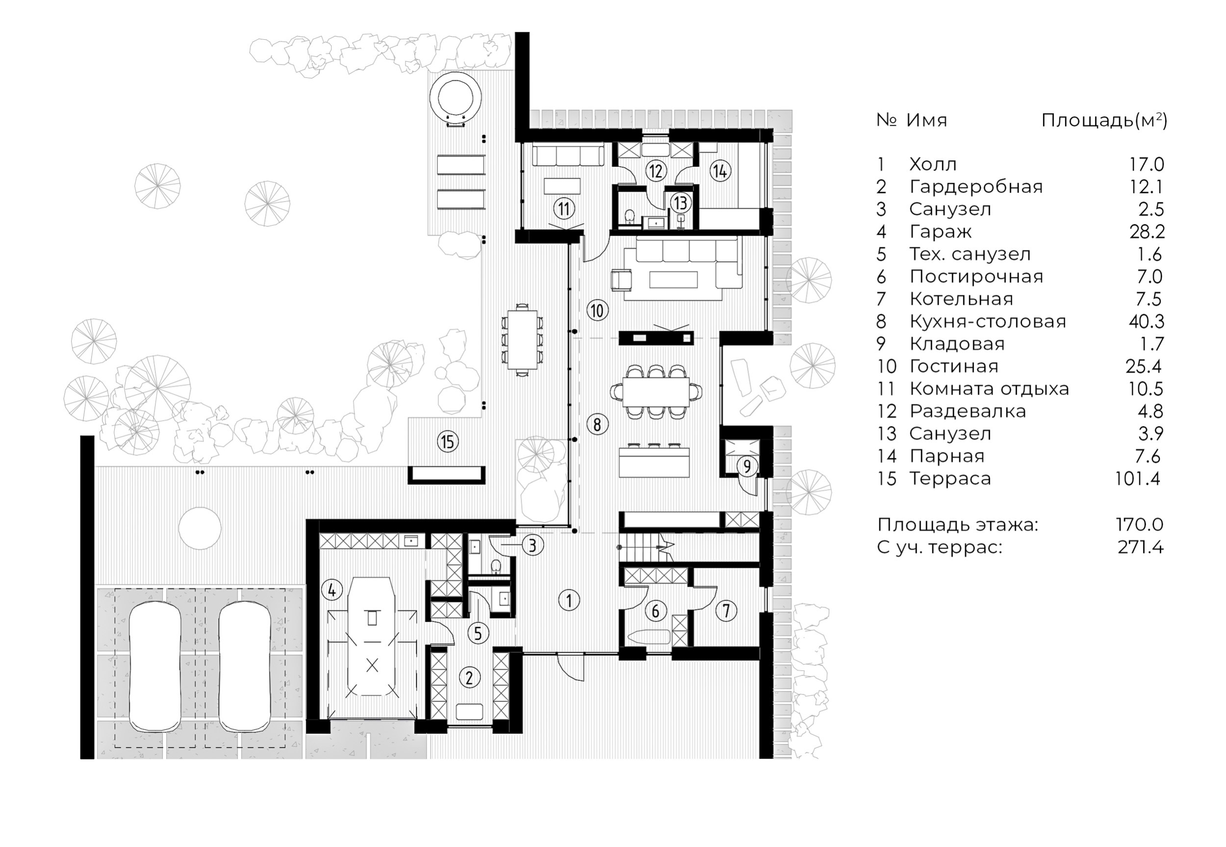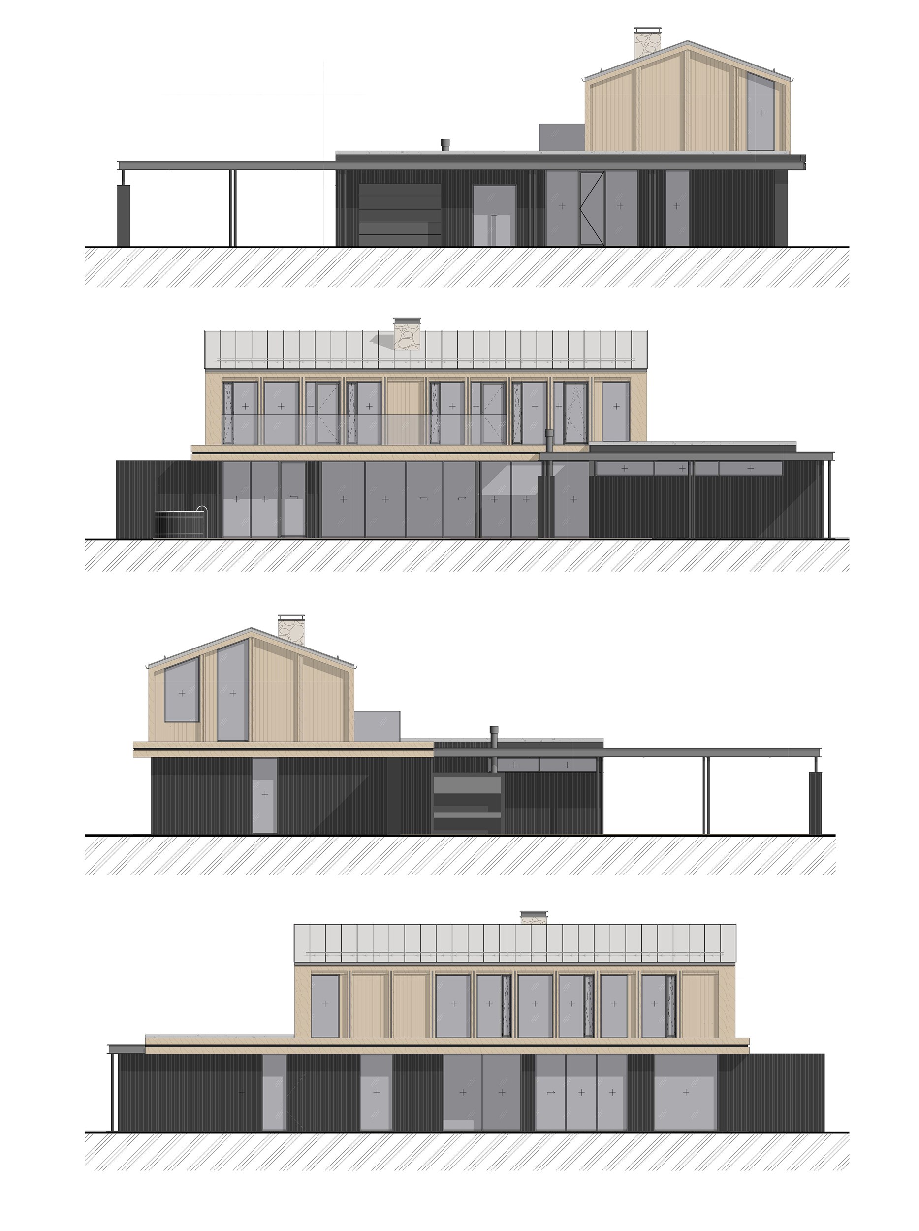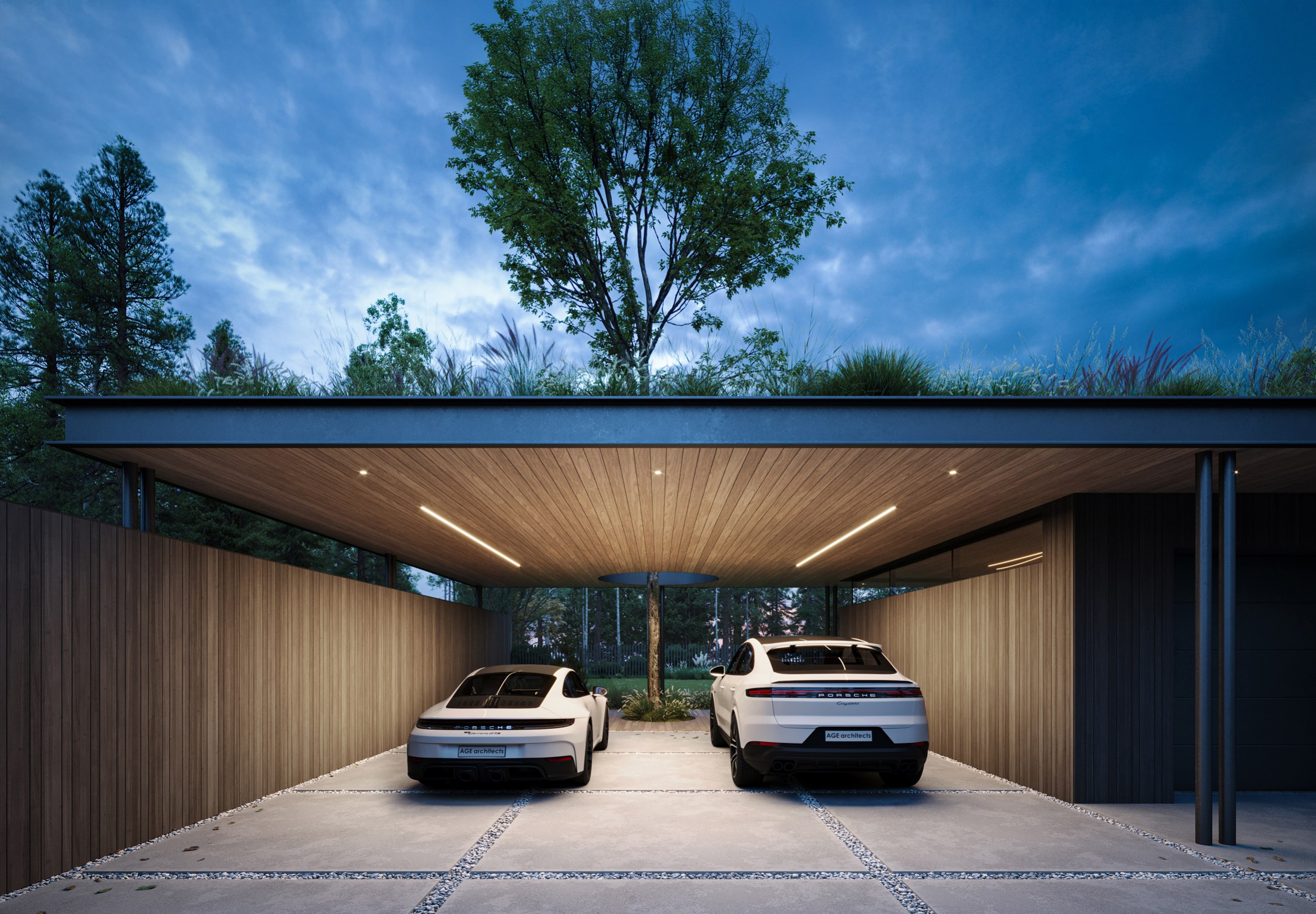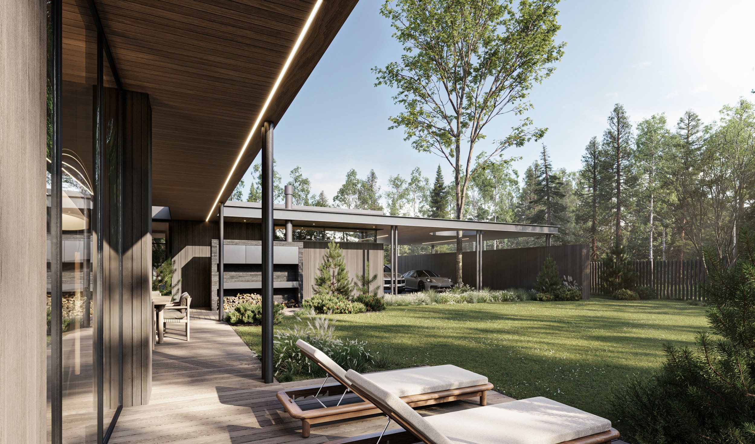 Мы отошли от классической формы фахверка в пользу силуэта барн-хауса, что сделало архитектуру более лаконичной и монолитной. Логика конструктивных решений подчёркивает горизонтальную динамику дома: в основной деревянной части акцентирована массивная сдвоенная балка, тогда как в зоне навесов для автомобиля использован металлический пояс, создающий ощущение лёгкости и технологичности. Этот баланс материалов усиливает визуальное разделение функций, придавая архитектуре цельность и выразительность.