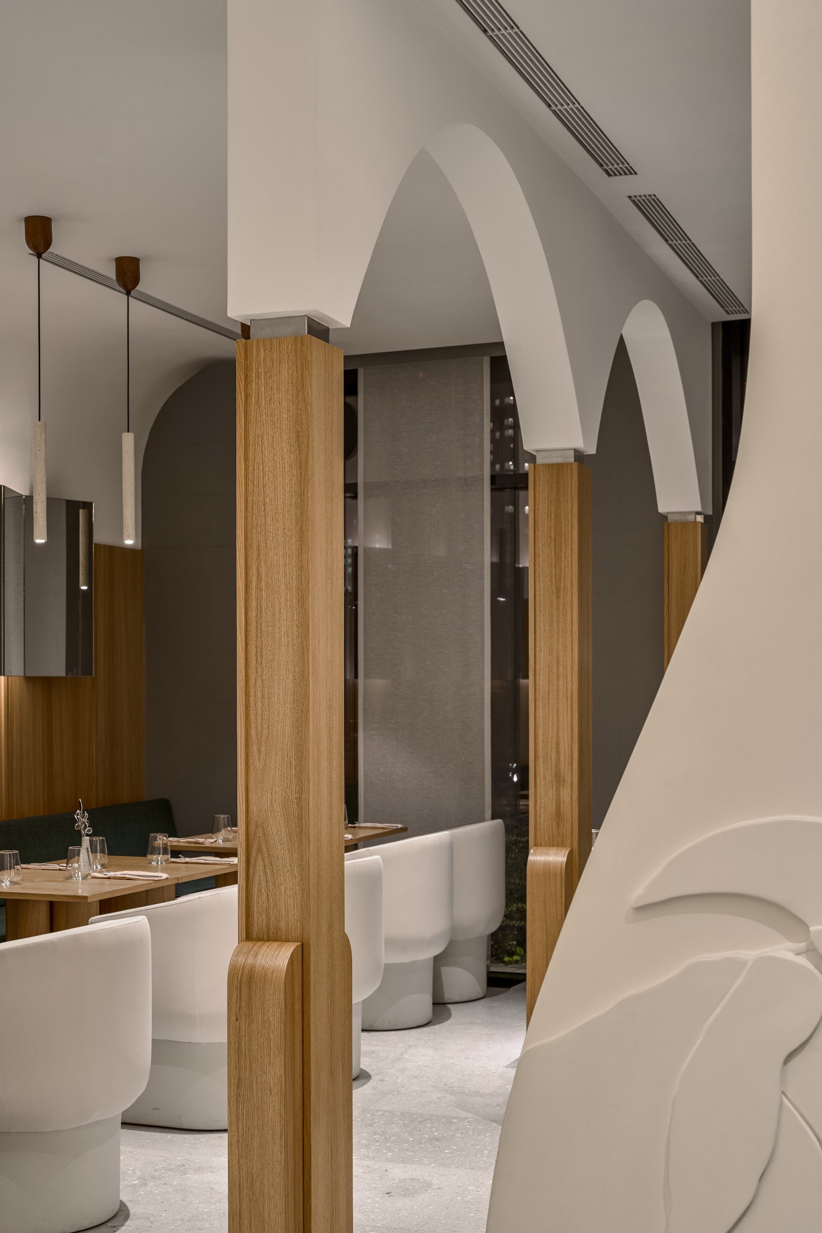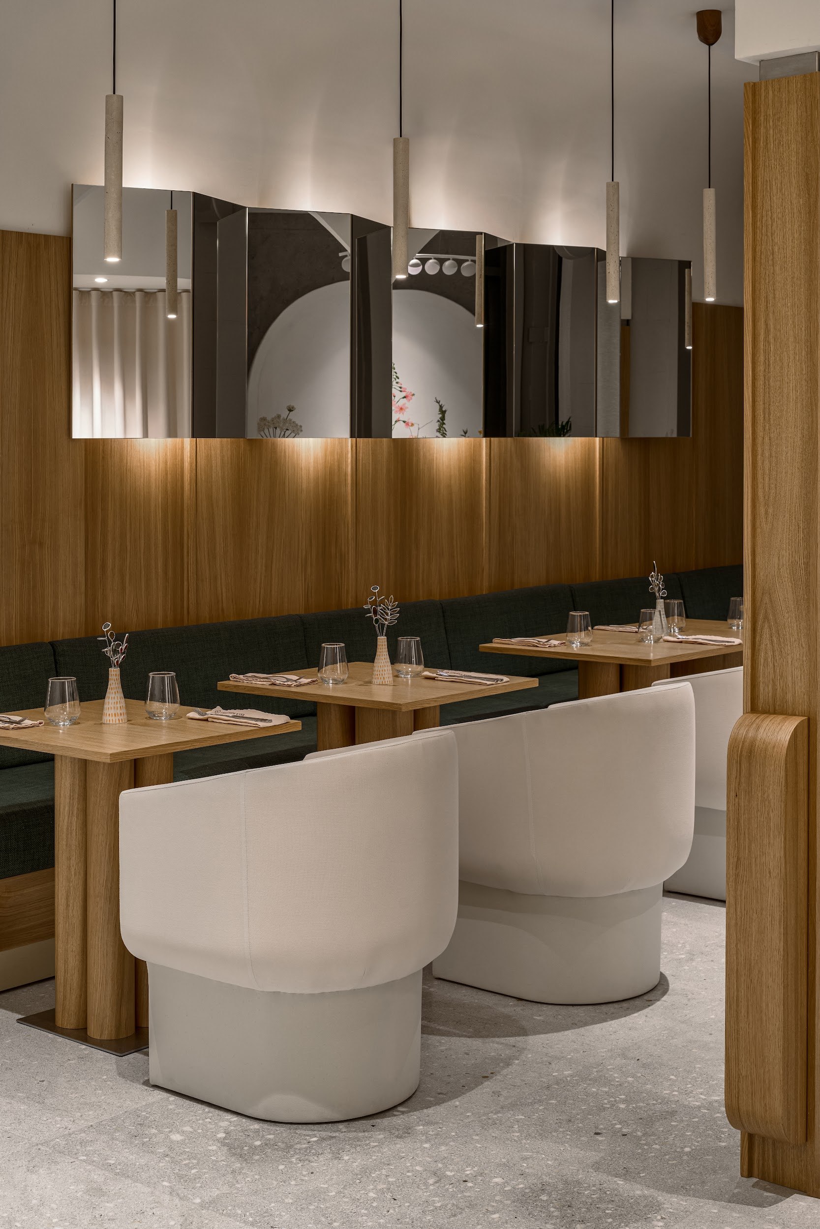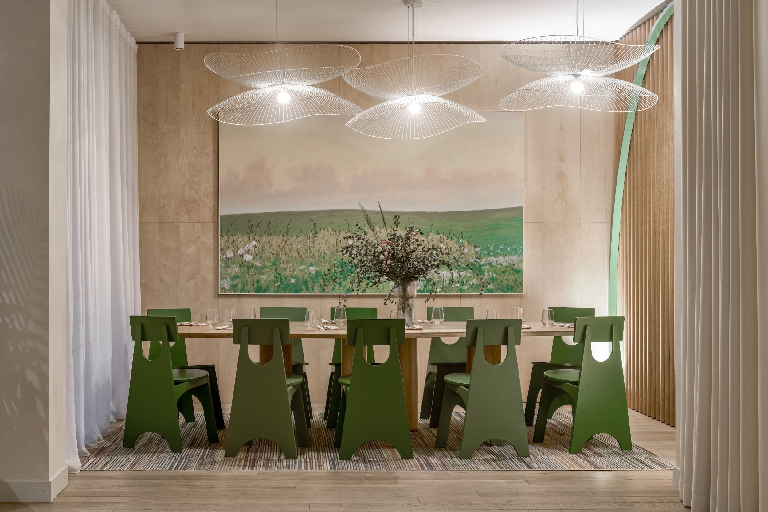 В реализации были использованы премиальные материалы и оборудование от международных брендов: мебель Sancal, Pedrali; освещение Artemide; акустические системы Felt Touch. Все элементы – от кухонного блока до акустических панелей – были бесшовно интегрированы в целостное архитектурное решение.