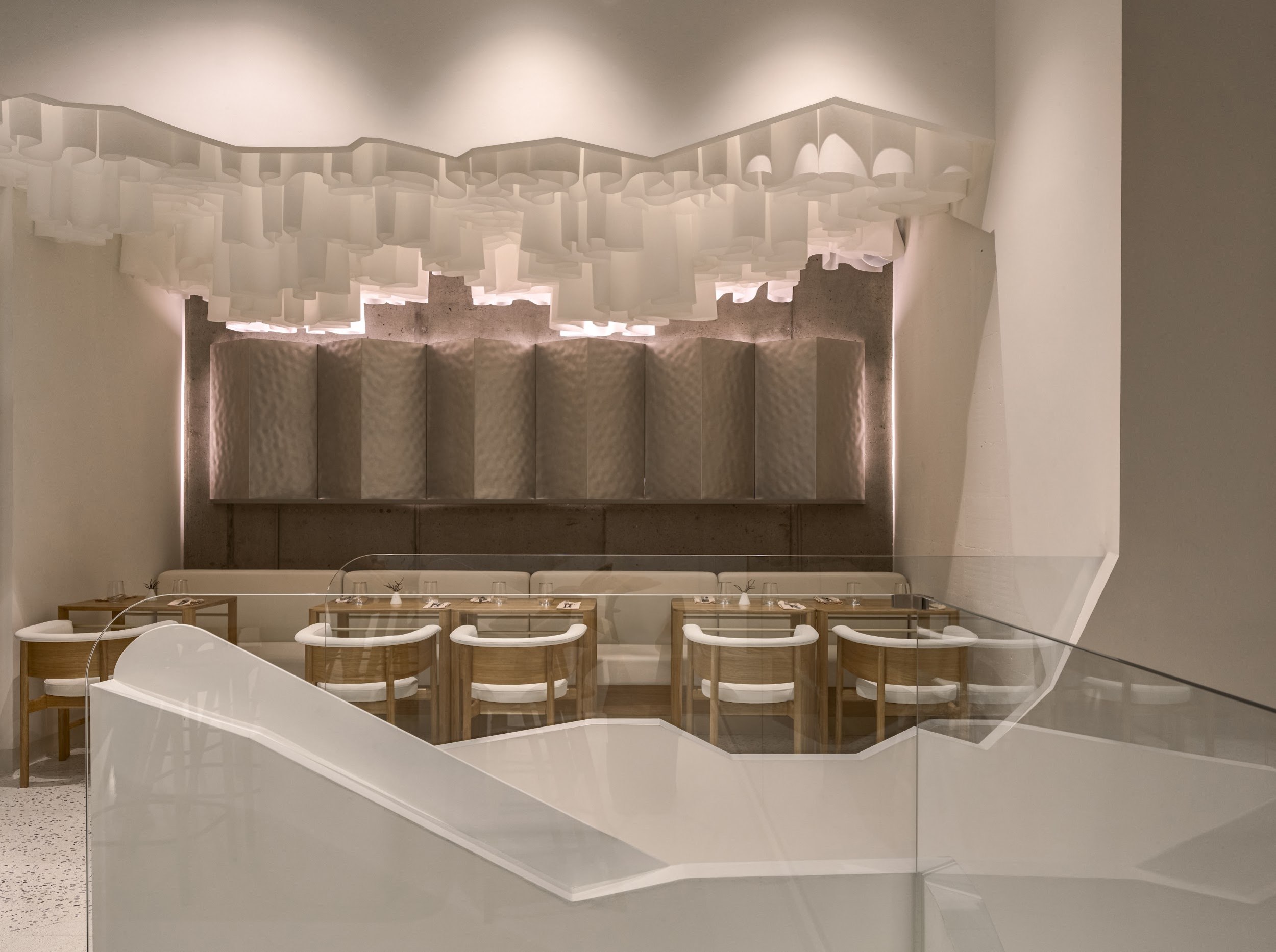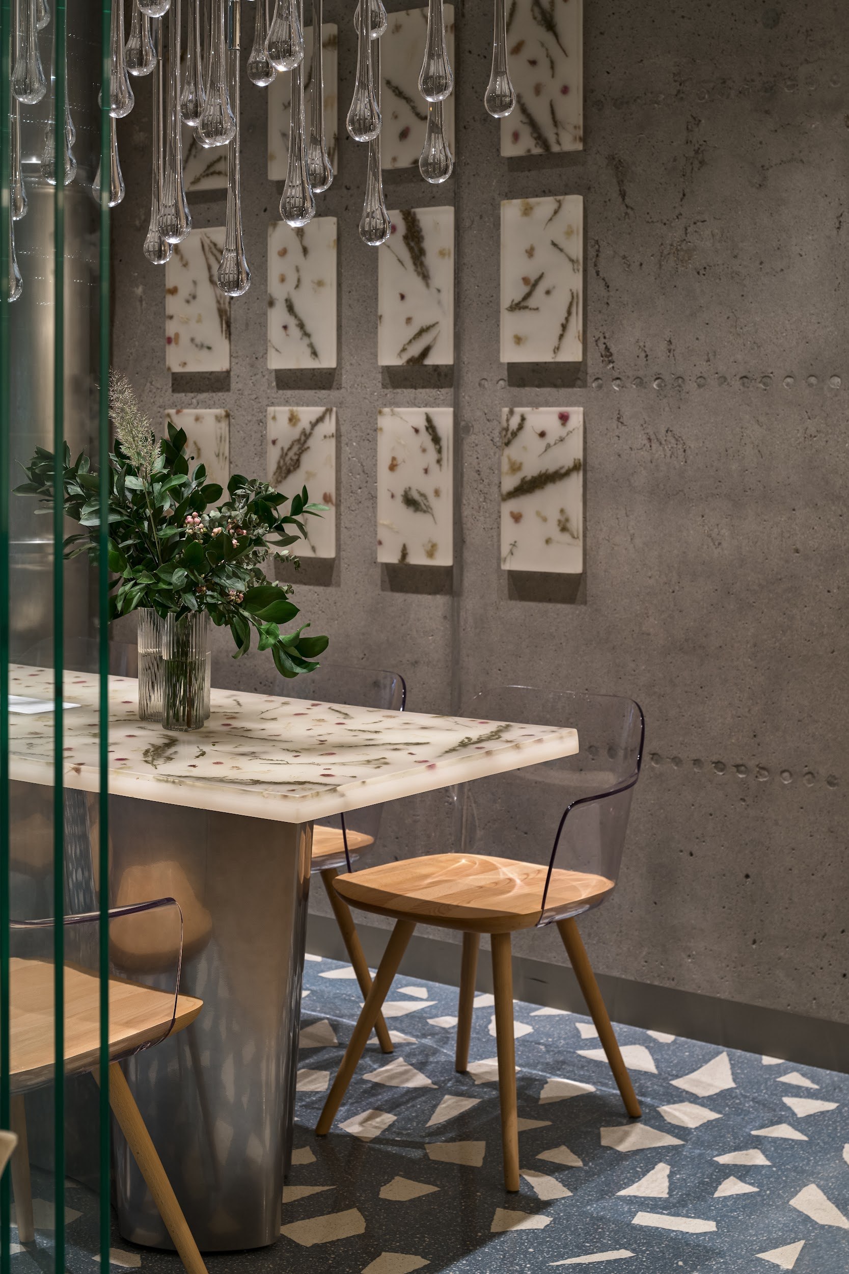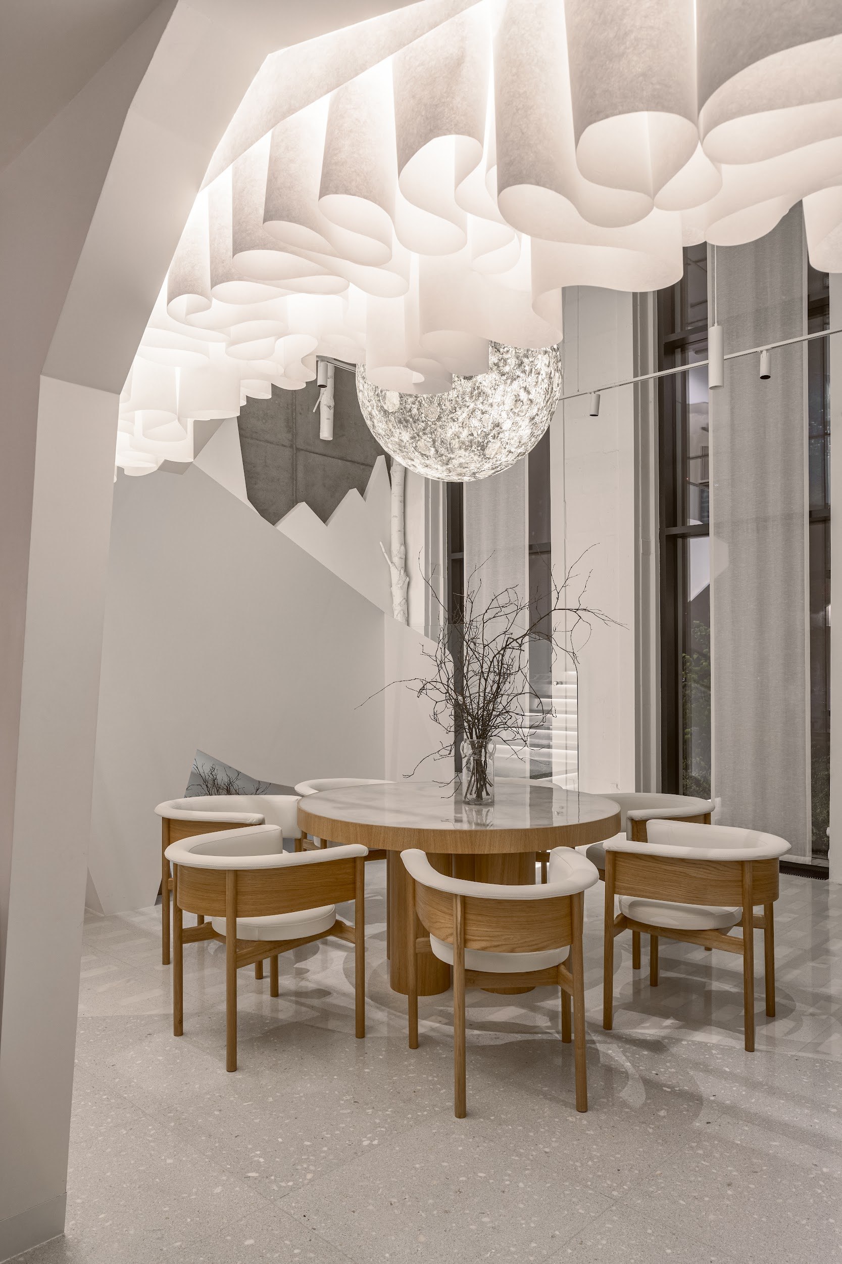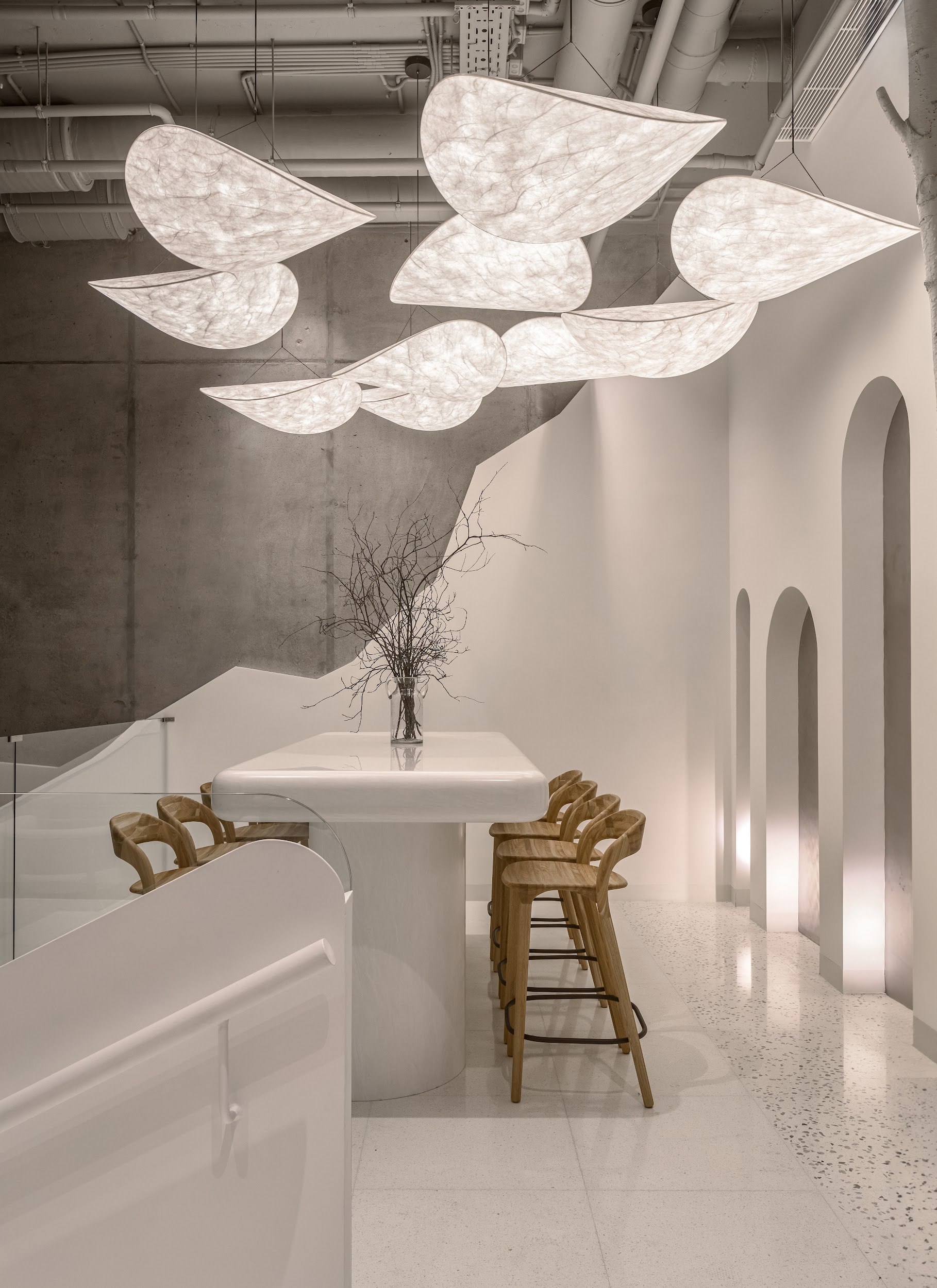 Центральной концепцией проекта стало создание «энергичного» пространства, материализующего командный дух и интеллектуальный потенциал технологической компании. Эта идея нашла воплощение в доминирующем элементе интерьера – масштабной световой инсталляции на потолке. Динамичная композиция, собранная из сотен индивидуальных кубов акрилового стекла, напоминает pulsirajuću traku (пульсирующую ленту). Белые кубы излучают свет, а глянцевые голубые отражают и преломляют его, создавая сложную, живую оптическую среду. Этот художественный жест символизирует единство и силу коллектива, где каждая индивидуальность вносит вклад в общее сияние.