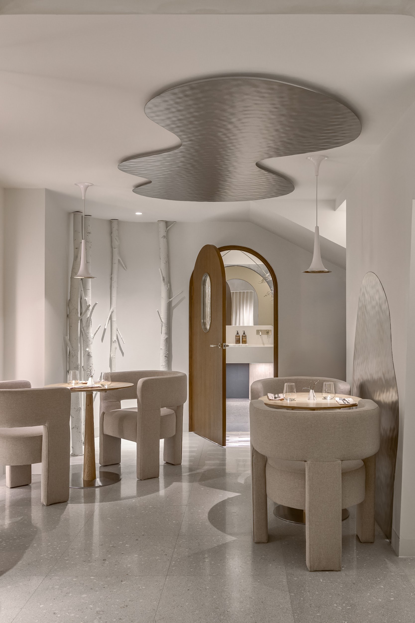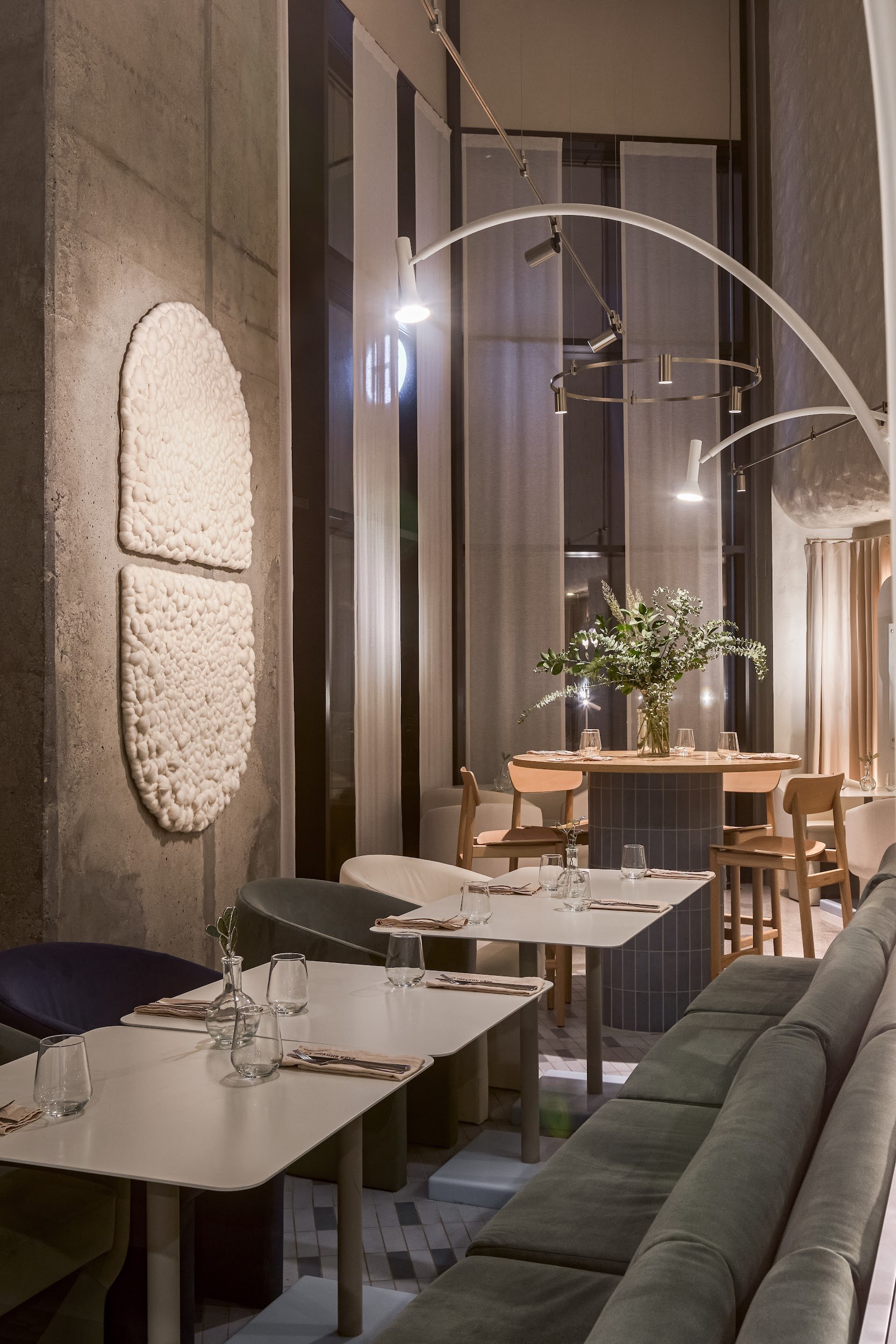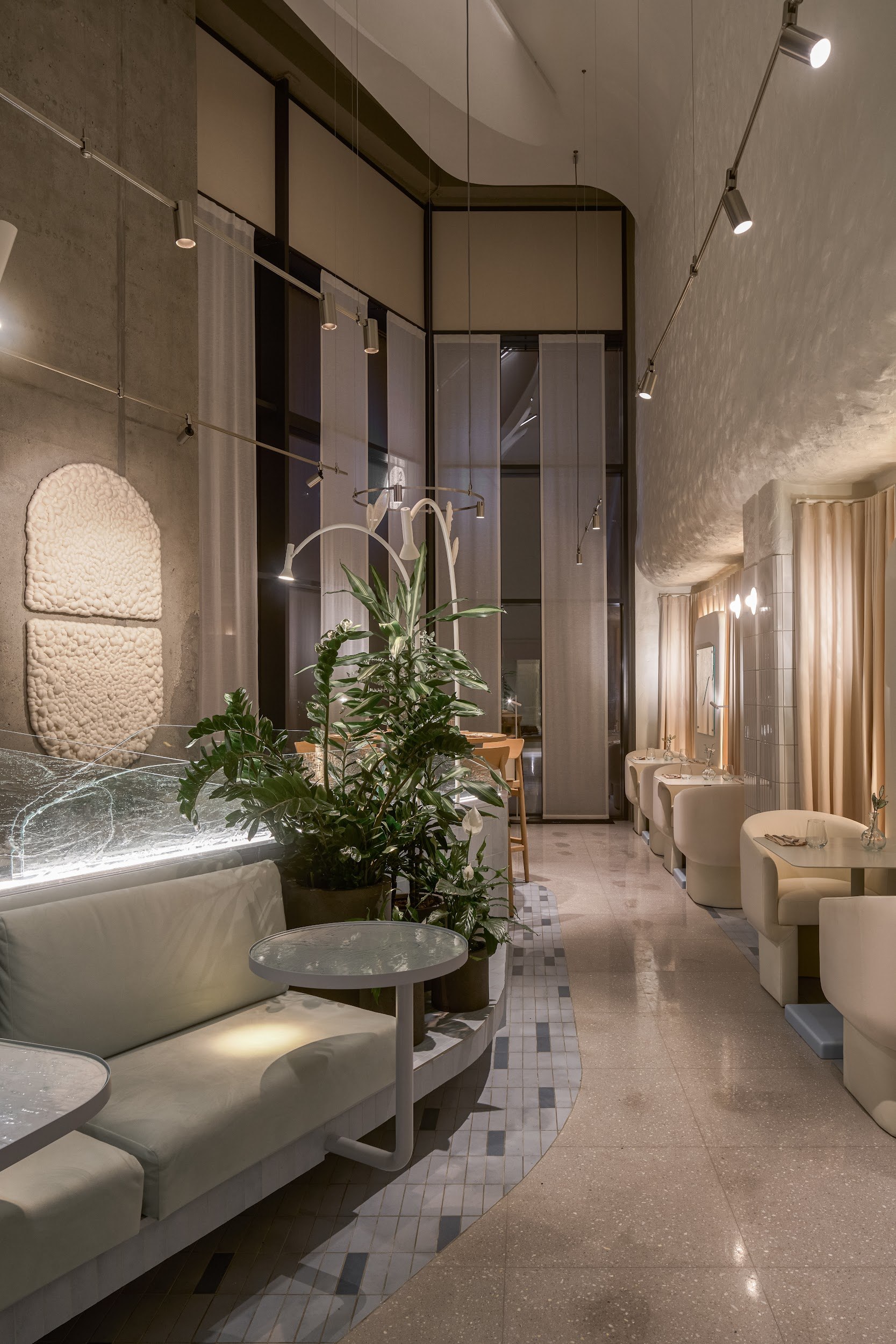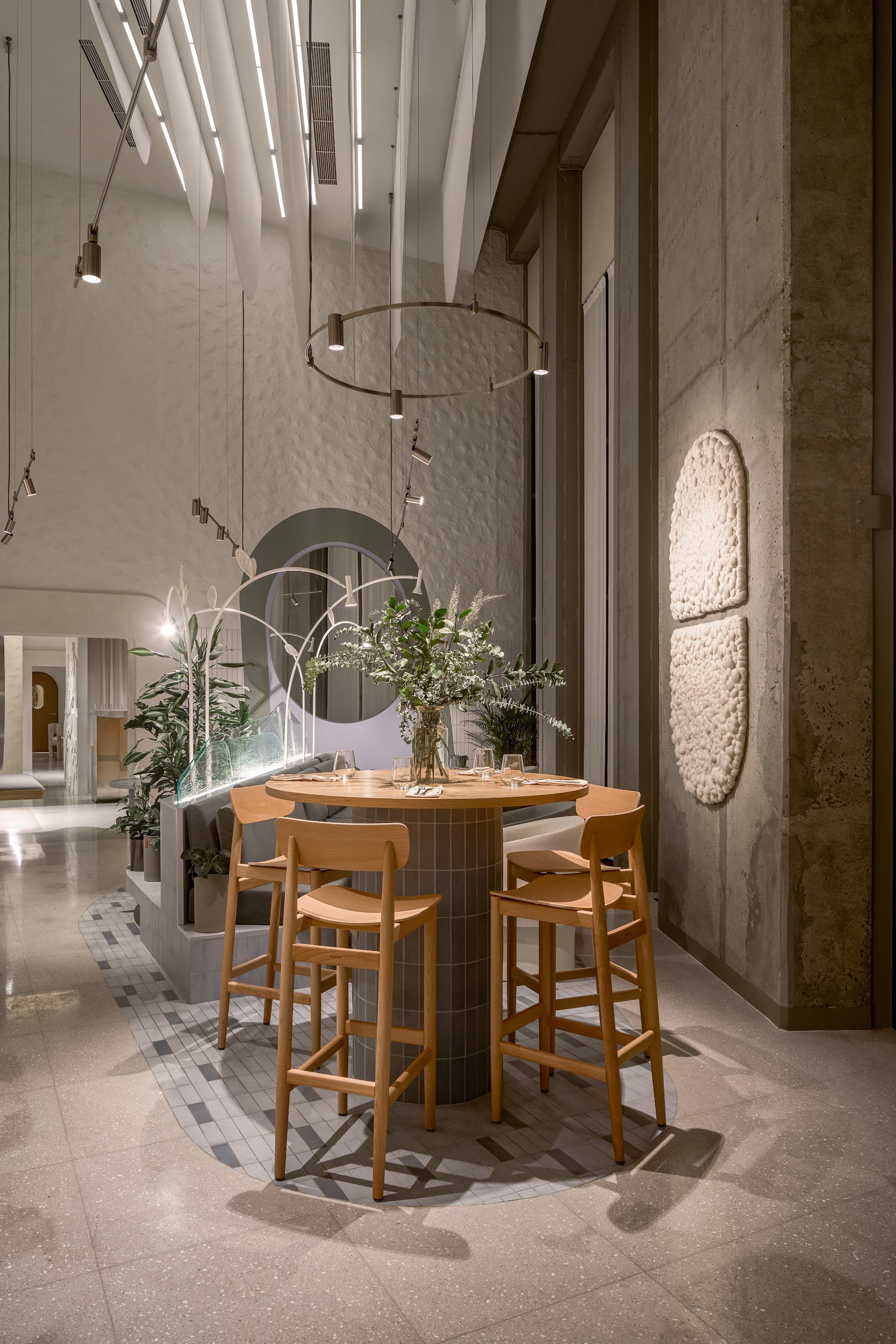 Архитектурный нарратив дополняют два знаковых элемента: цилиндрическая барная стойка, ставшая точкой неформальной коммуникации, и монументальный безграничный библиотечный стеллаж высотой 4,5 метра, огибающий периметр. Стеллаж вносит ноту академической серьезности и создает камерную атмосферу для уединенной работы. Панорамное остекление по всему периметру активно включает городской пейзаж Белграда в интерьер, делая его динамичным фоном для внутренней жизни центра.