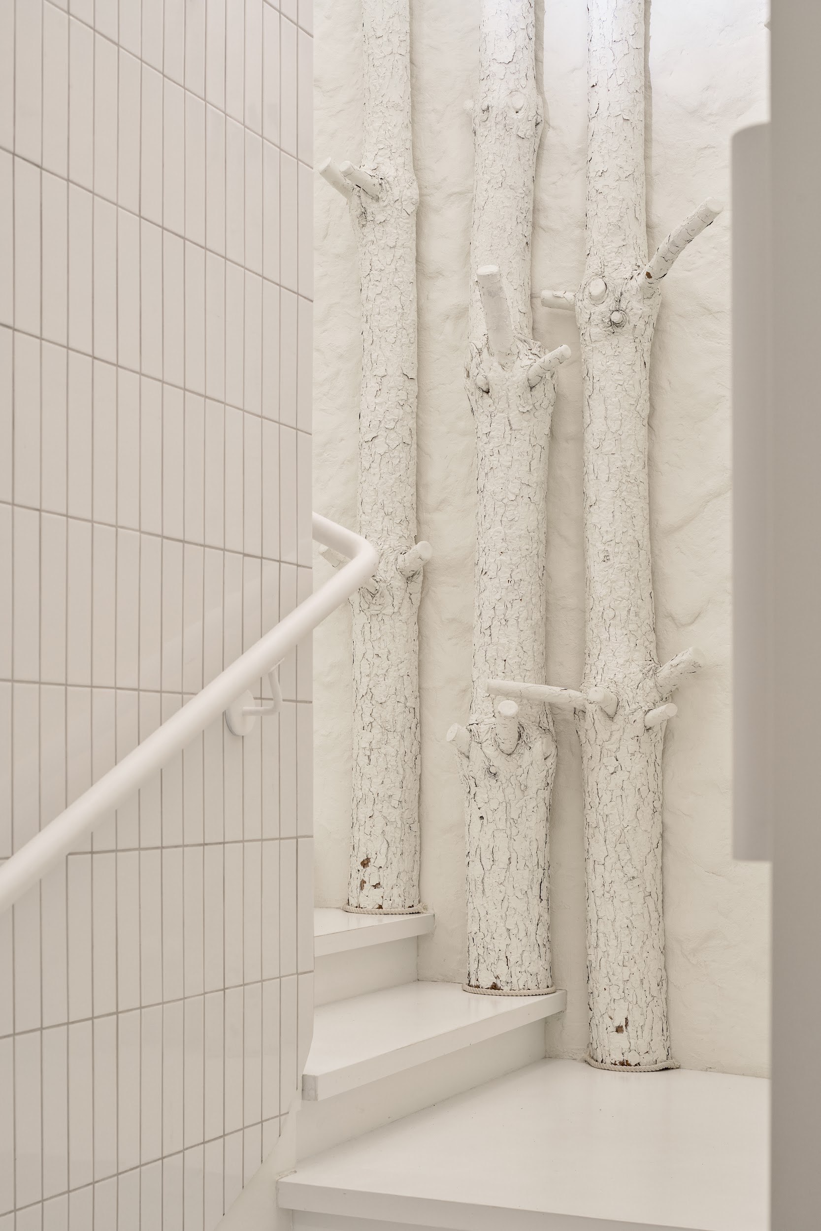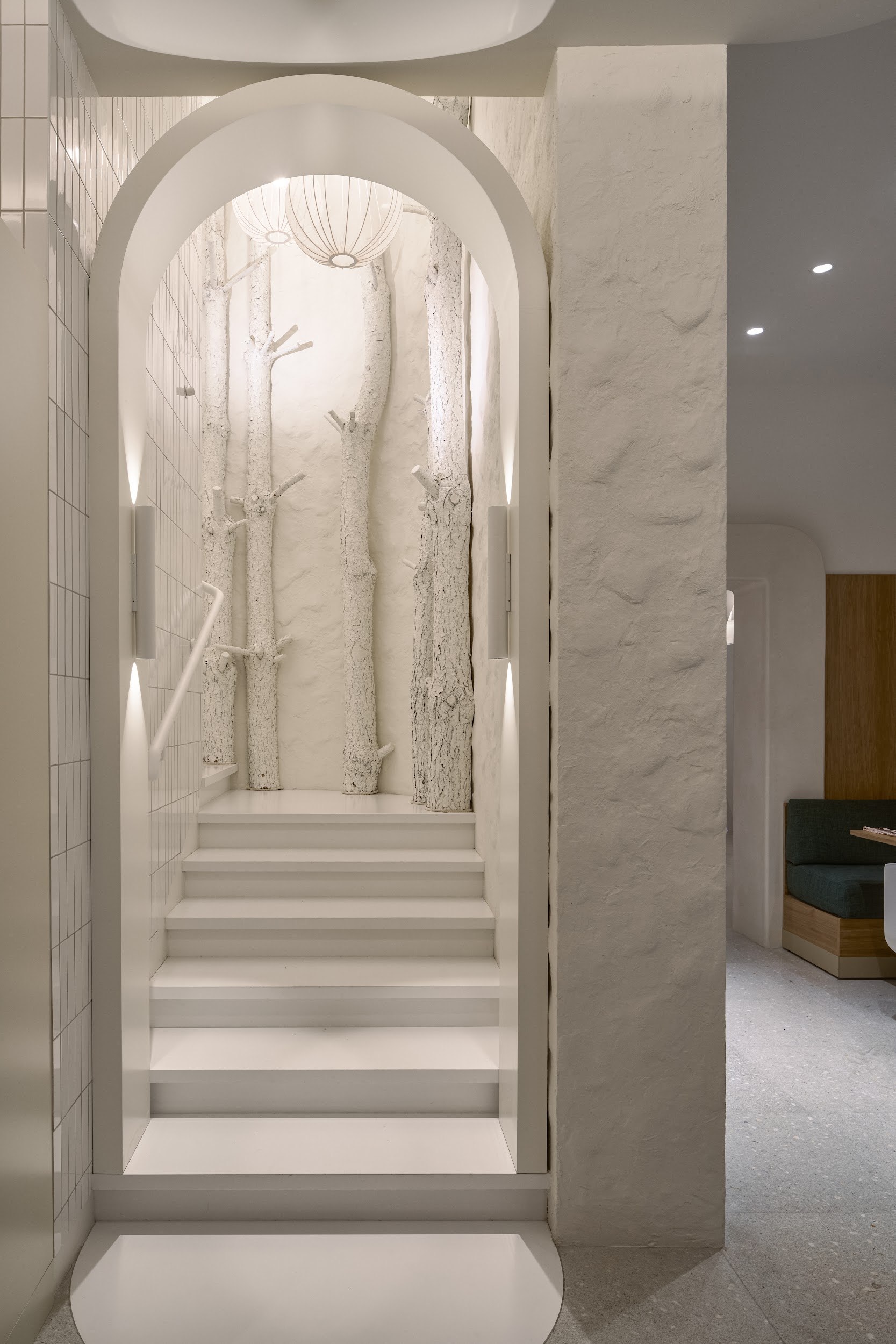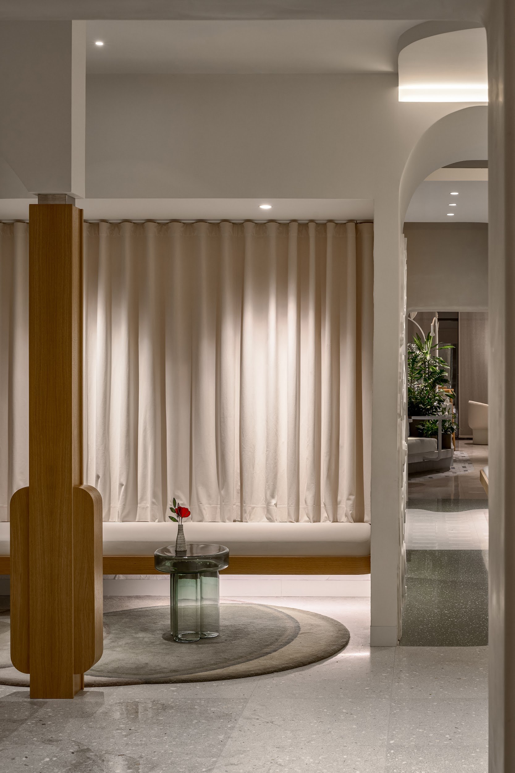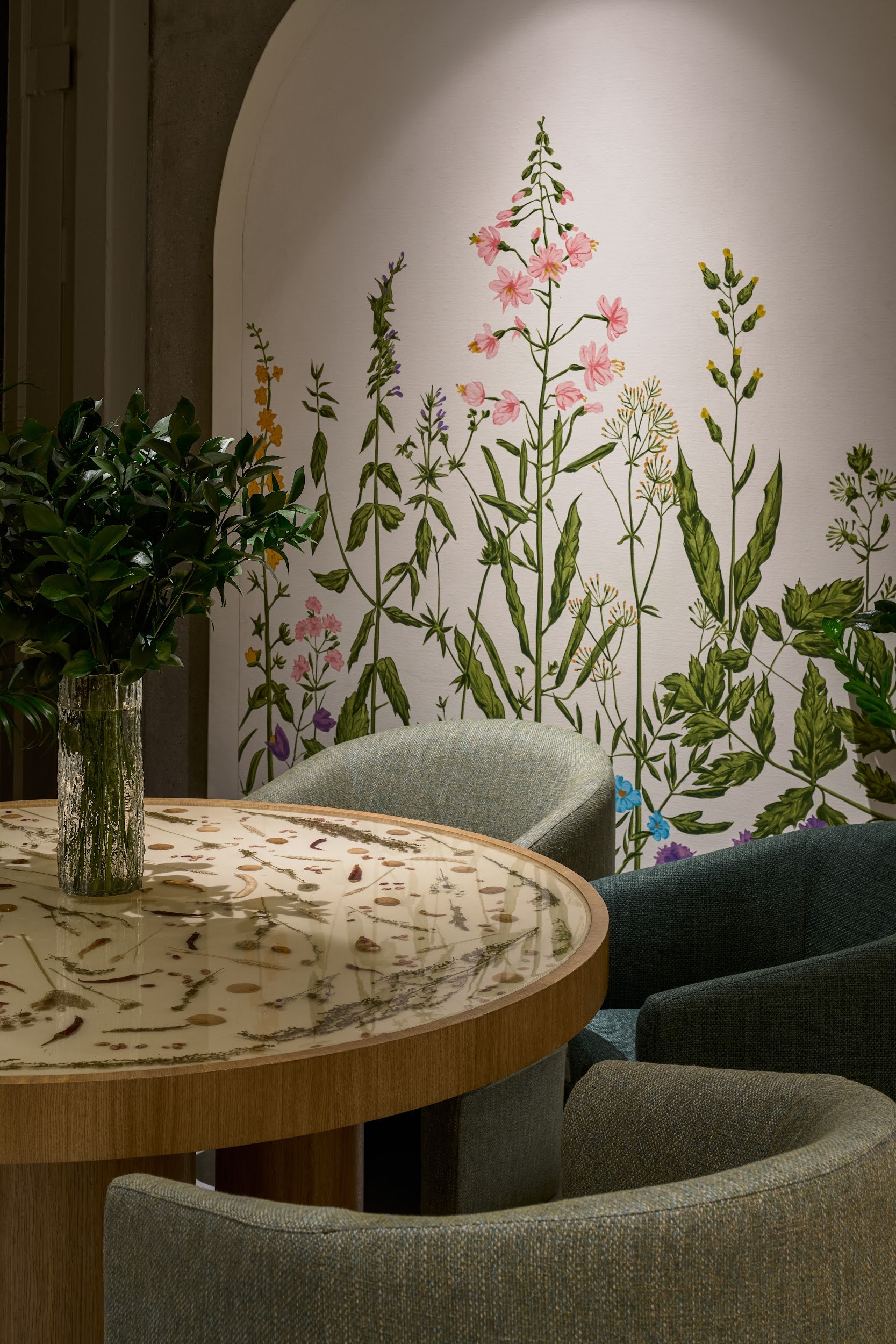 Архитектурный нарратив дополняют два знаковых элемента: цилиндрическая барная стойка, ставшая точкой неформальной коммуникации, и монументальный безграничный библиотечный стеллаж высотой 4,5 метра, огибающий периметр. Стеллаж вносит ноту академической серьезности и создает камерную атмосферу для уединенной работы. Панорамное остекление по всему периметру активно включает городской пейзаж Белграда в интерьер, делая его динамичным фоном для внутренней жизни центра.