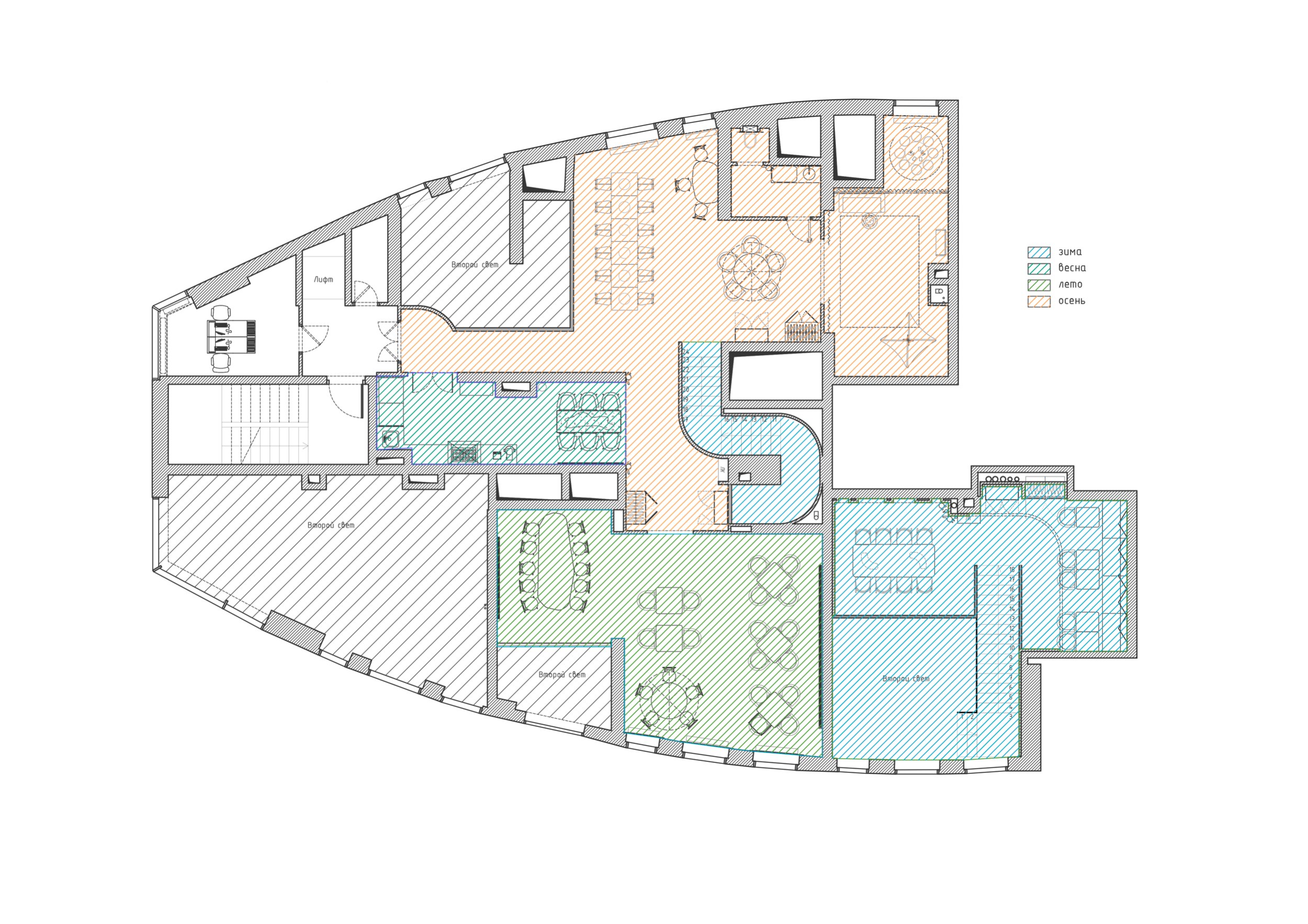 Функциональное ядро пространства – трансформируемый лекционный зал на 150 человек. Его сердцем стала уникальная трибуна–трансформер, механизм для которой был специально доставлен из Словении. При необходимости проведения мероприятий в свободном формате уровни с сиденьями компактно складываются у стены, полностью освобождая центральную площадь. Это инженерное решение обеспечило пространству максимальную гибкость и мультифункциональность.