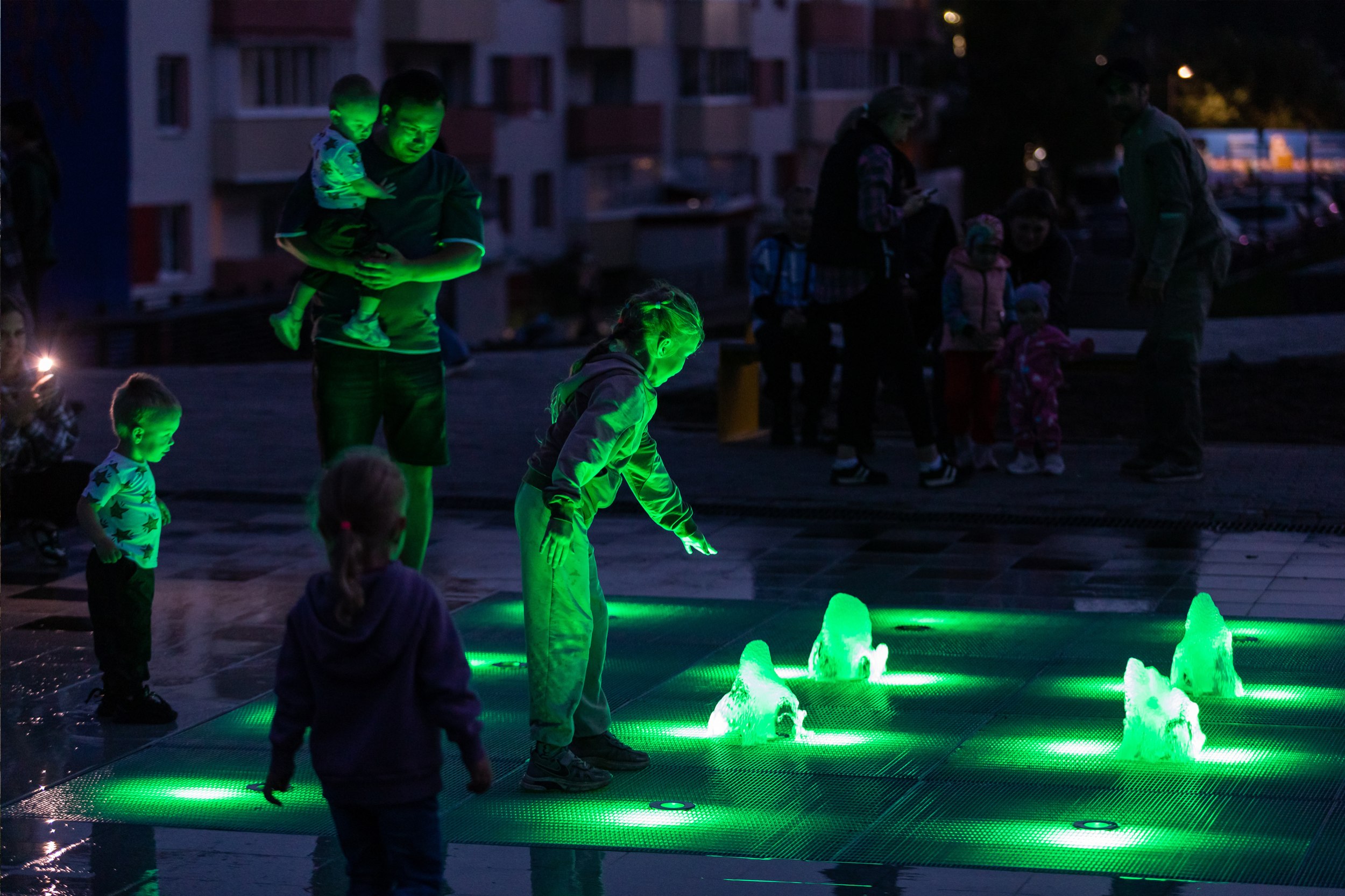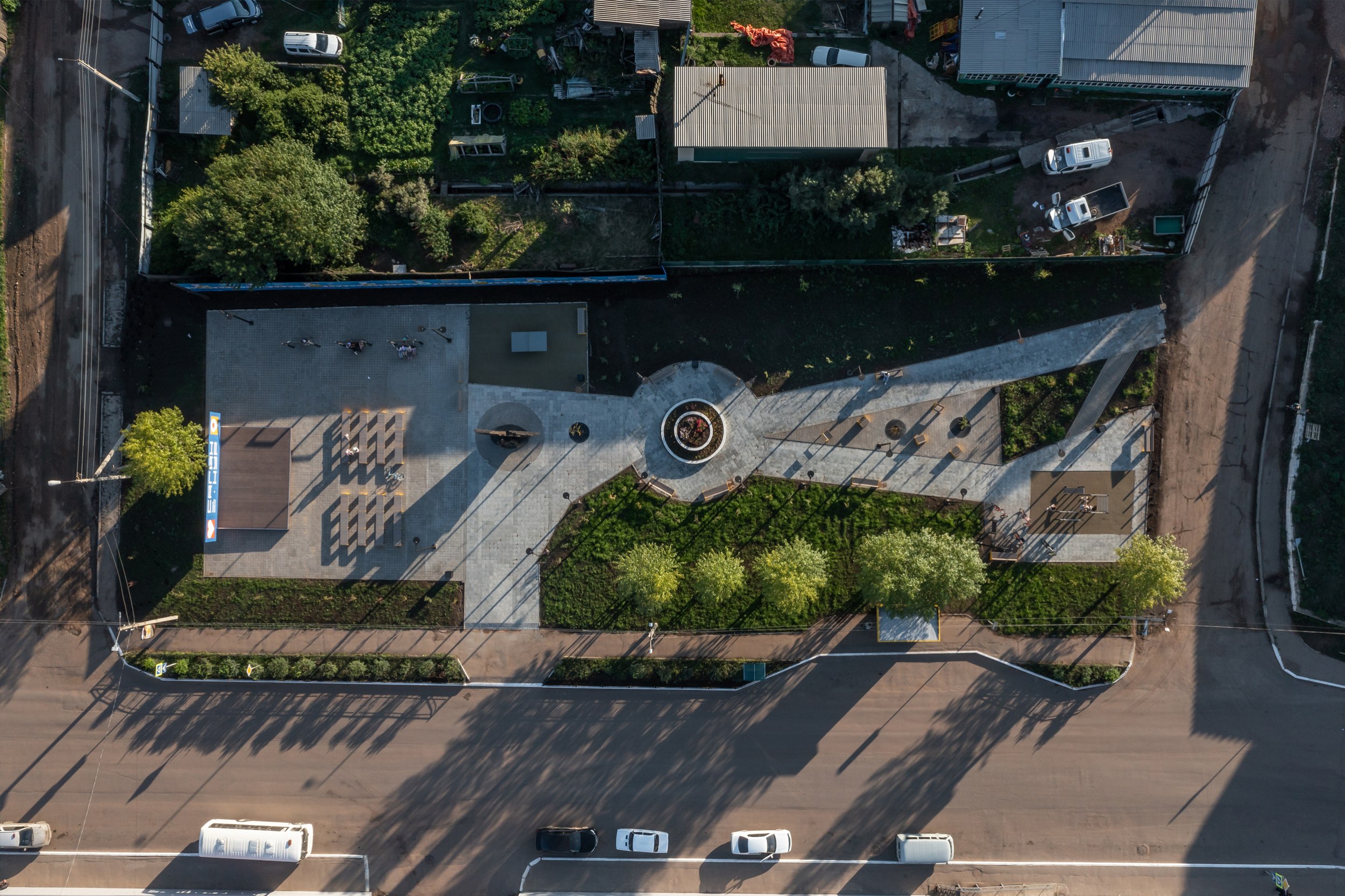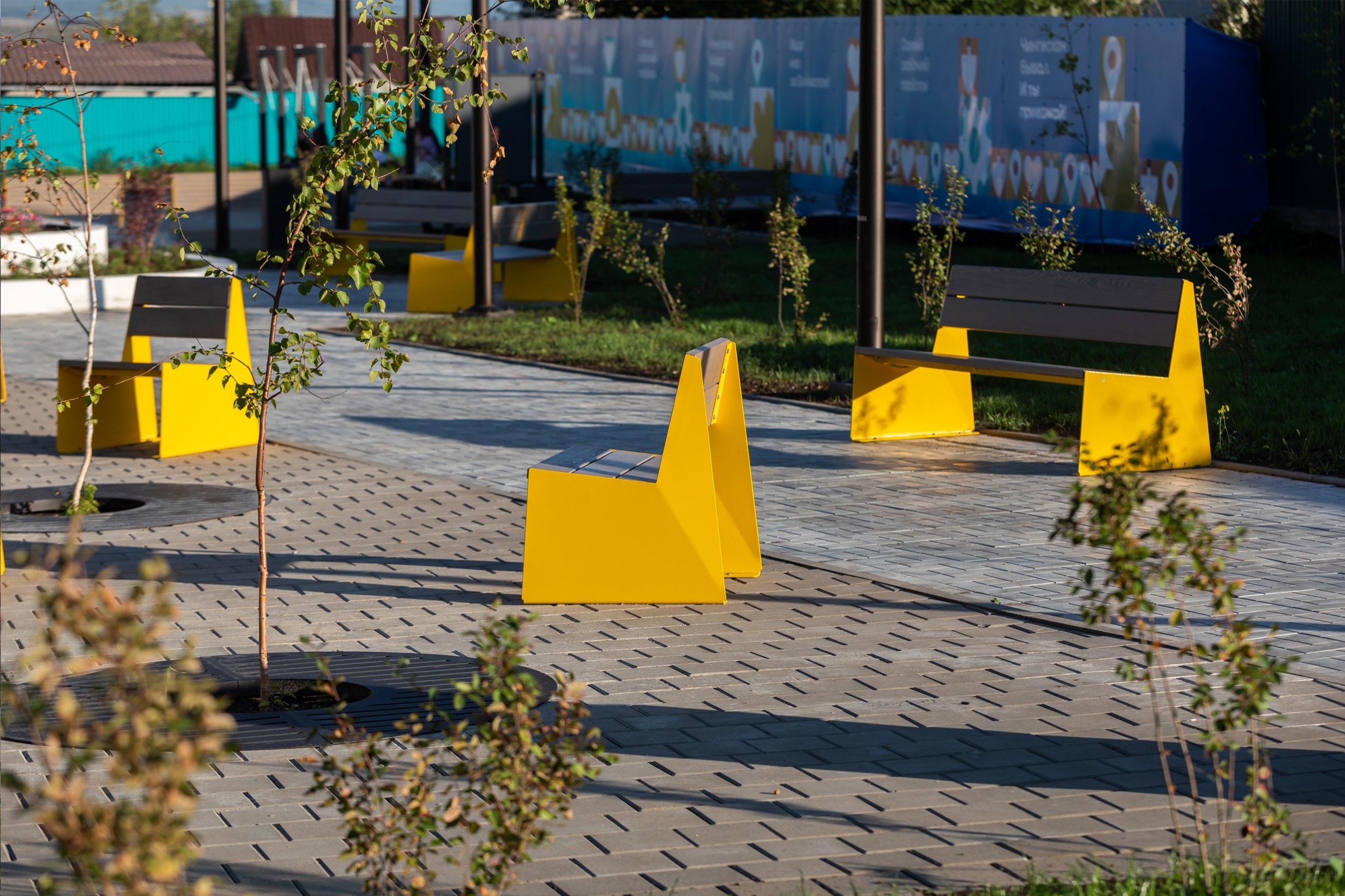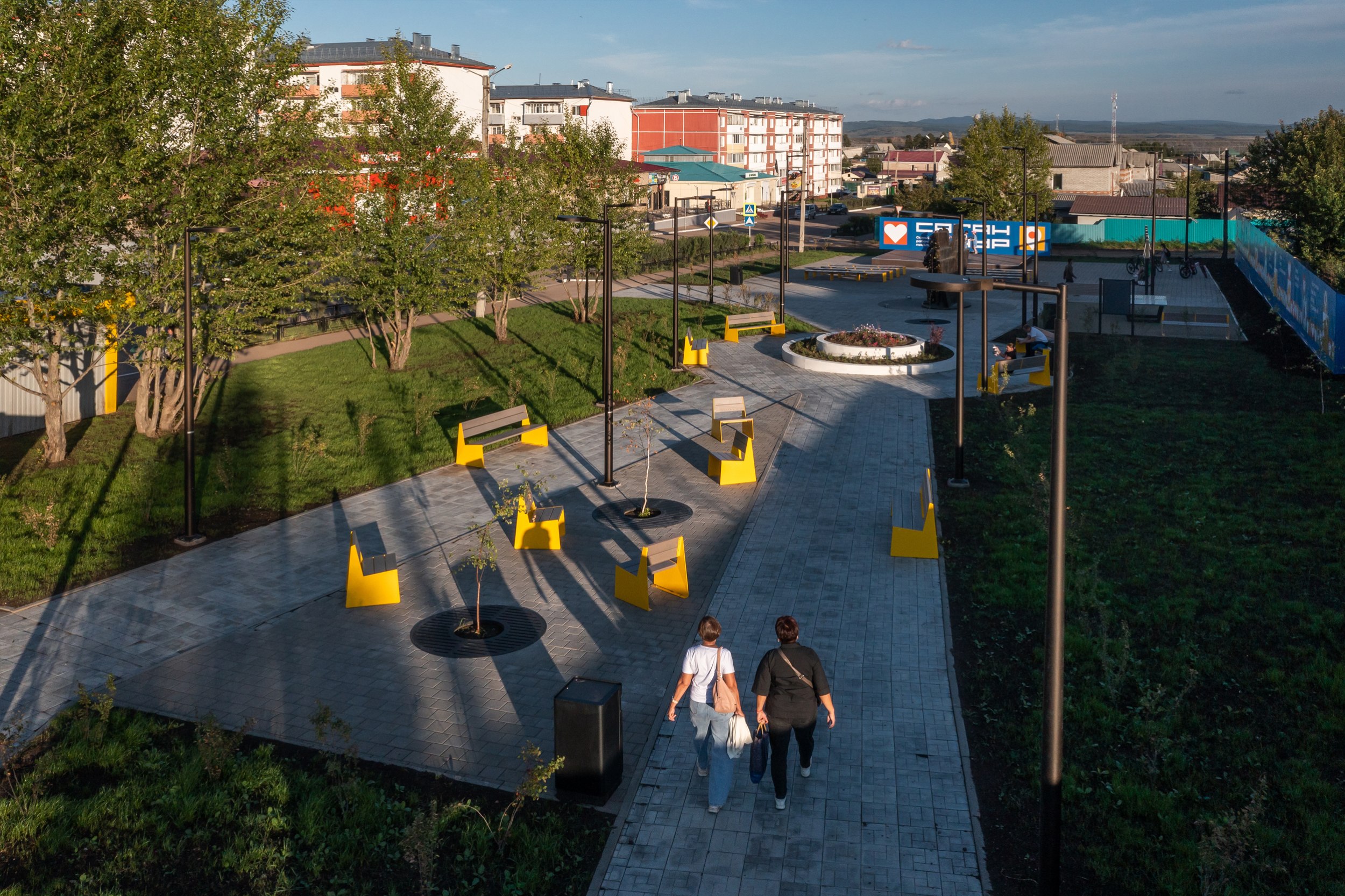 На центральной площади мы создали полноценный хаб для коммуникаций. Вместо пустой асфальтированной площадки здесь появилась современная сцена. Это место-трансформер: днем здесь можно качаться на парковых качелях, а вечером – смотреть кино под открытым небом или проводить локальные фестивали.