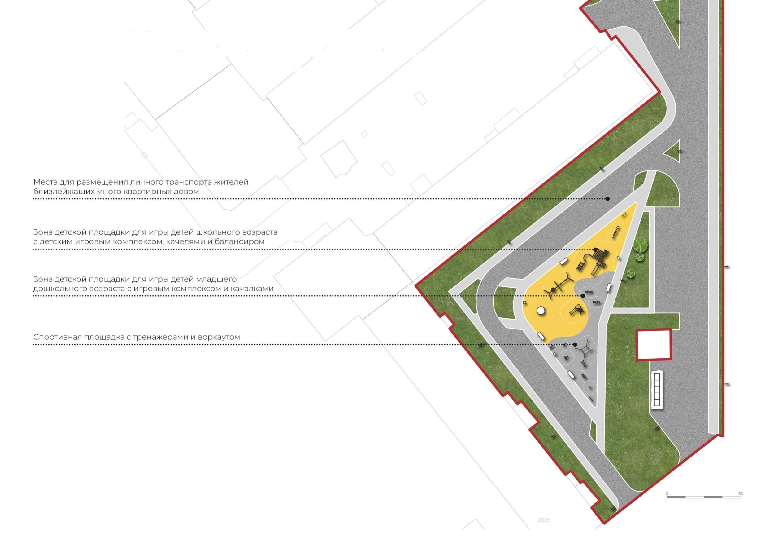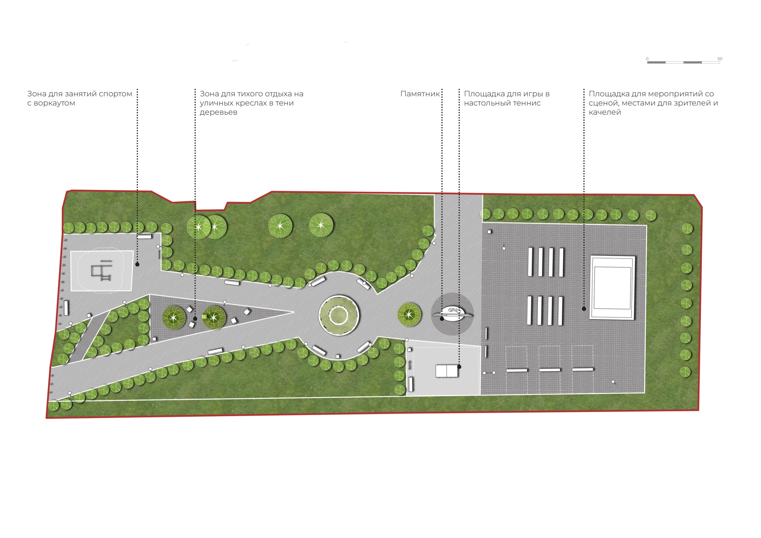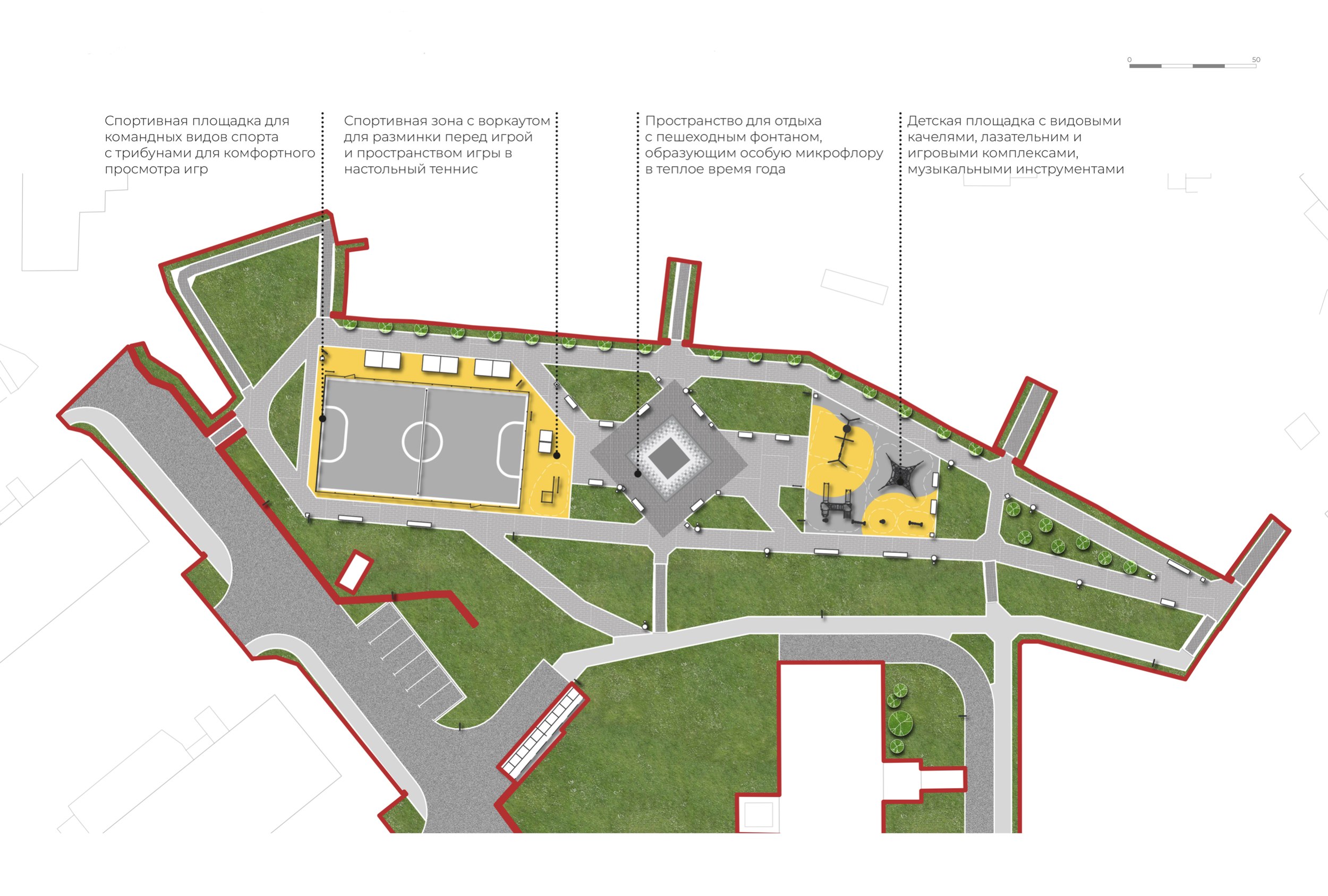 Мы отказались от идеи декоративного благоустройства в пользу создания системы активных «магнитов». Весь проект строится на трех ключевых узлах.